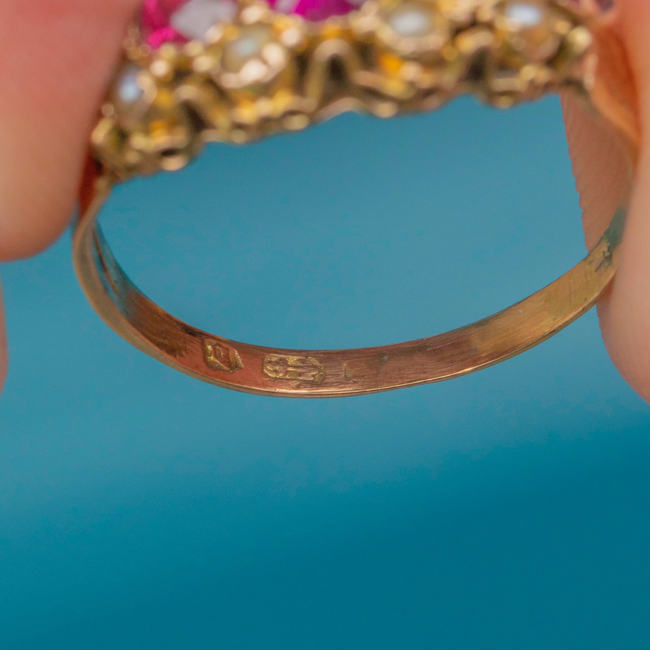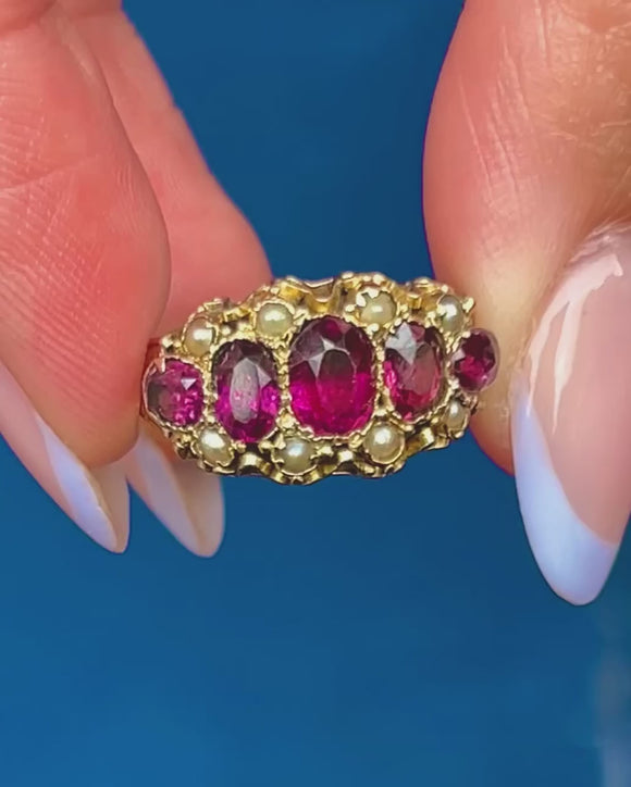 Victorian 9ct Gold Garnet Pearl Five Stone Ring, c.1878