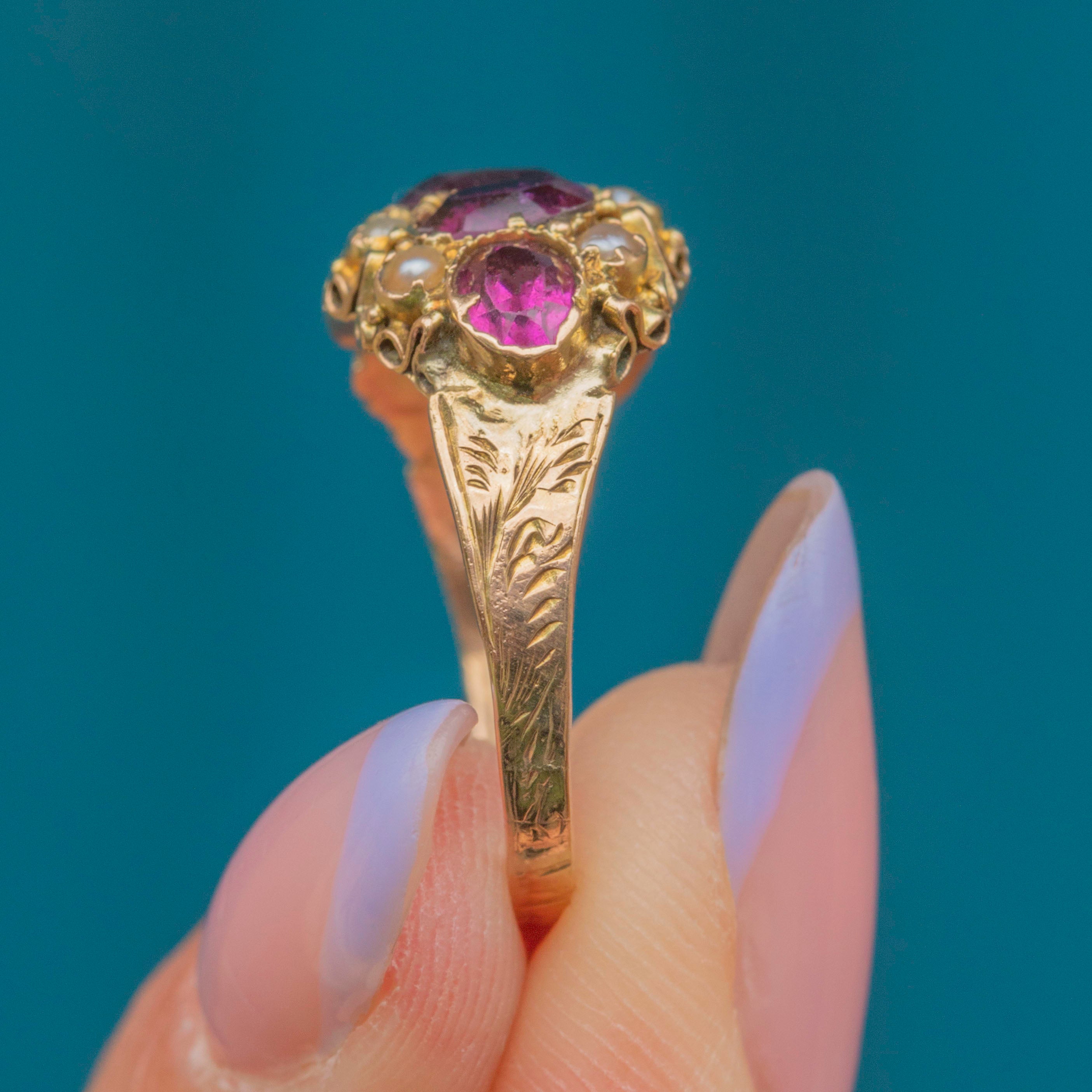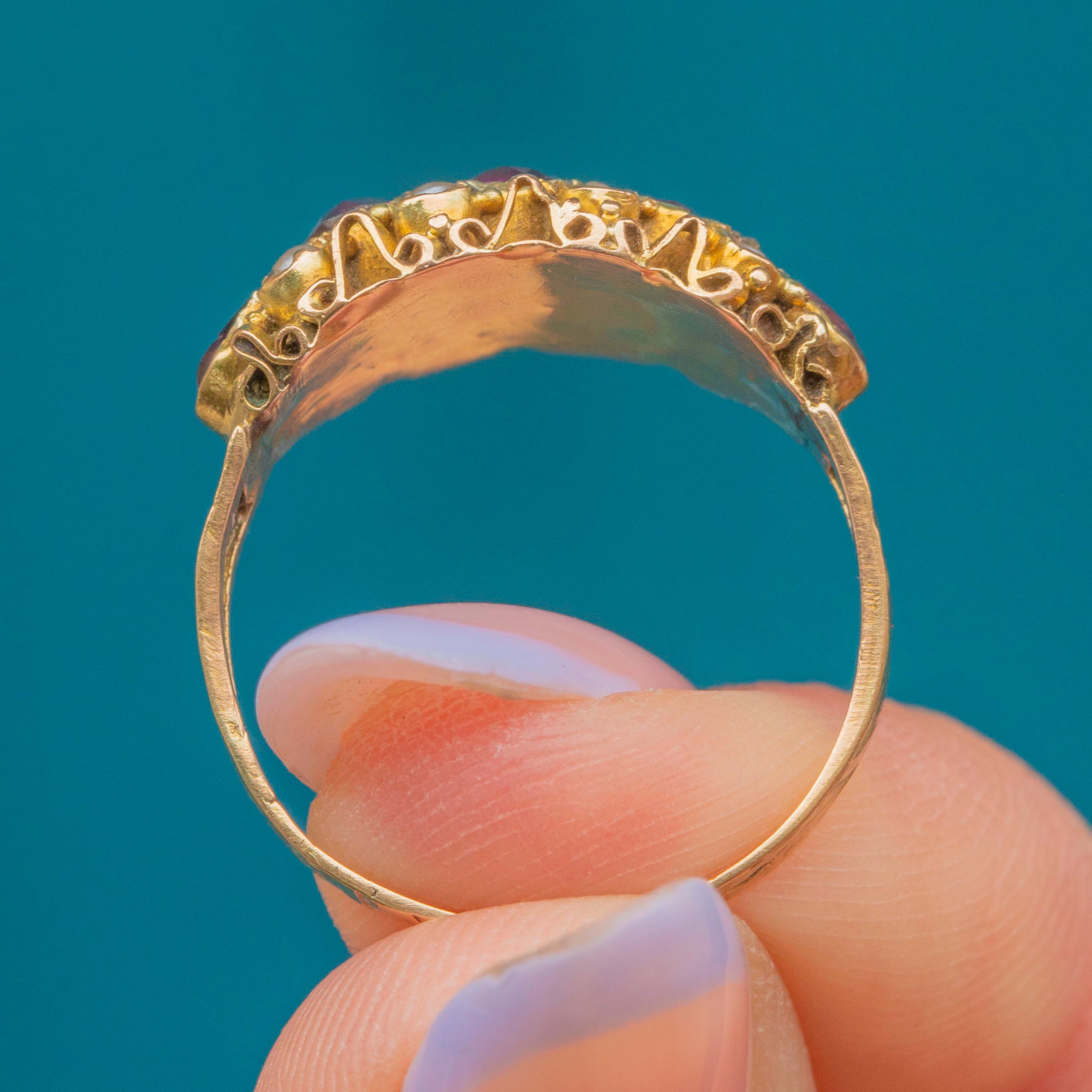 Crafted from glossy 9ct Gold, this Victorian ring flaunts five juicy grape-toned Garnets, each faceted beautifully and adorned by lustrous seed Pearls. The radiance of each gemstone is married by the warmth of their ornate 9ct Gold settings, with lavish embellishments and intricately engraved shoulders in quintessential Victorian style.