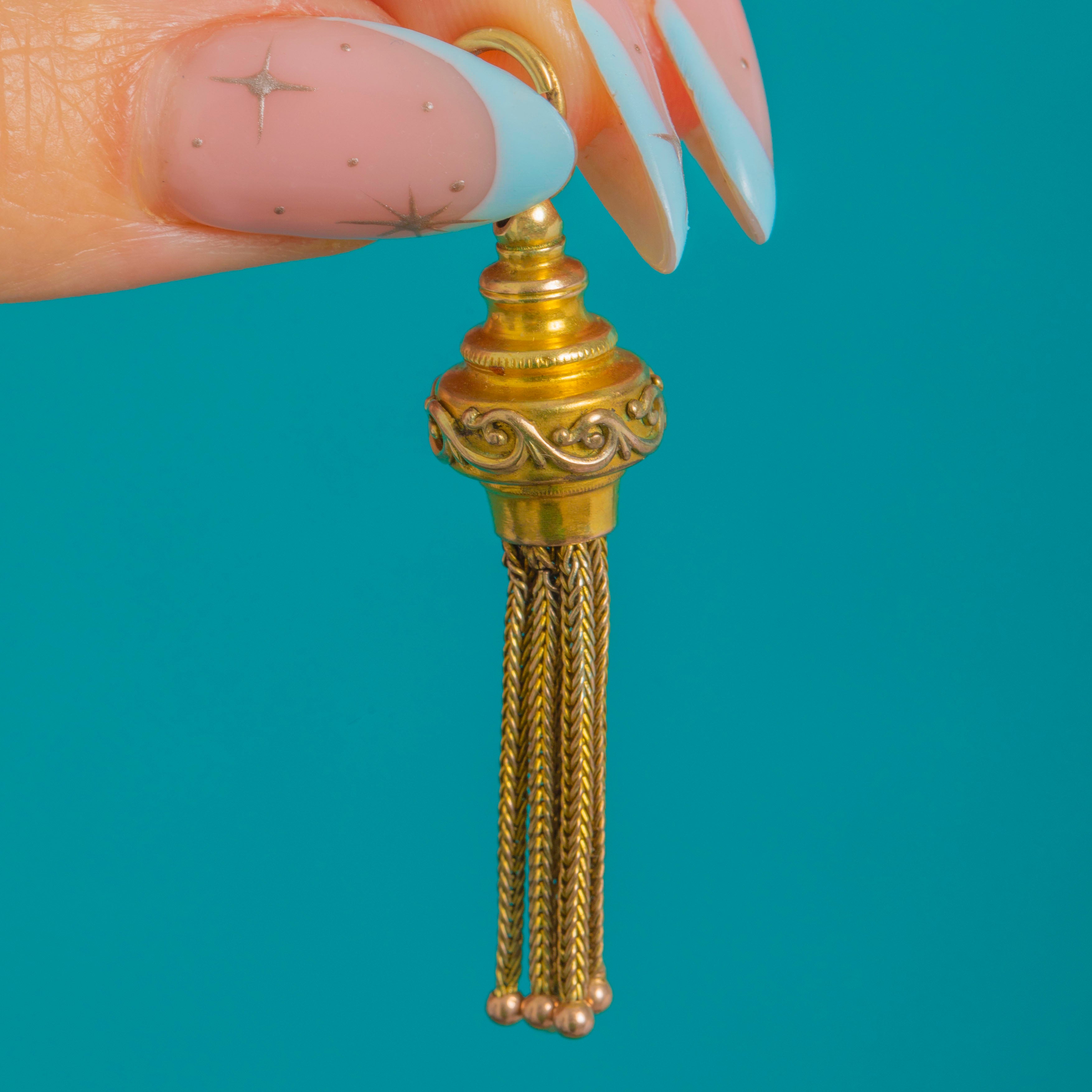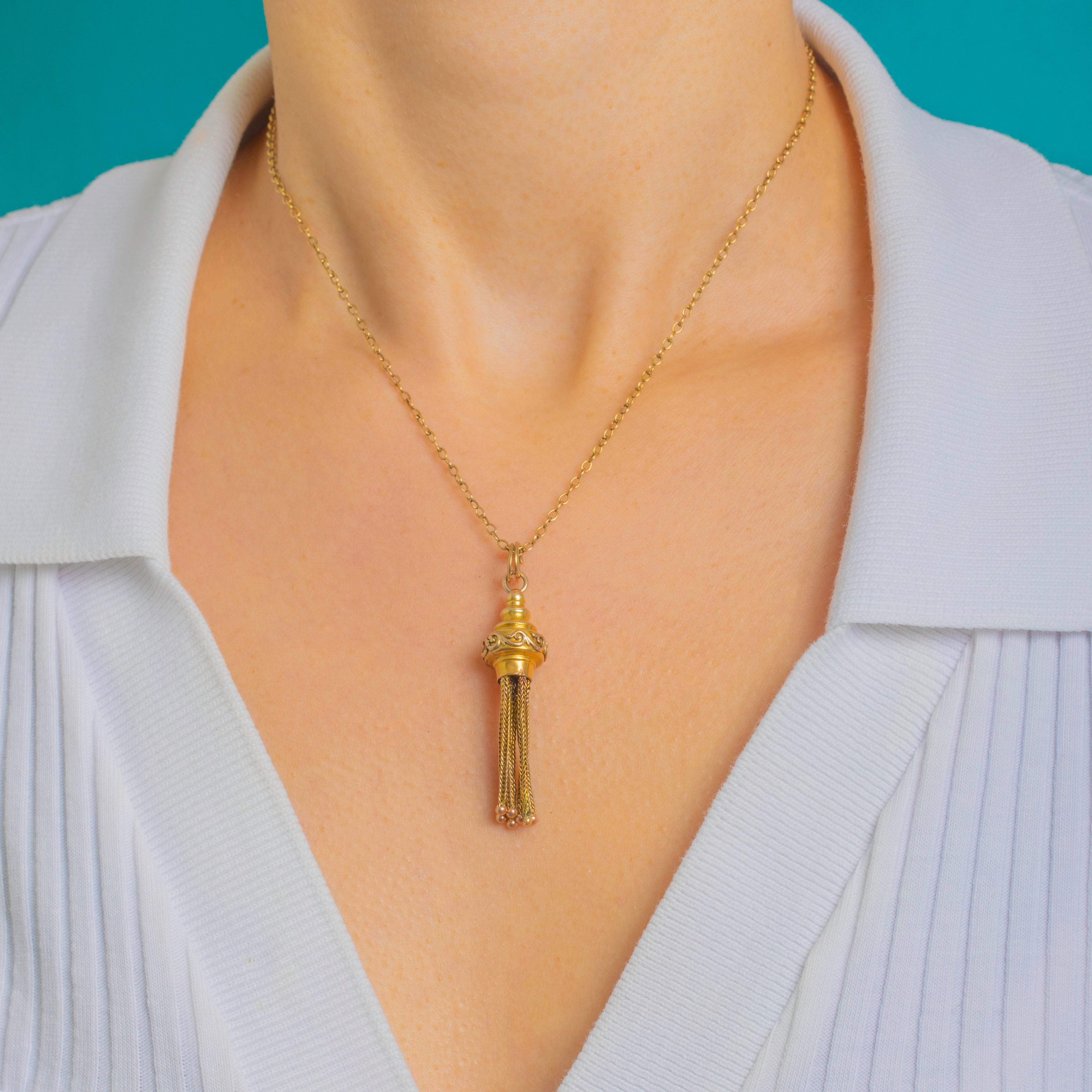 Ornate and wonderfully tactile, this Victorian 9ct Gold tassel pendant brings a flourish of movement to any look. A domed cap encircled by a scrolling foliate band and finial crowns a cascade of fine foxtail chains, each finished with a delicate beaded terminal for elegant sway and shimmer.