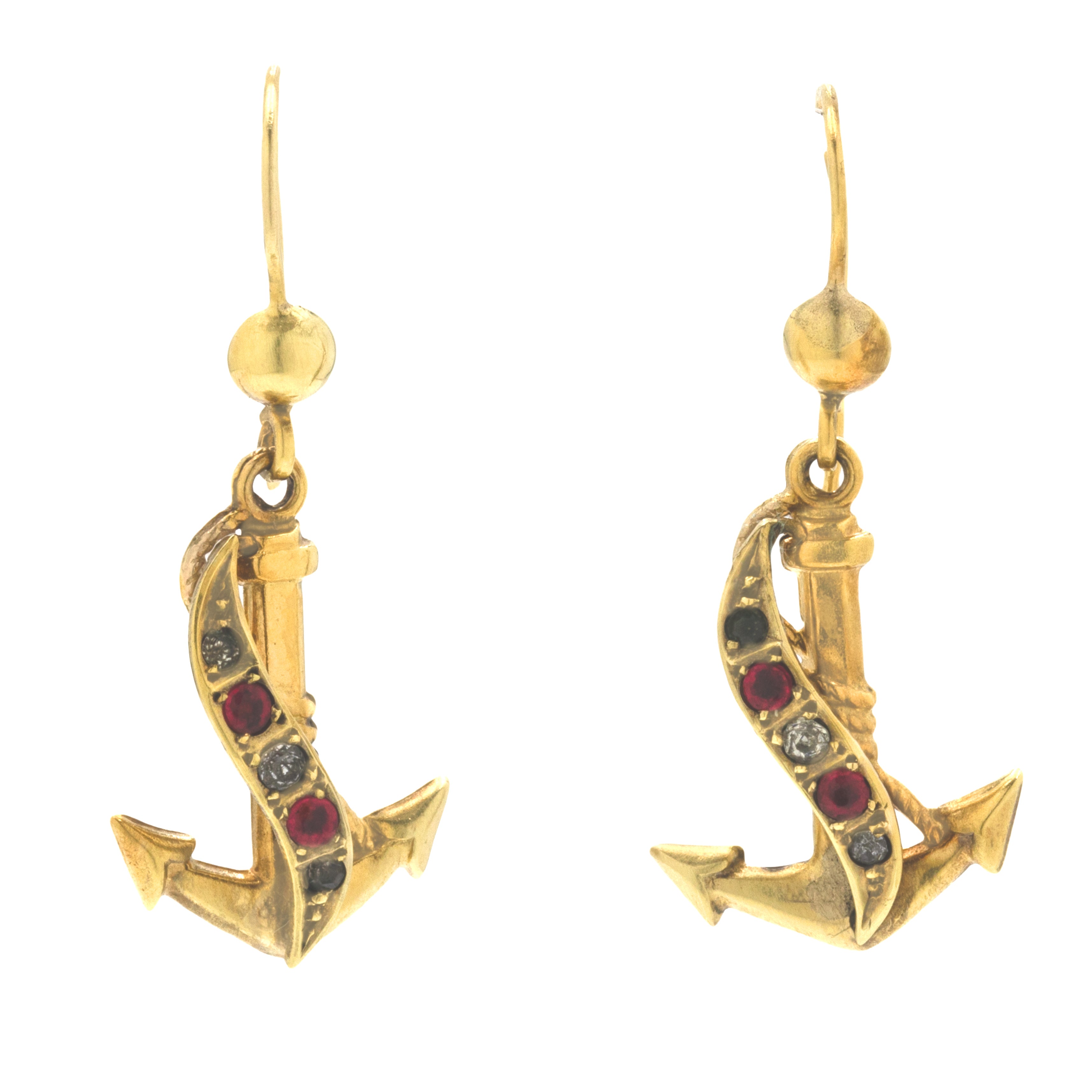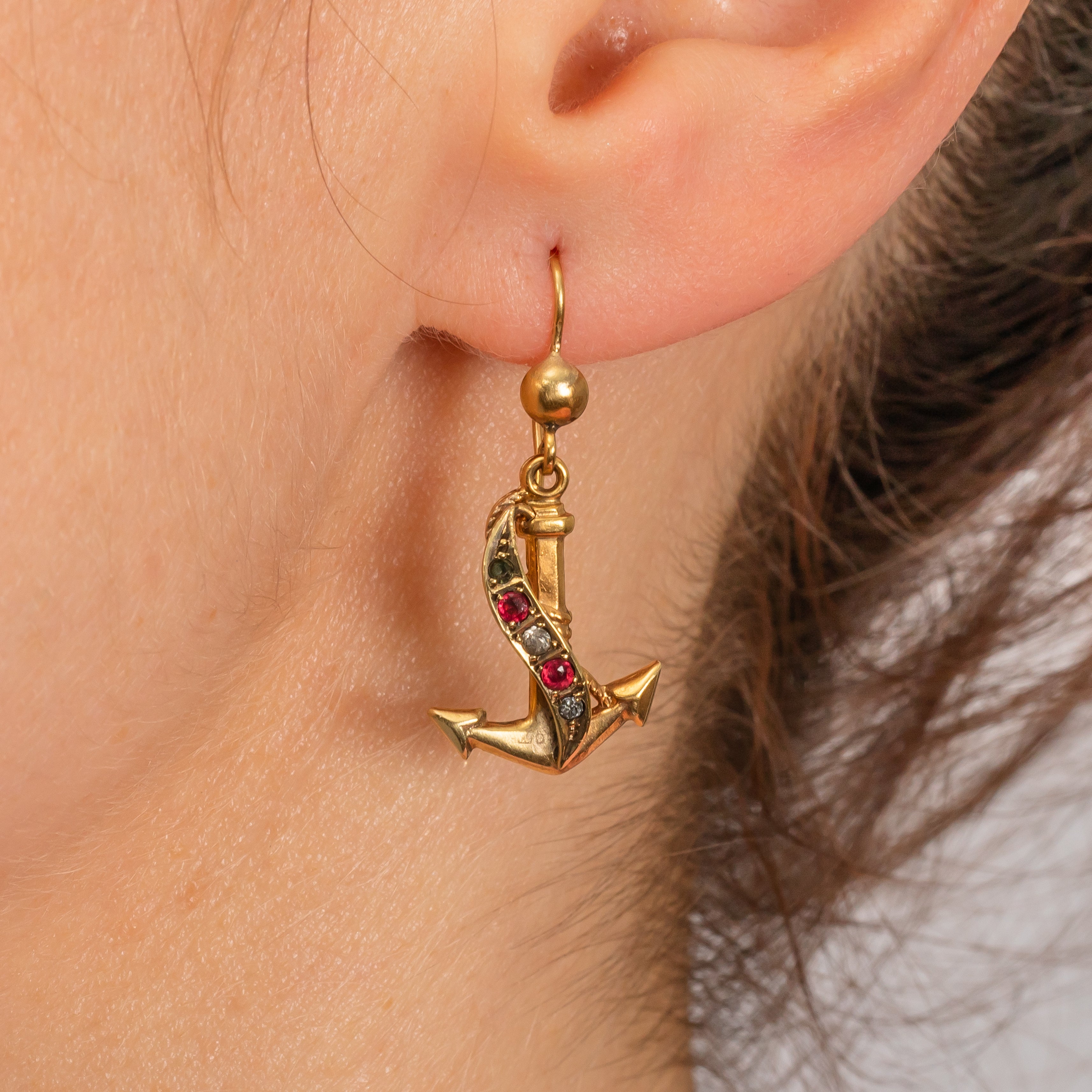 These Victorian 9ct Gold Paste anchor earrings were made for lovers of all things nautical! Crafted entirely from 9ct Gold, their anchor drops are adorned with a ribbon of Gold, inlaid with petty pink and white Paste.