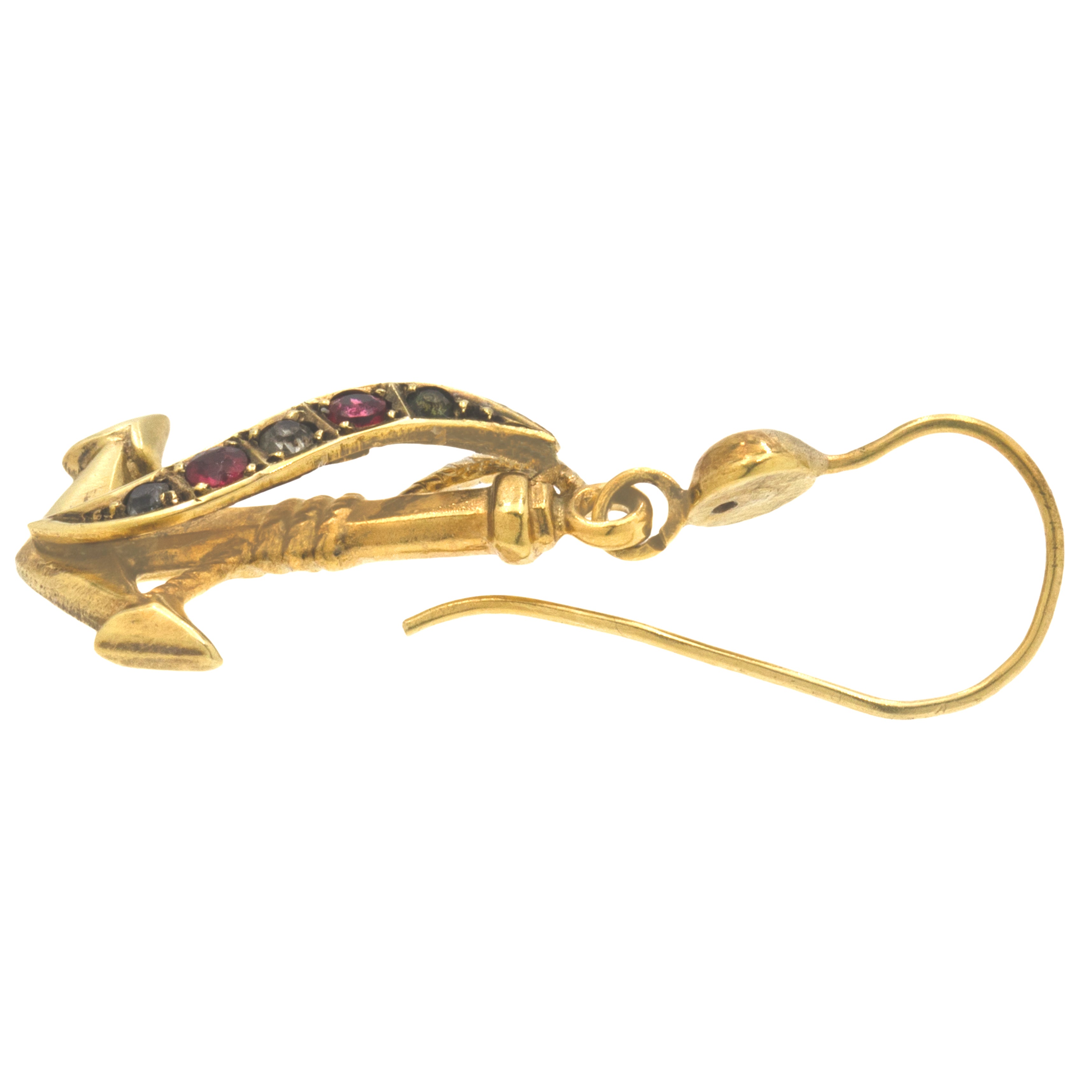 VERY GOOD. These Victorian 9ct Gold Paste anchor earrings are in very good condition. The Paste are all secure within their settings and bring a lovely accent of colour to the saturated 9ct Gold, although one or two are slightly darker than the rest due to age. The form of the anchors has remained intact which is nice to see, and they're just as pretty from the back as they are front the front- a lovely detail of antique jewellery! Complete with solid 9ct Gold hooks.
