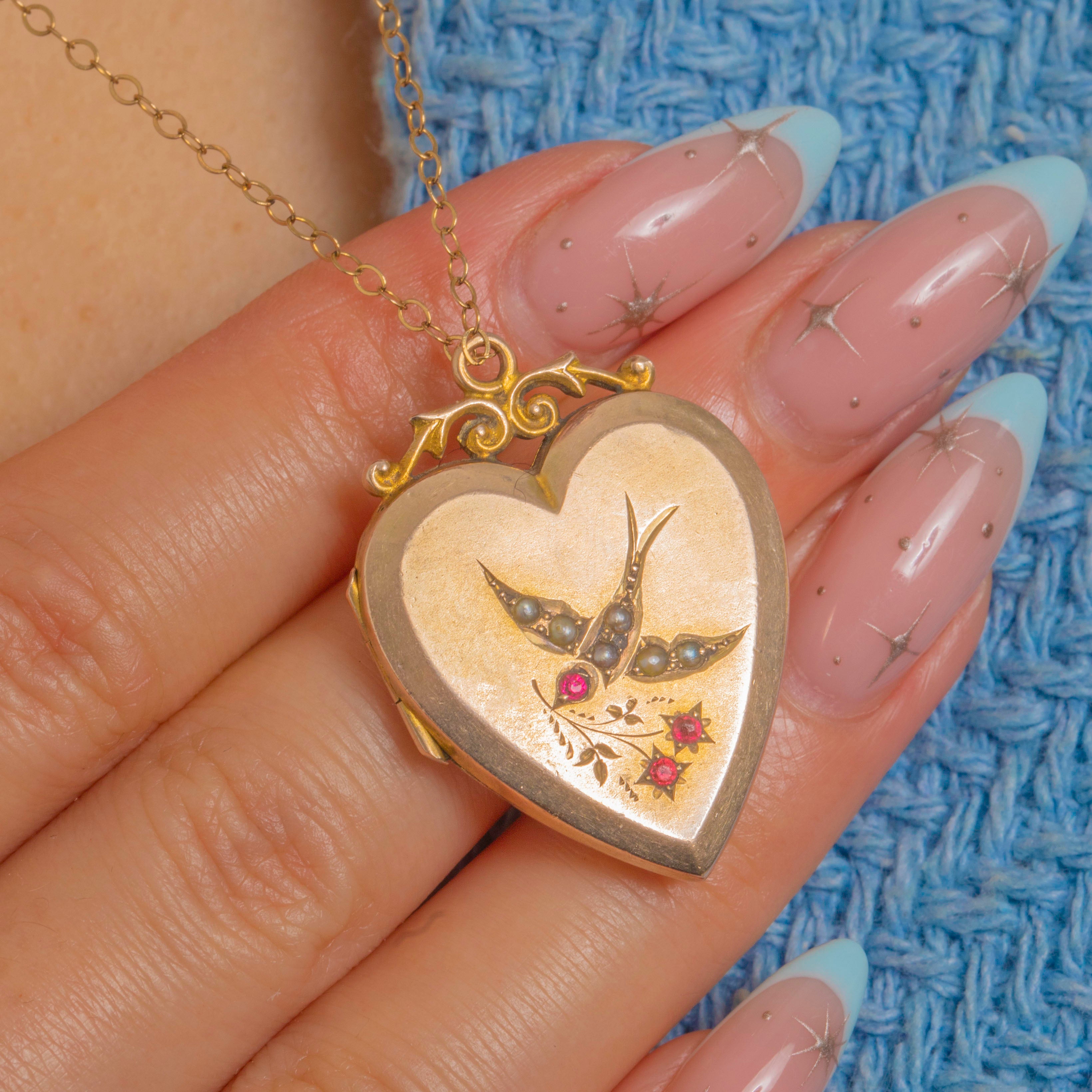 A romantic Victorian heart locket in 9ct Gold, embellished with a graceful swallow picked out in tiny Pearls and accented by twinkling star-set pink-red Paste. The softly satin front is enlivened with engraved foliage and finished with a polished border, crowned by a pretty foliate-scroll surmount and round bail.