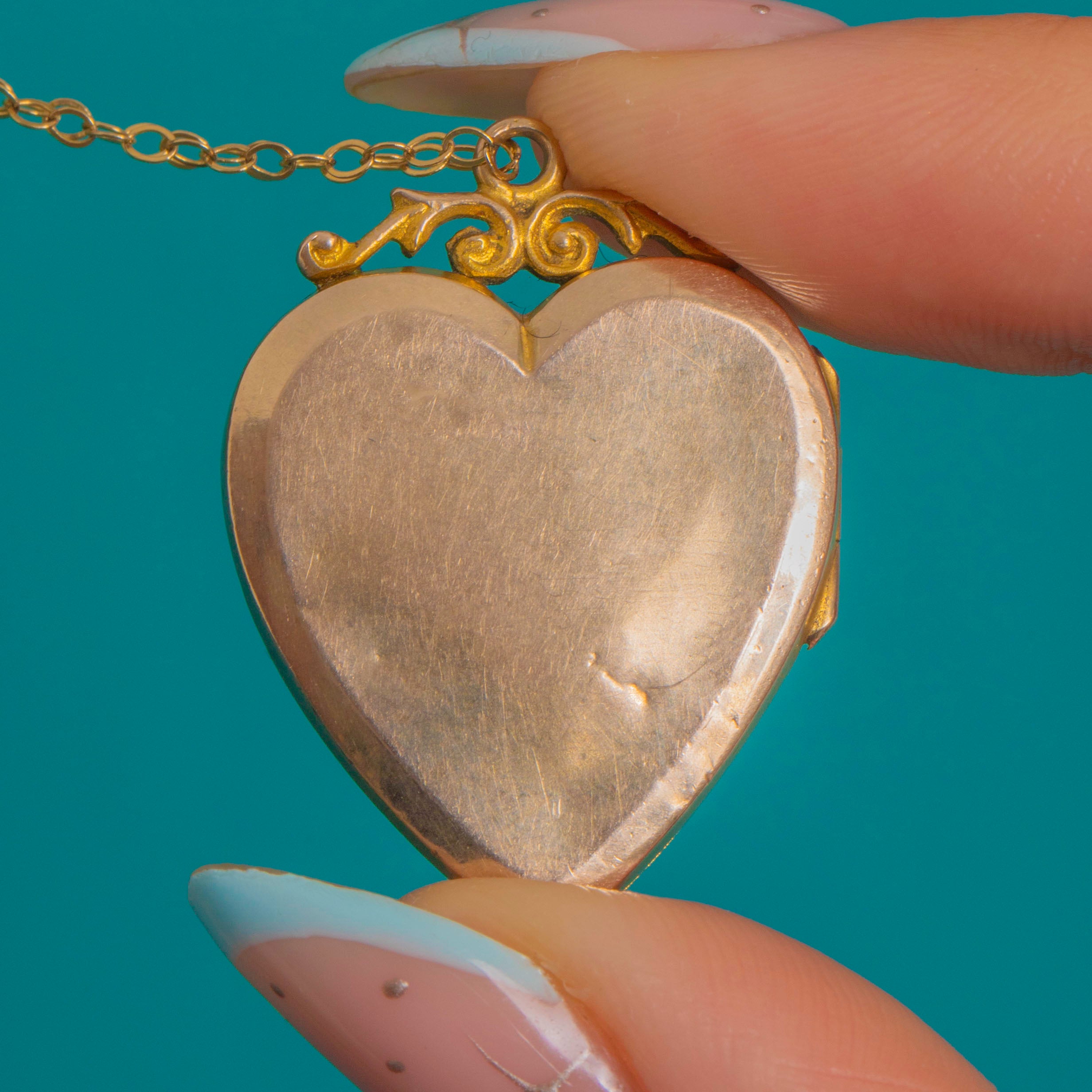 Inside are twin heart-shaped compartments for treasured photographs (the original frames/glazing are not present). It comes with a fine 9ct Gold chain for effortless, ready-to-wear elegance.