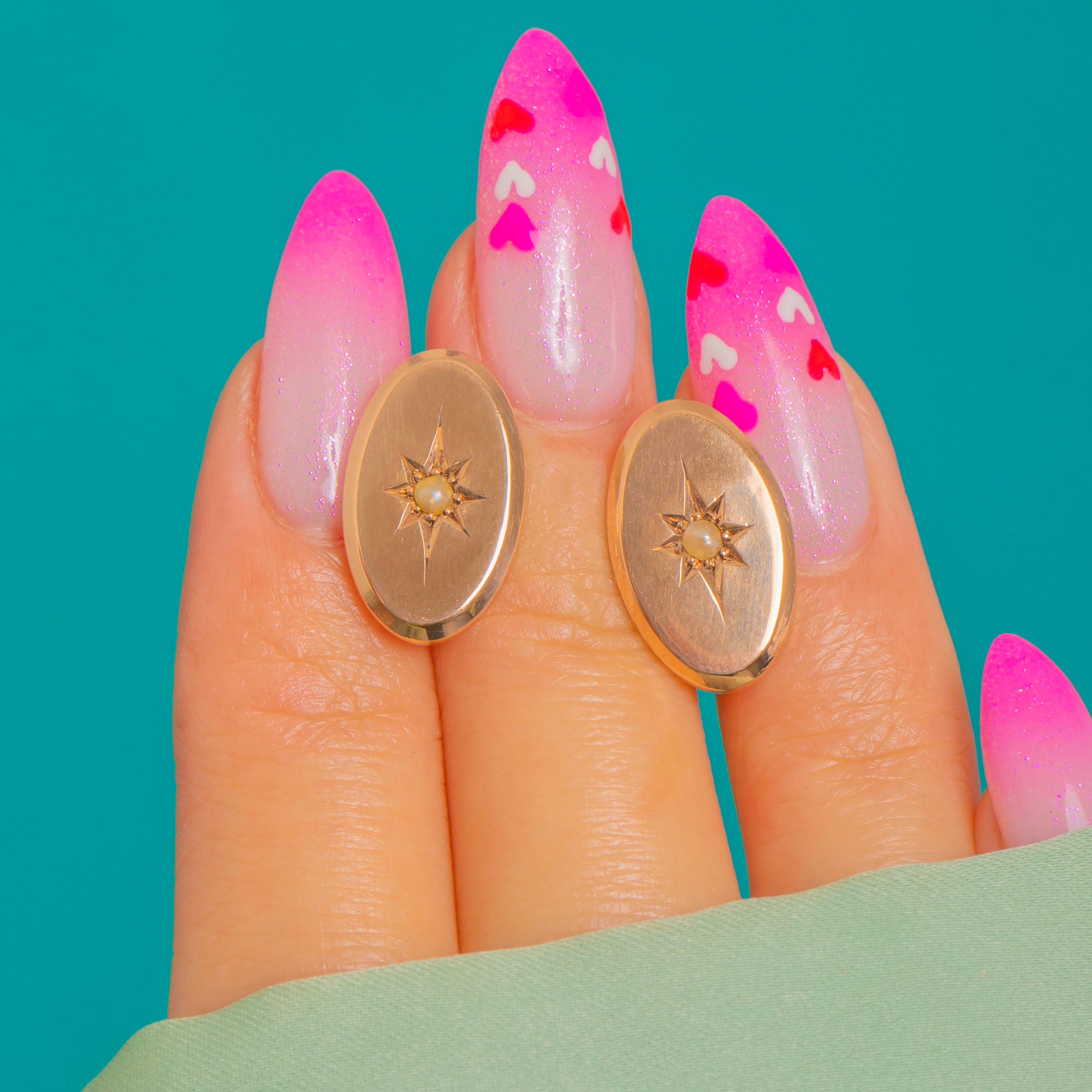 These charming Victorian 9ct Gold stud earrings capture the era’s love of celestial symbolism. Each low-profile oval plaque is crisply engraved with an eight-point star and set at the heart with a petite Pearl, creating a delicate glow against the warm Gold.