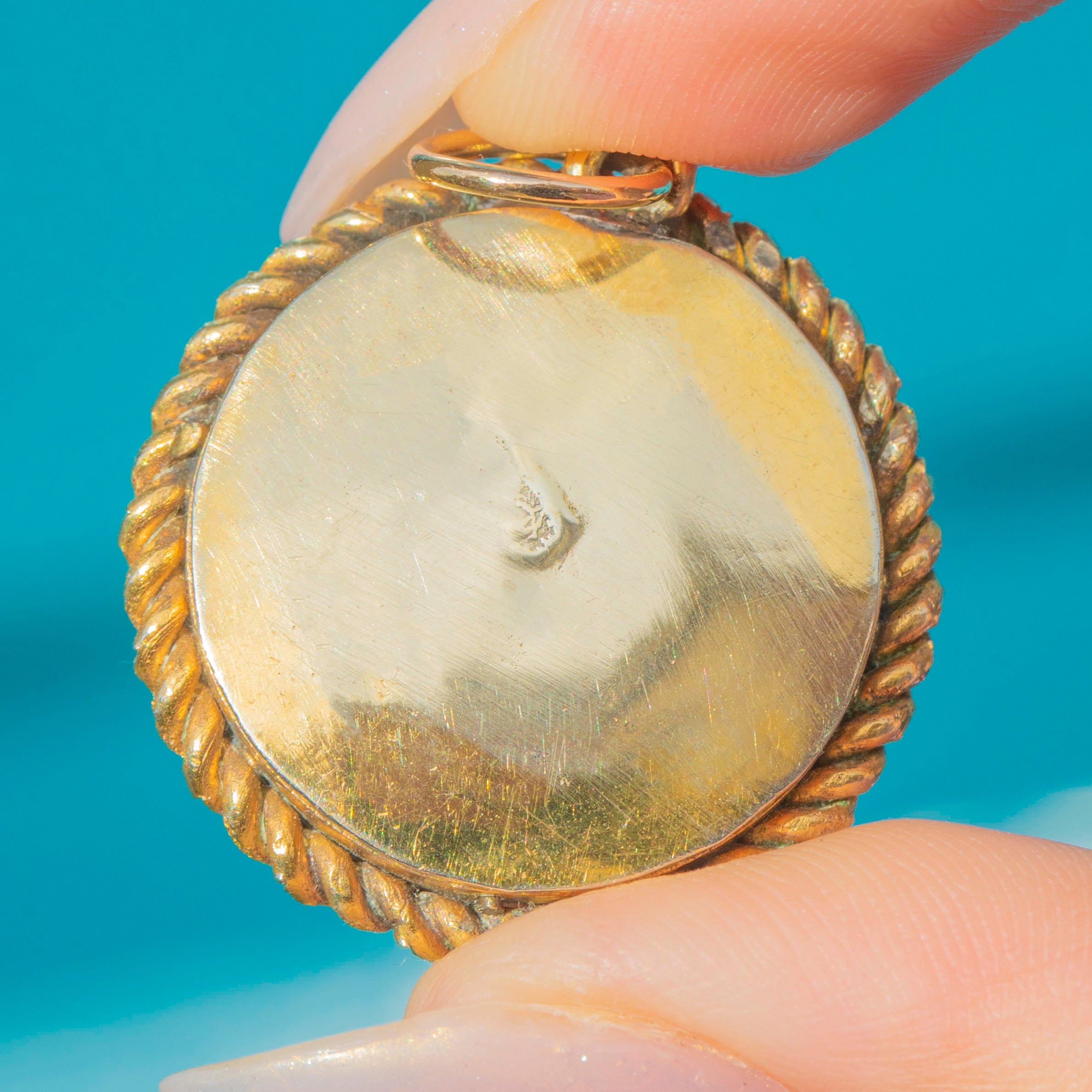 EXCELLENT: The Amethyst cabochon is intact with no damage or wear, maintaining a glossy, smooth surface. The 9ct Gold setting and gilded rope-effect border are well-preserved, highlighting the pendant’s refined Victorian craftsmanship.