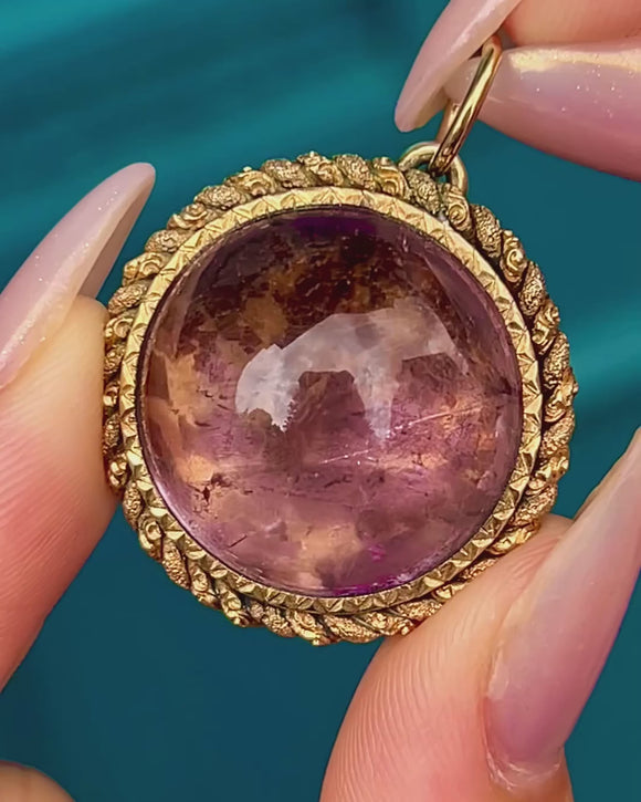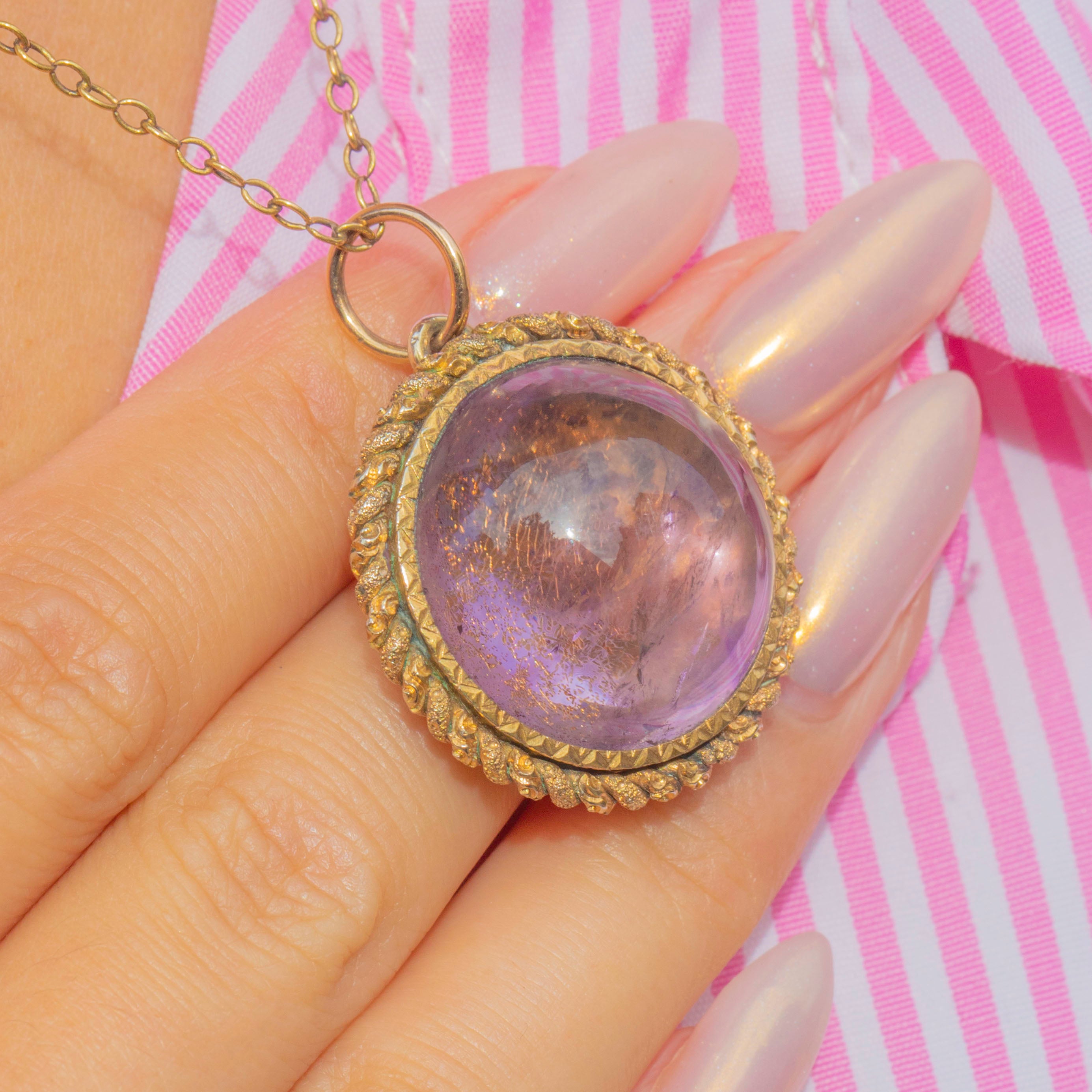 A stunning Victorian pendant crafted in 9ct Gold, featuring a large Pink "Rose De France" Amethyst cabochon. The smooth, glossy orb displays delicate lilac overtones and natural inclusions that catch the light beautifully.
