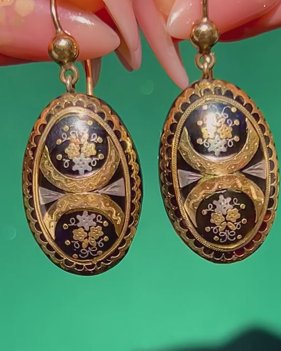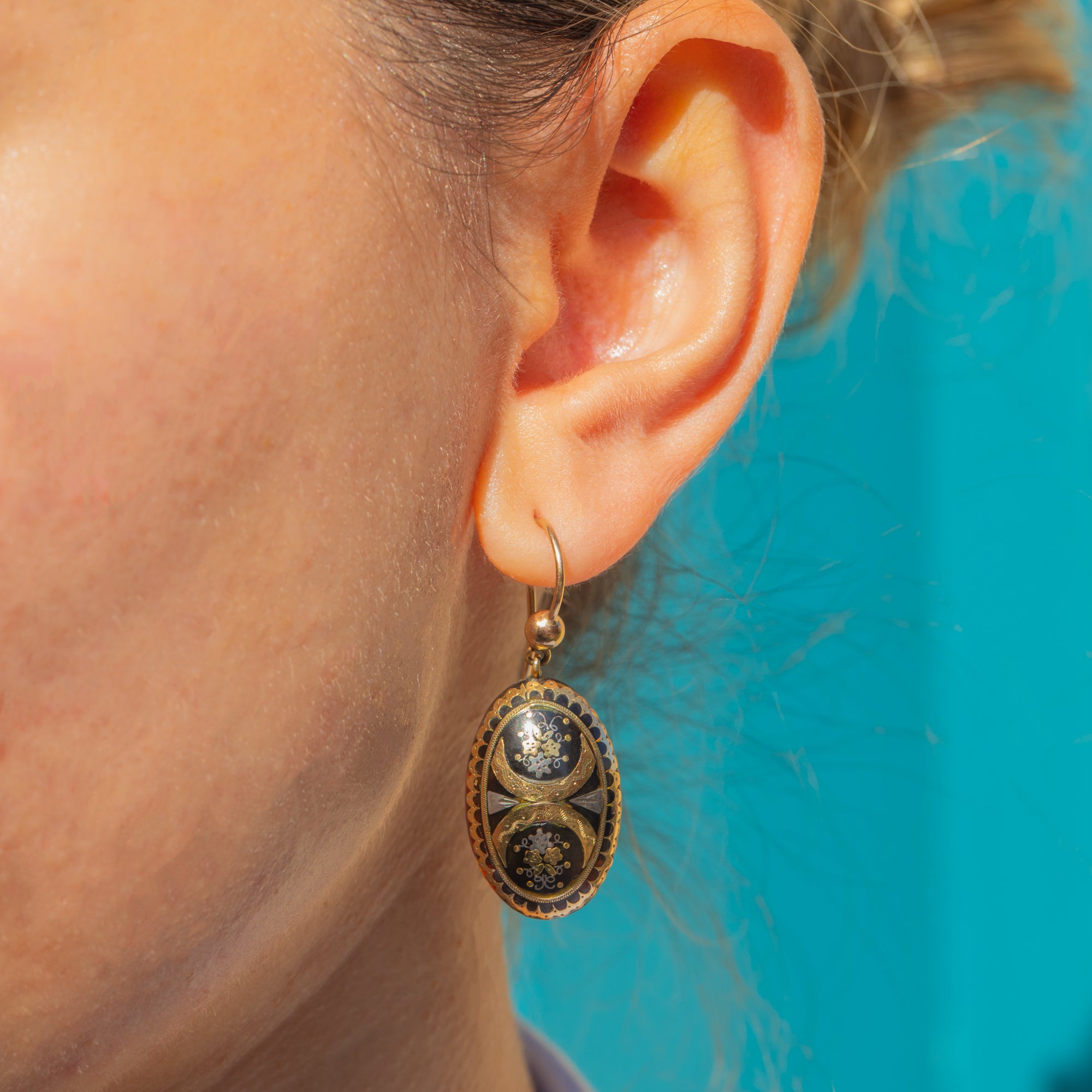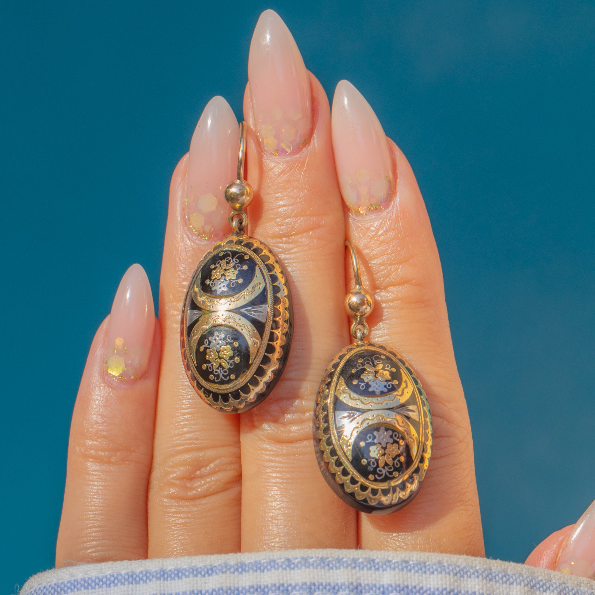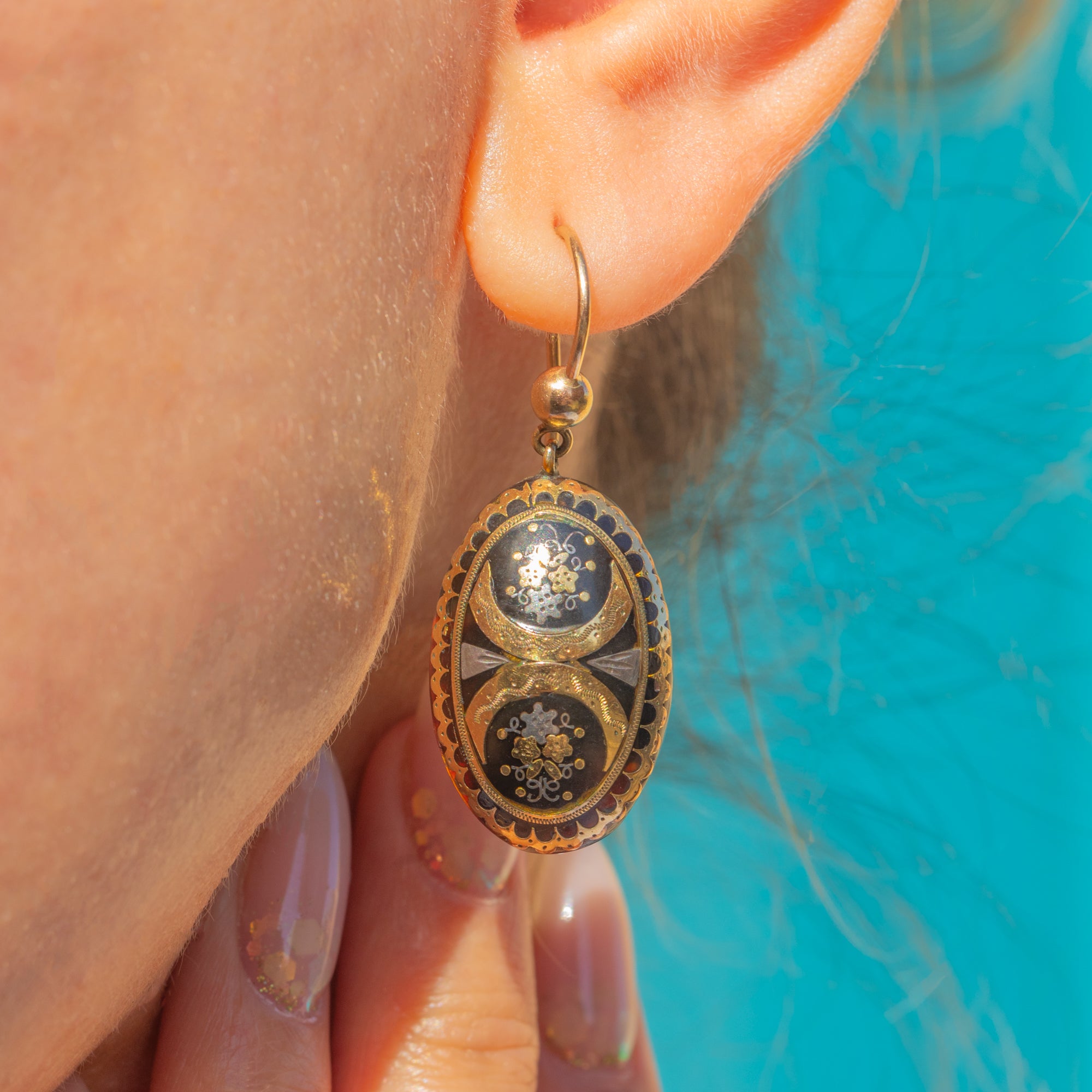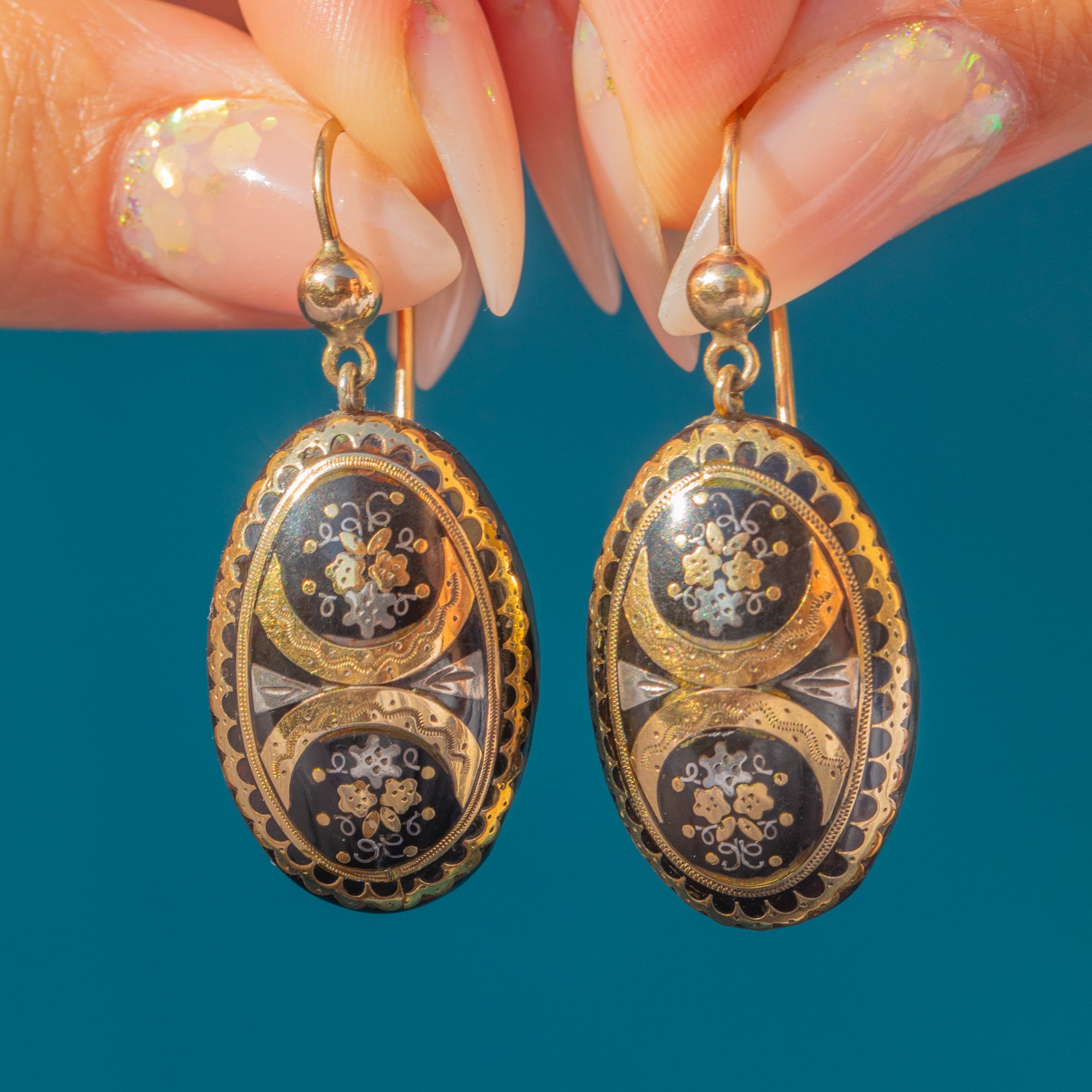 Crafted circa 1860, these rare Victorian drop earrings are a superb example of Piqué jewellery. Each oval drop features intricate Gold and Silver inlays set into a glossy black background, creating a striking contrast that epitomises the refined craftsmanship of the mid-19th century.