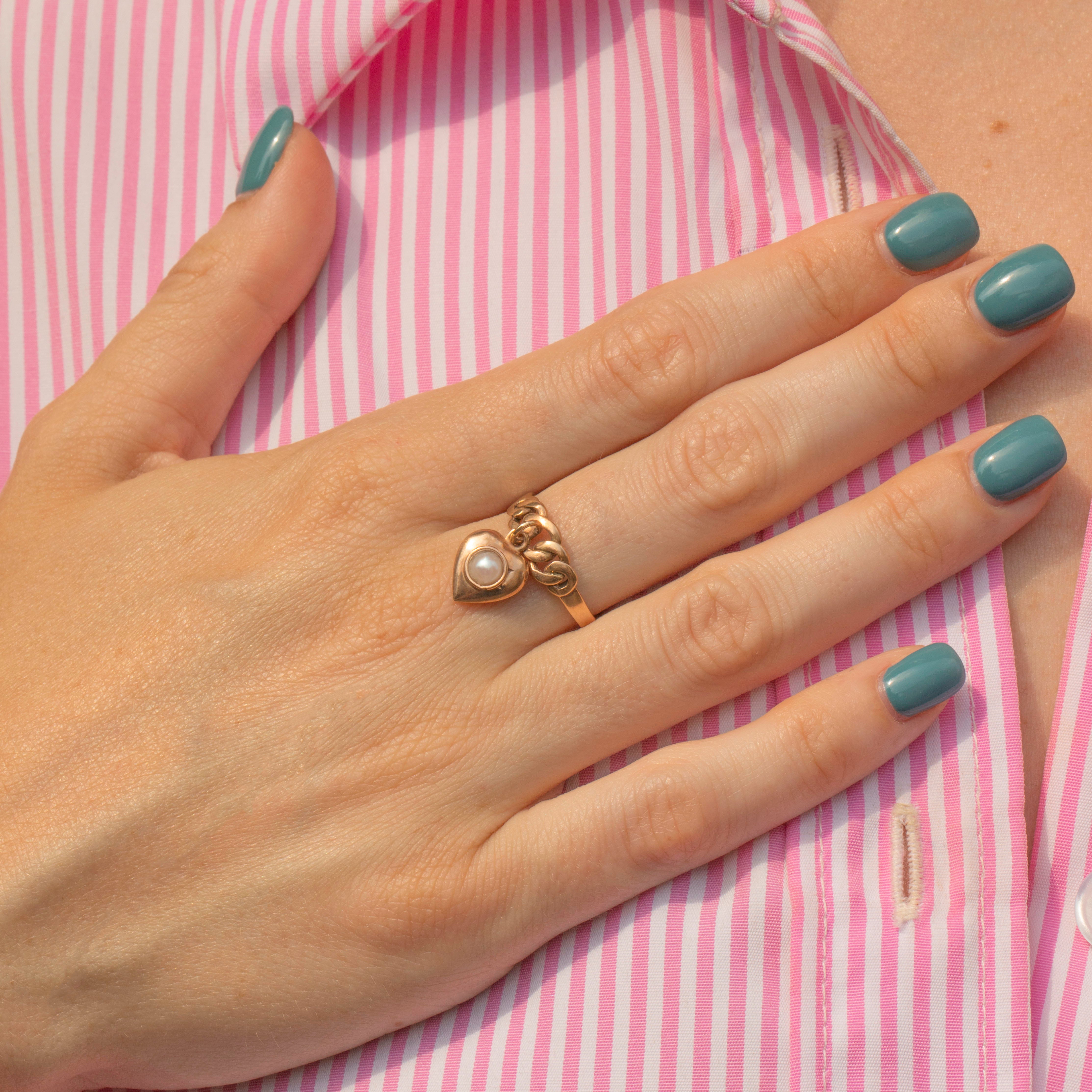 The puffy heart charm is set with a creamy Pearl on the front, providing an iridescent sheen that perfectly complements the rose-kissed Gold. This unique antique heart ring will make a feminine addition to your collection!