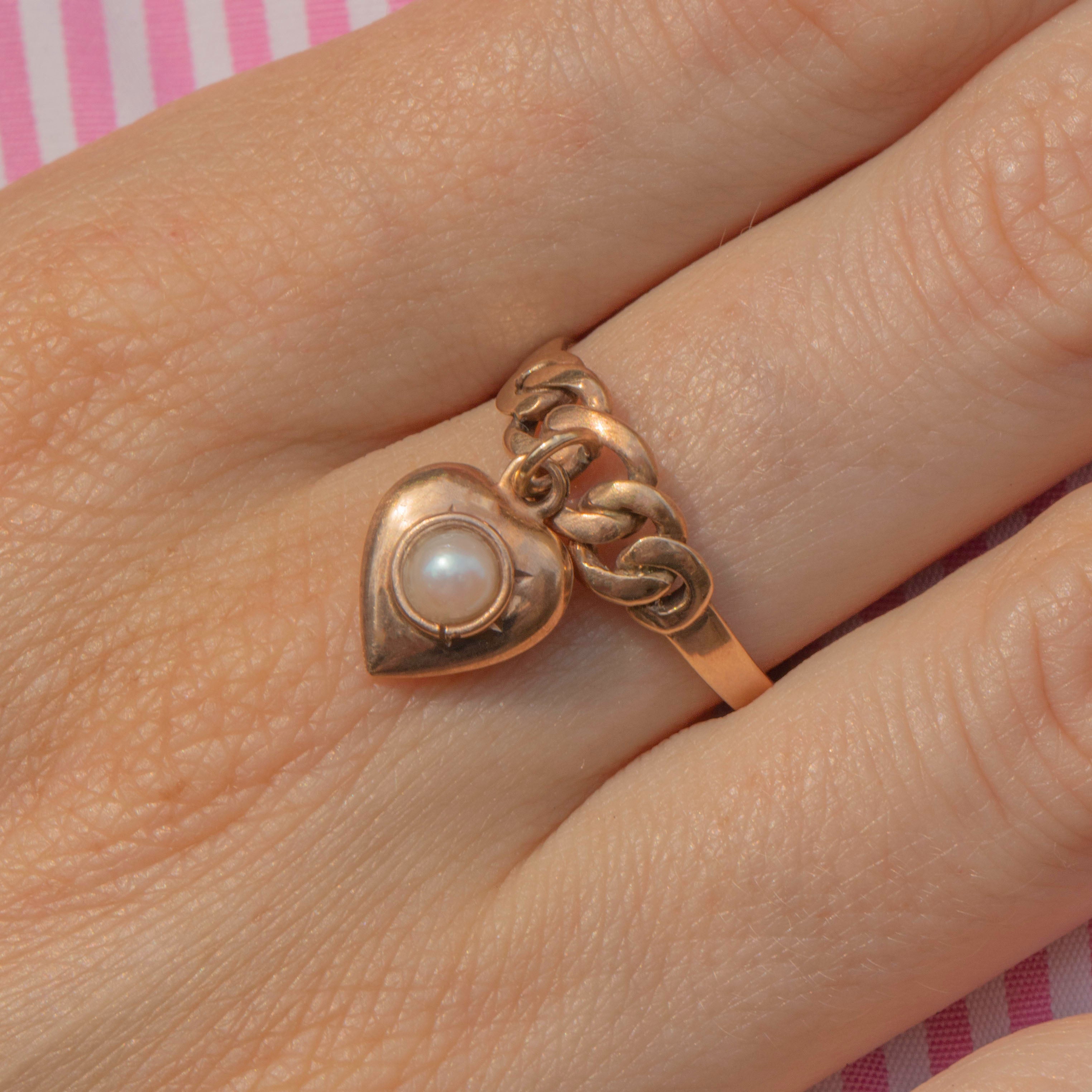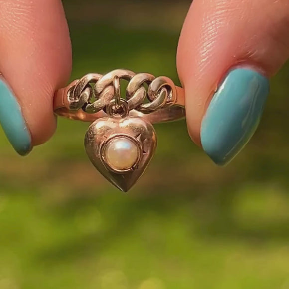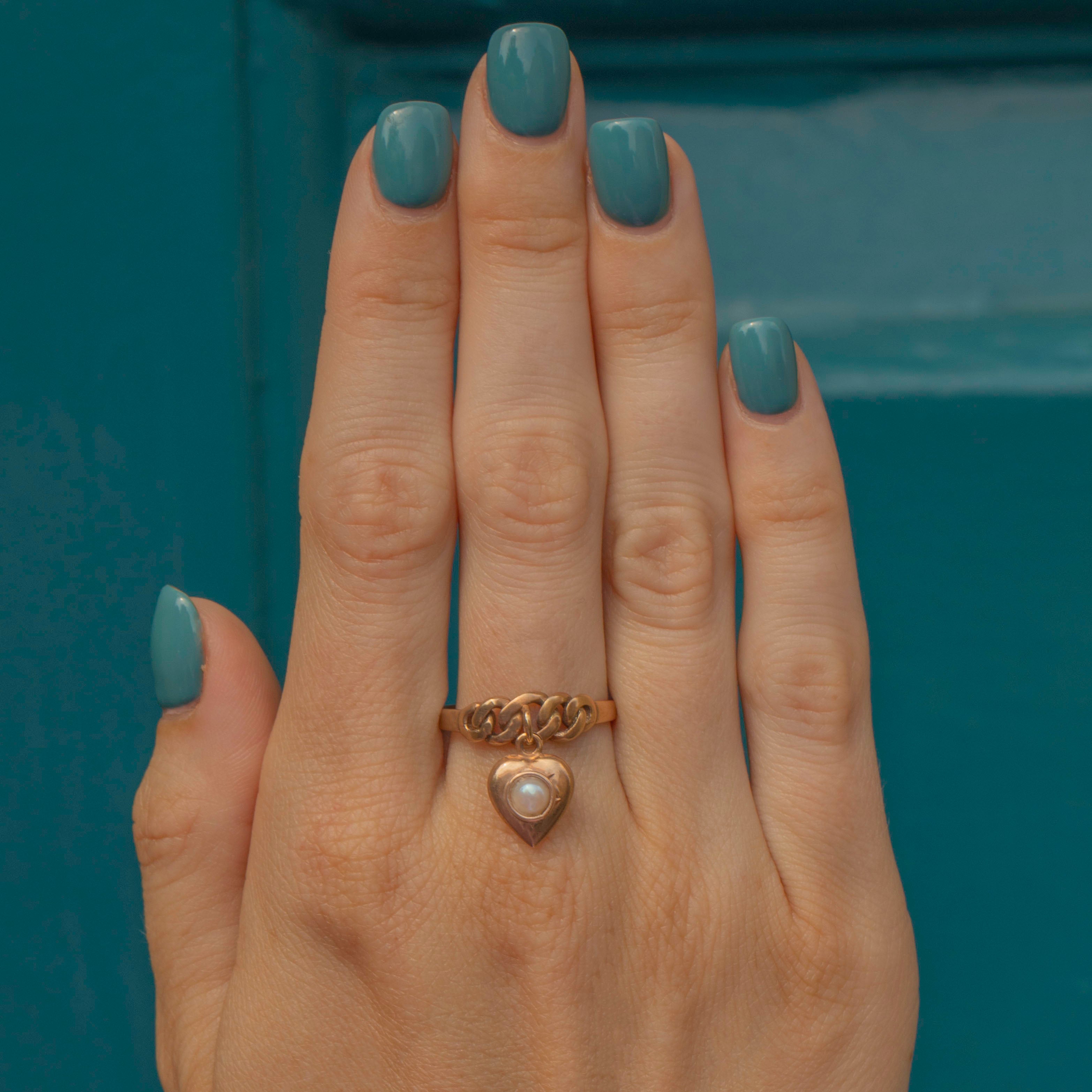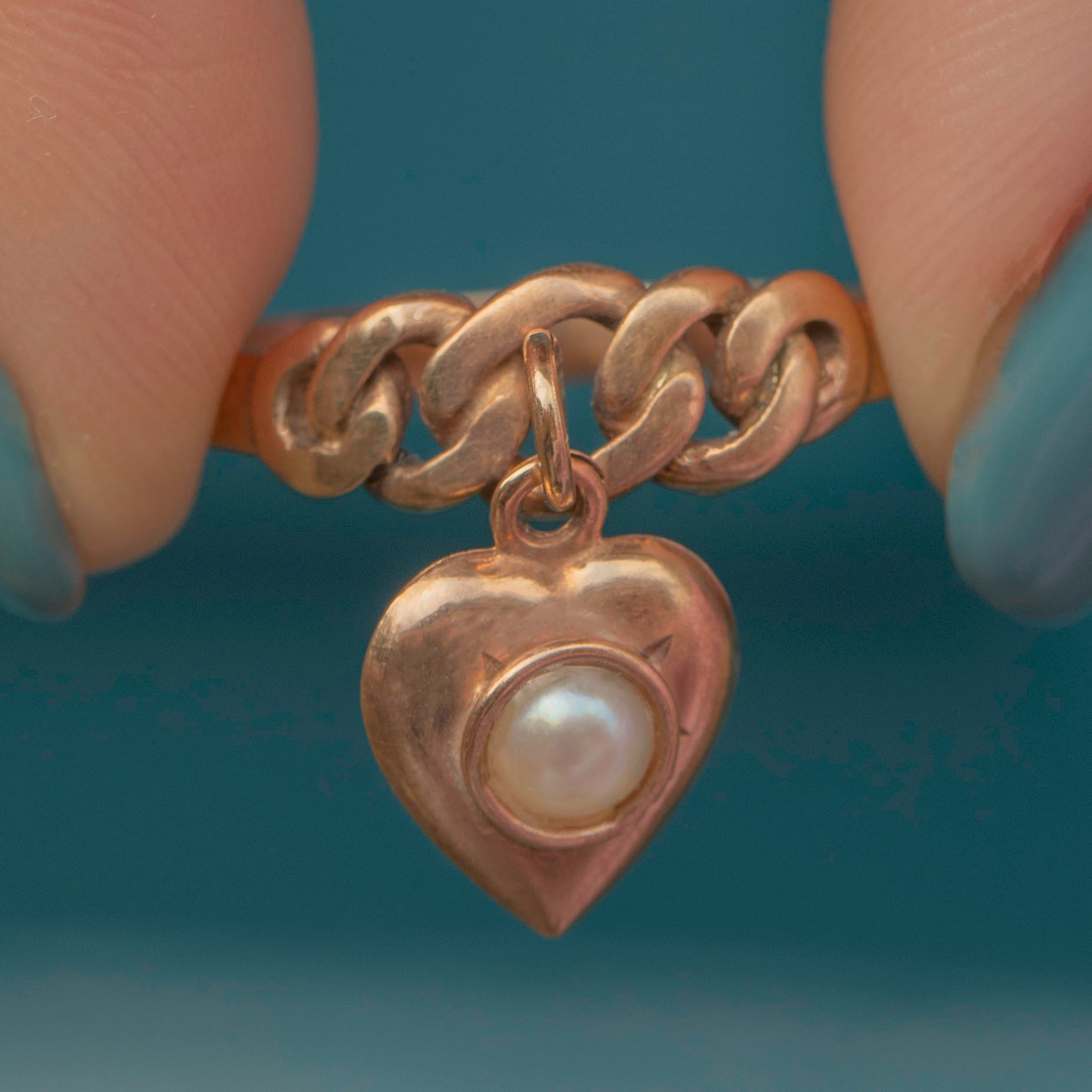 A resplendent treasure, this Victorian 9ct Gold Pearl heart drop ring will bring antique allure to your repertoire! Crafted from solid 9ct Gold, this antique ring features a section of neatly curbed link details suspending a cute heart charm for a romantic finish.
