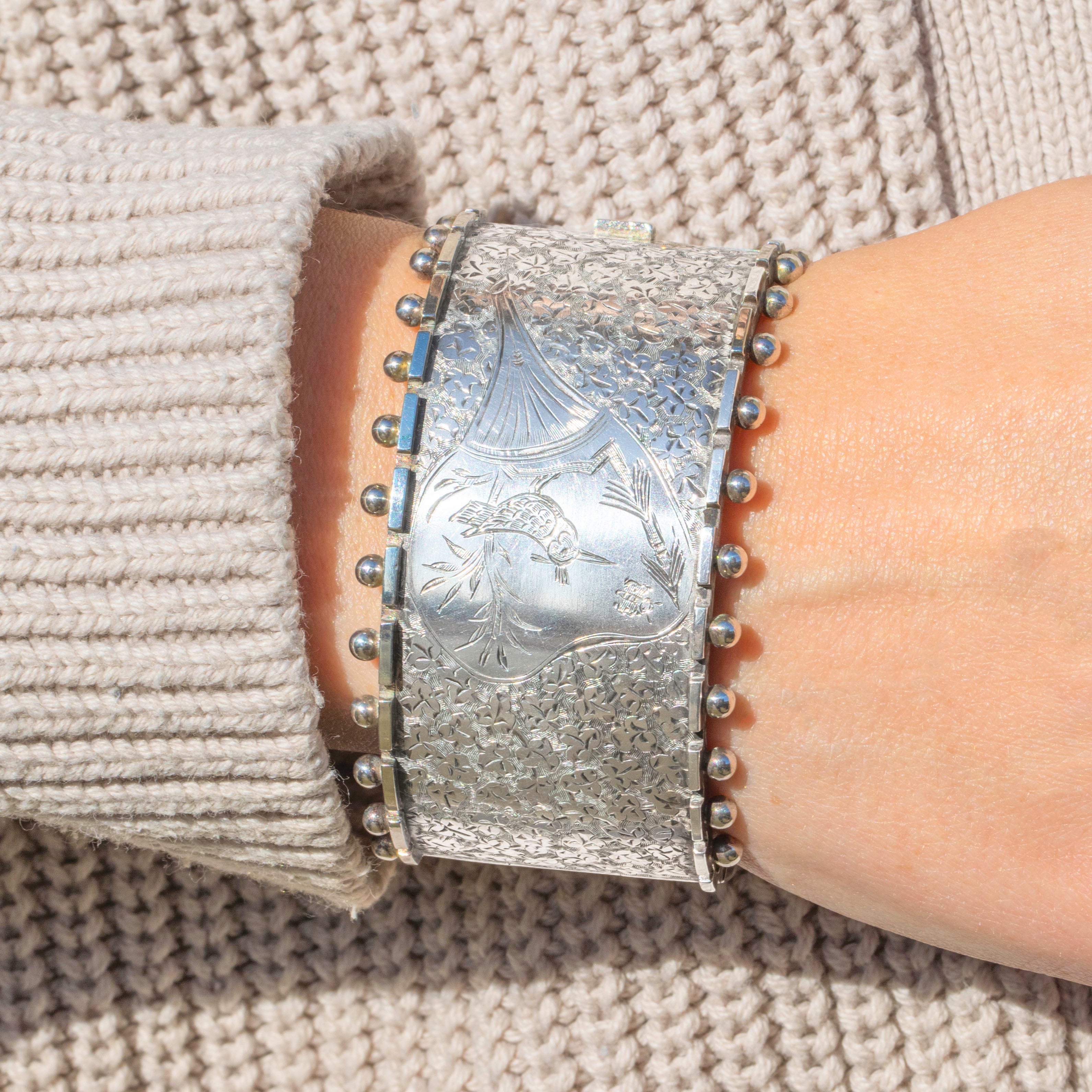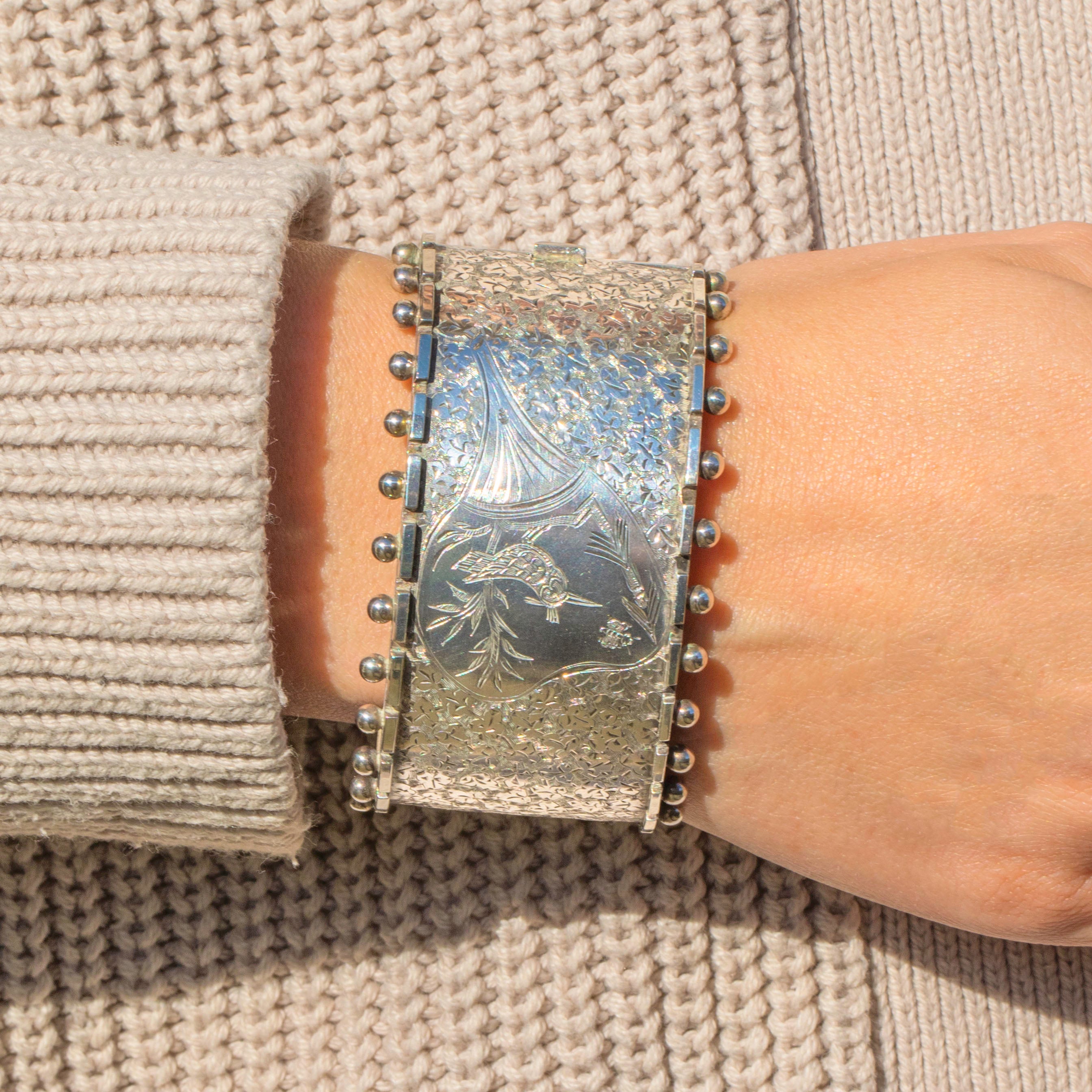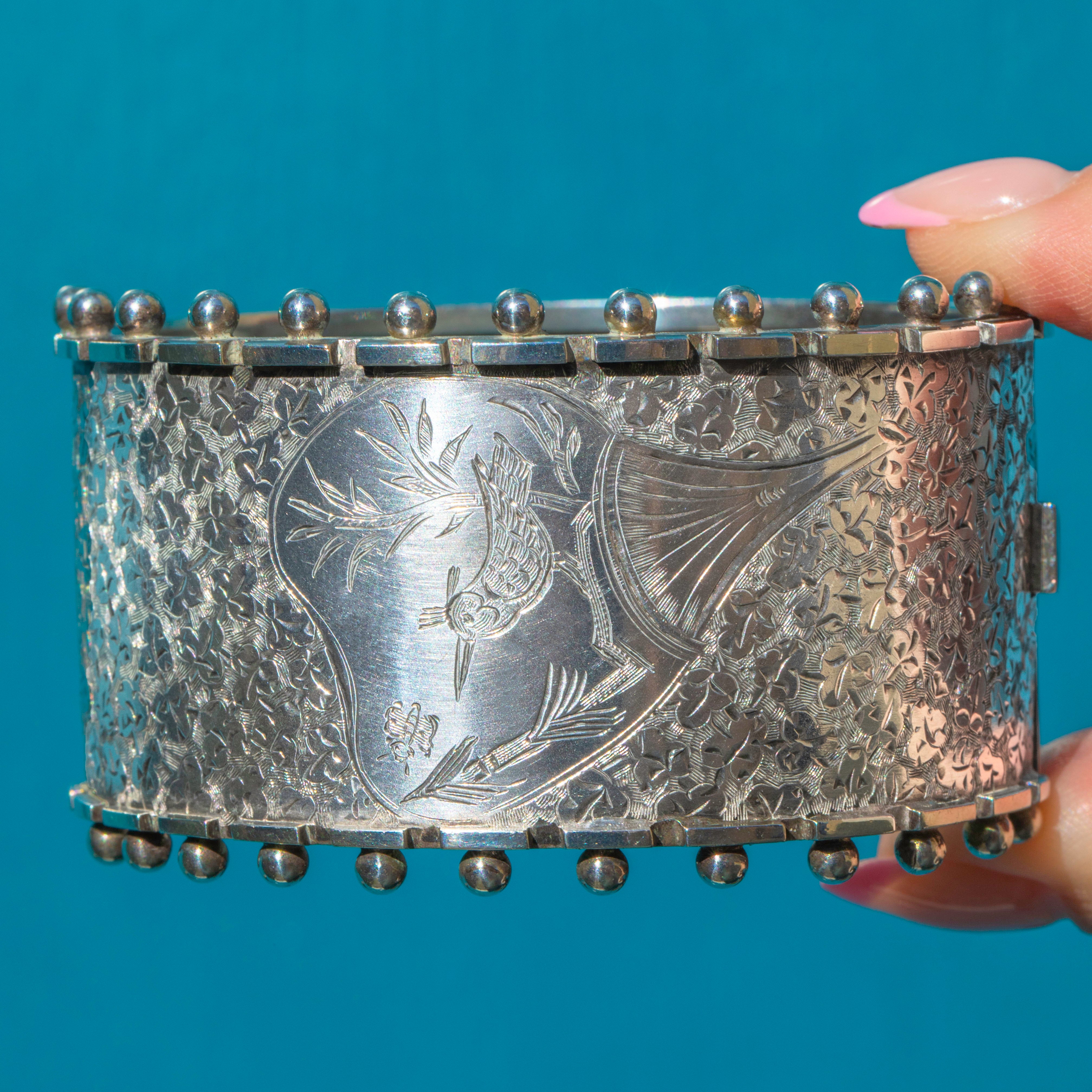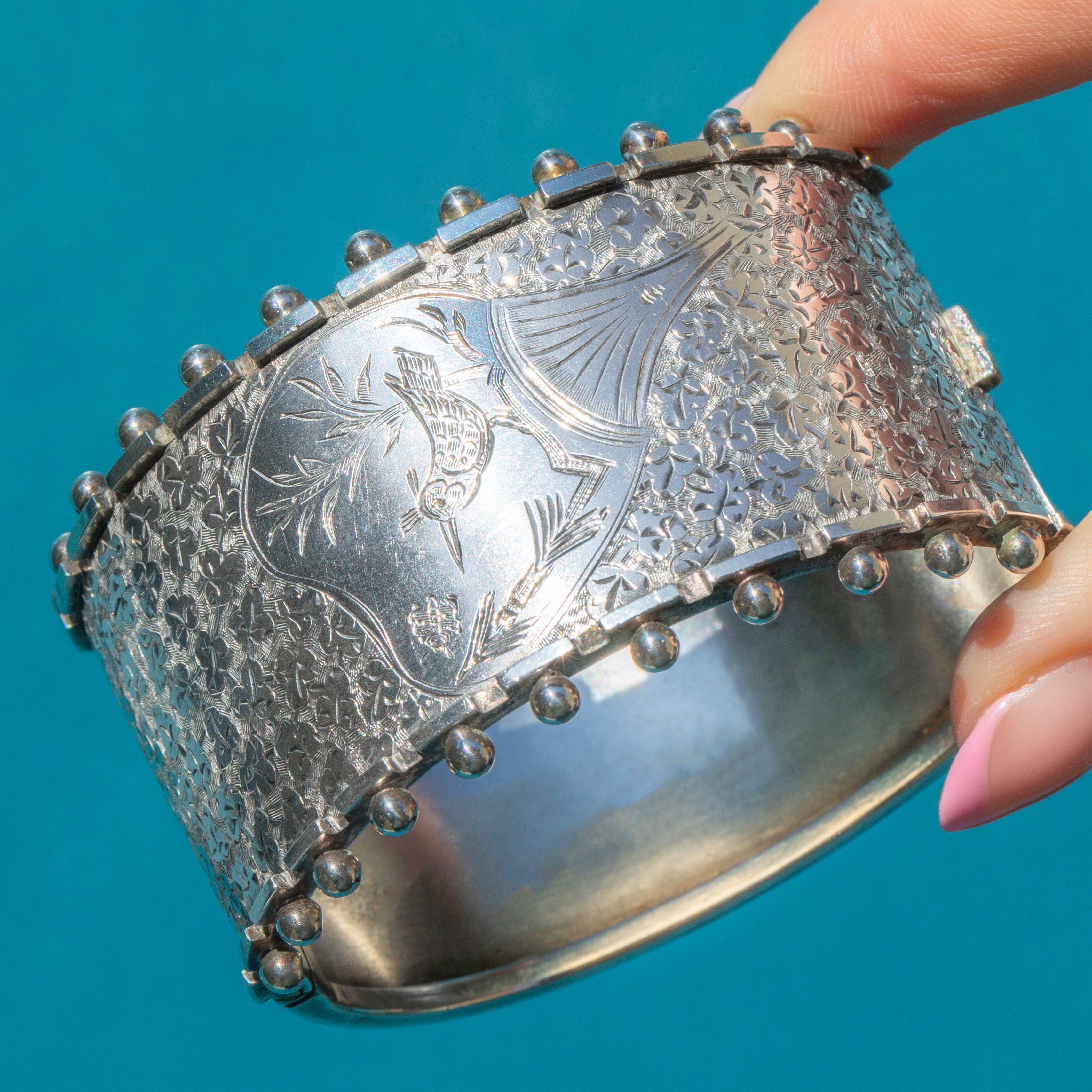 This Victorian aesthetic engraved bird Silver bangle is bursting with sweet symbolism! This antique cuff bangle is a classic piece of Victorian Aesthetic design, featuring exquisite details and a beaded edge adding a distinctive finish.