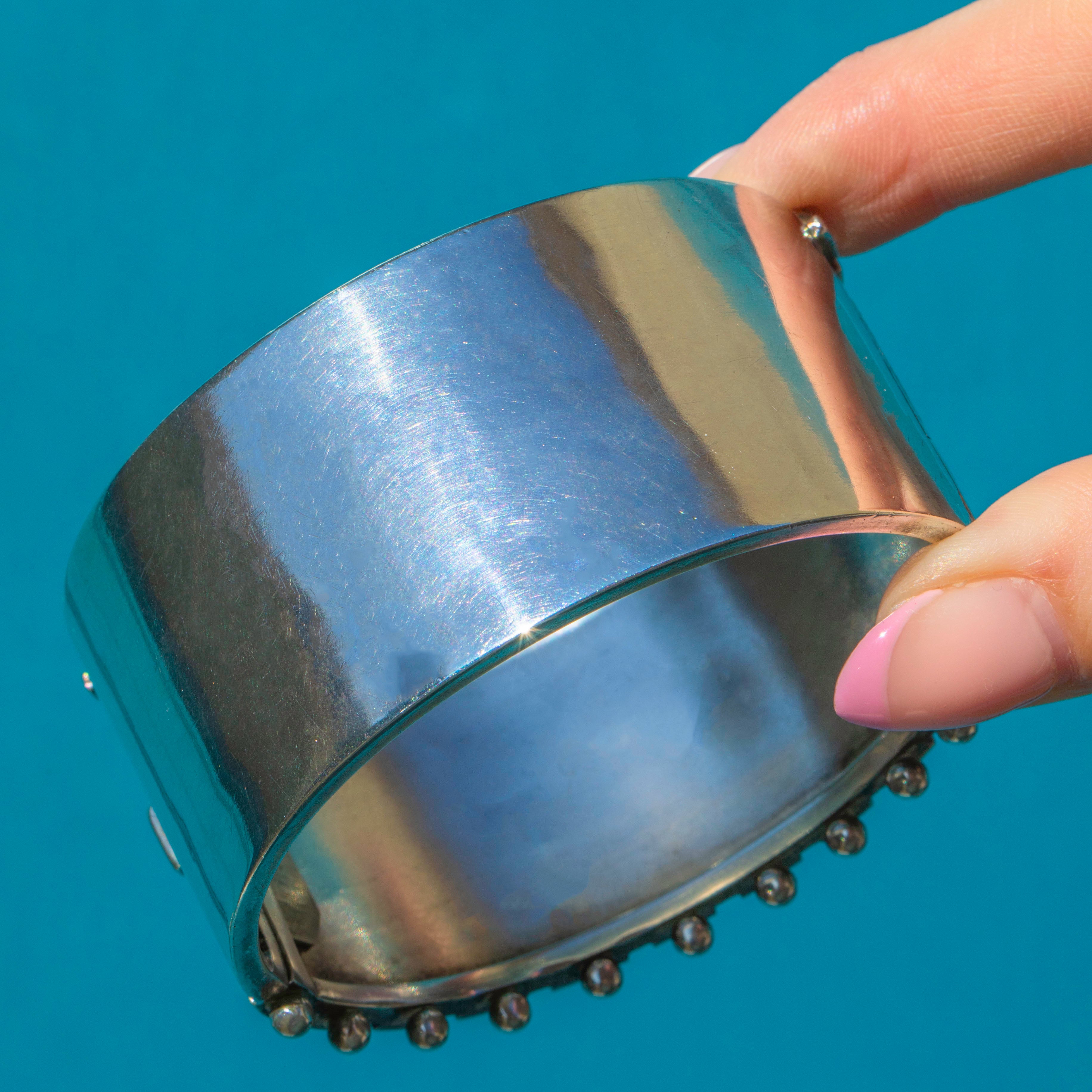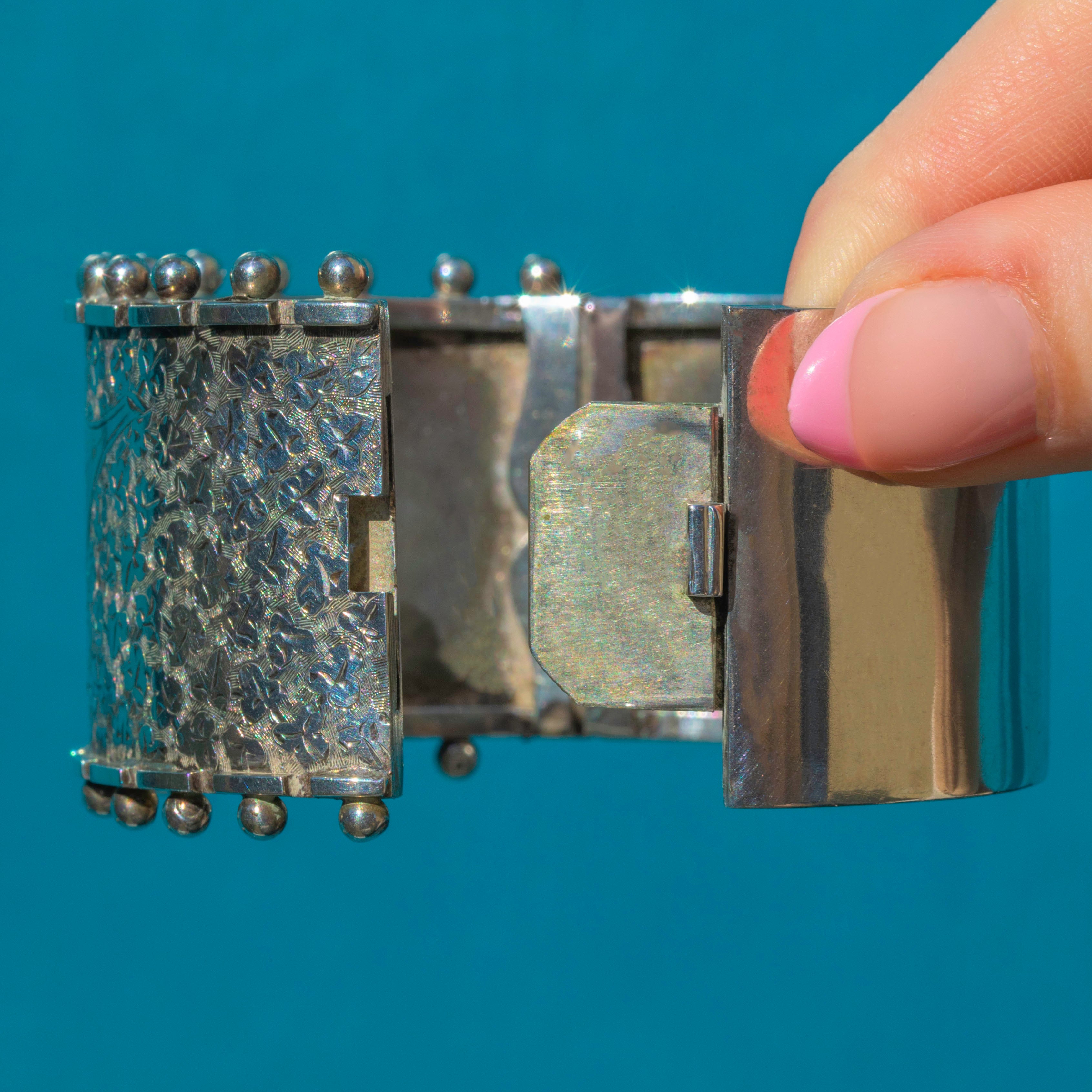 VERY GOOD. This Victorian Aesthetic engraved Silver bangle is in very good condition. Her engraved detailing is immaculate, with practically no signs of age despite being over 100 years old. All of her beads accenting the edge the bangle are present and firmly soldered, contributing to the overall impact of the piece. While there is a small dent on the back of the bangle, this is not visible during wear. Her clasp fixes strongly and securely, with a satisfying 'click' allowing for confident and reliable wear.