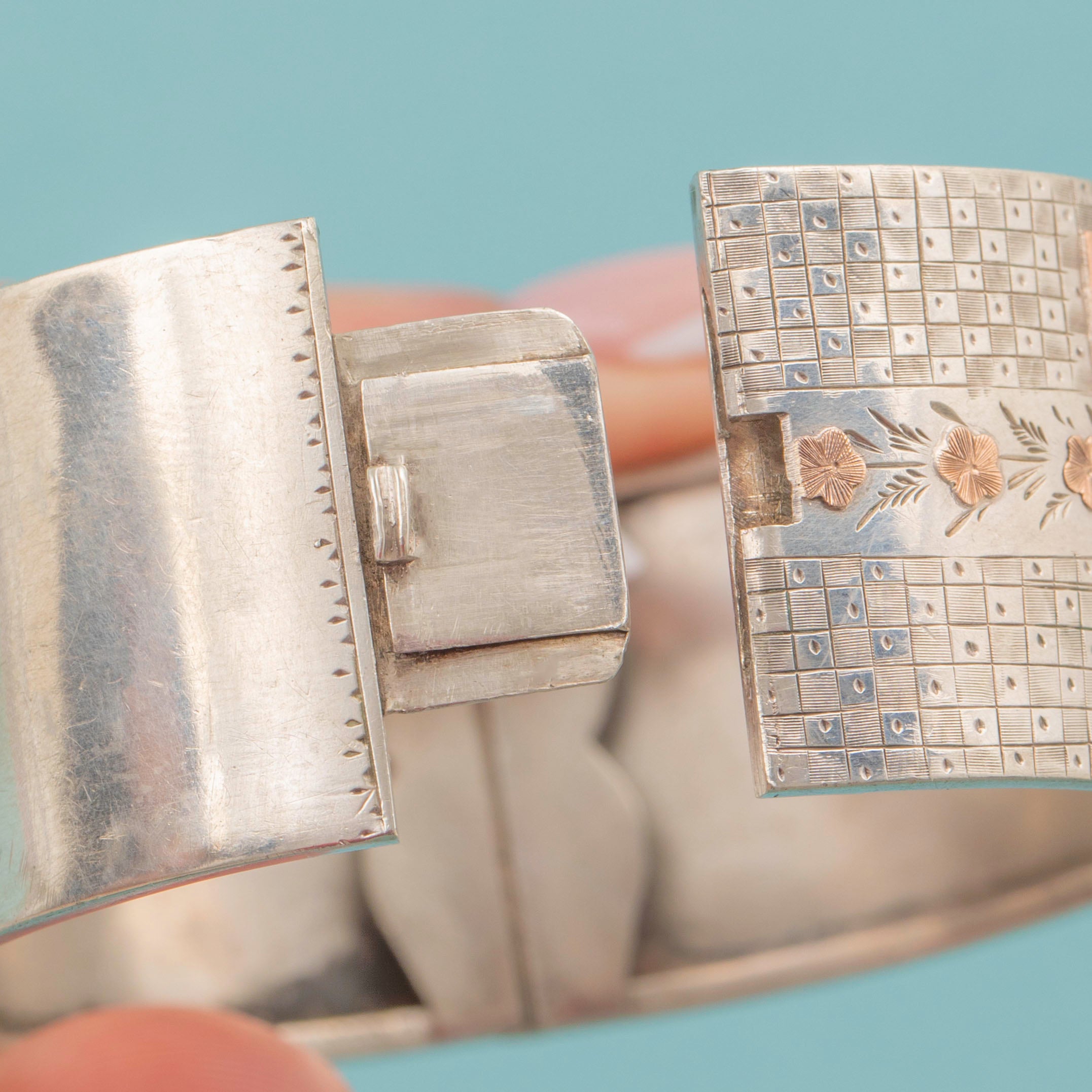 Victorian Aesthetic Silver & 9ct Gold Floral Engraved Bangle, c.1880