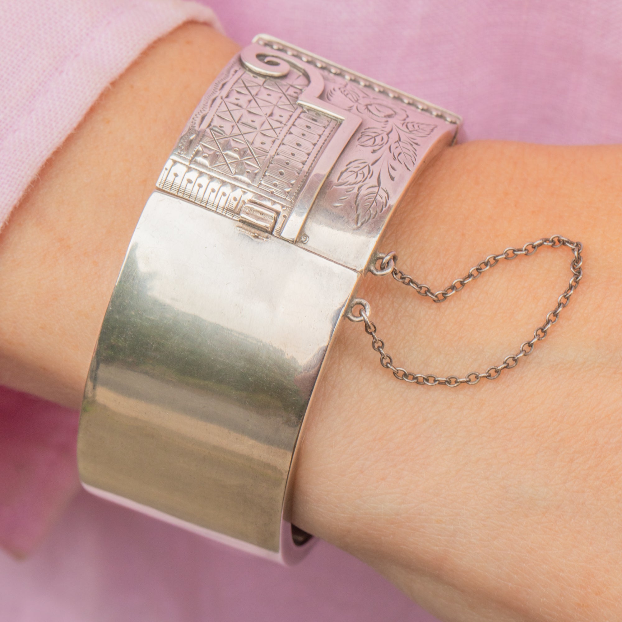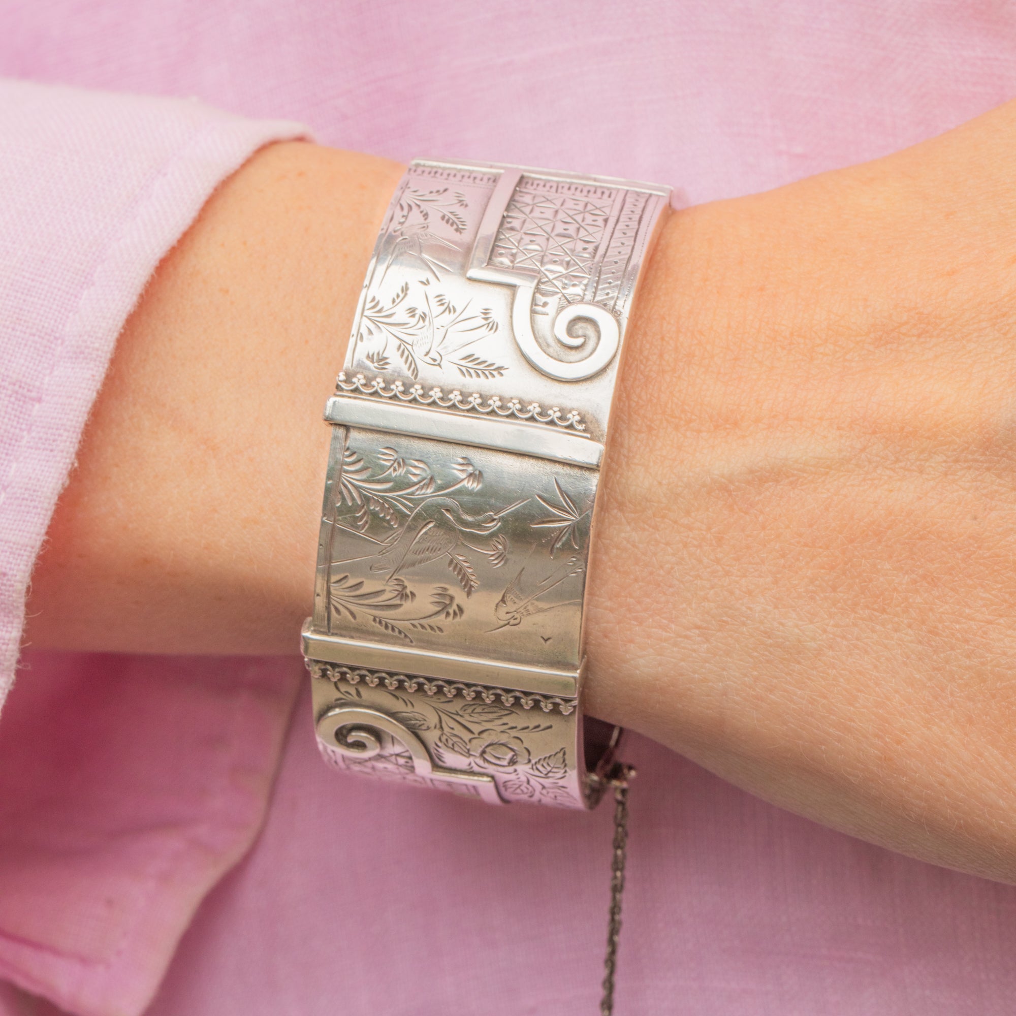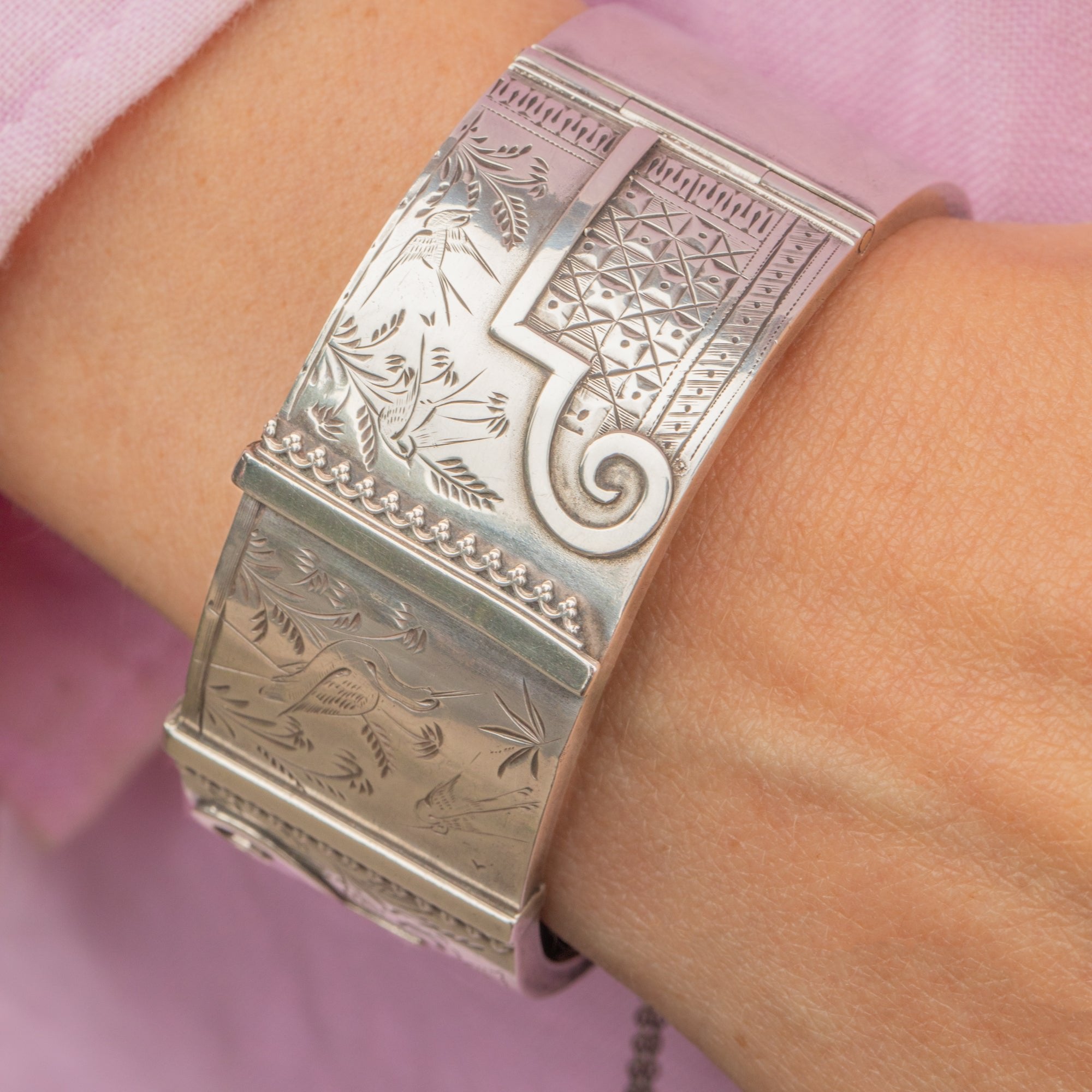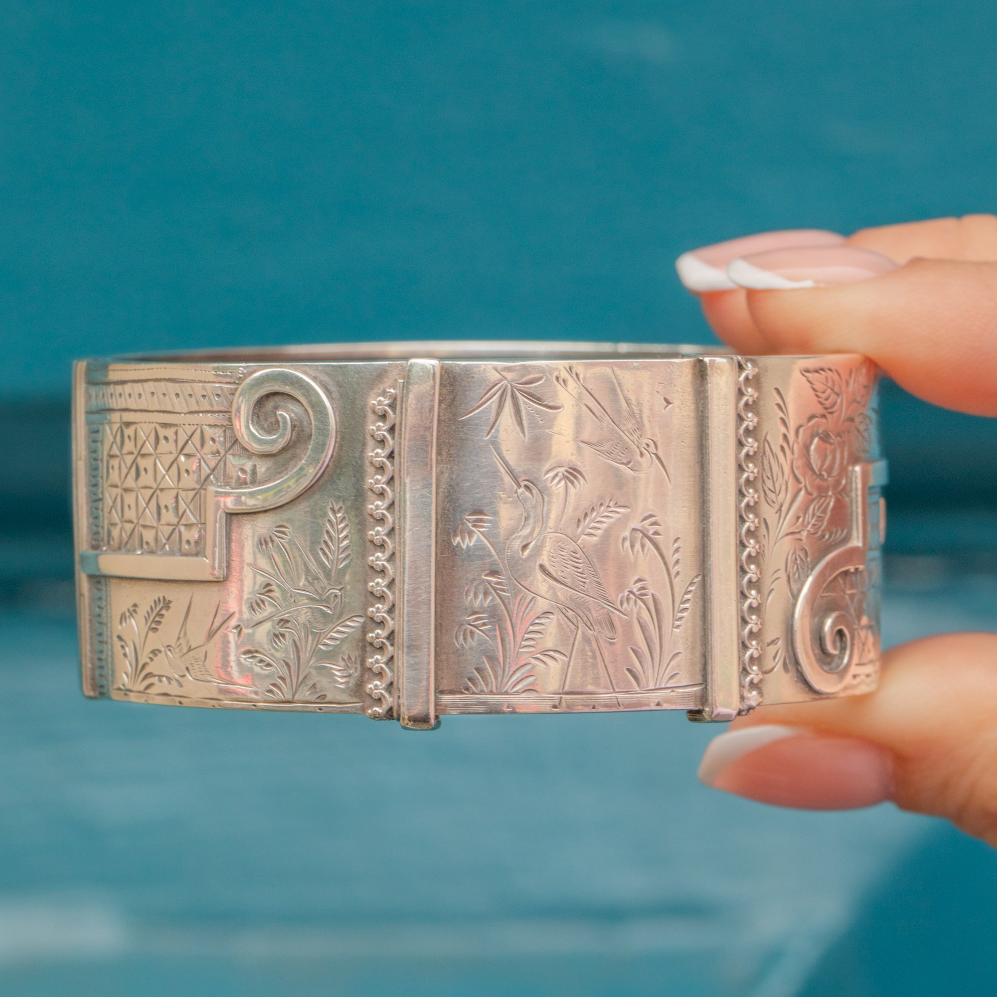 This Silver Victorian aesthetic engraved bangle is most impressive! Exquisitely engraved with floral motifs, geometric shapes and a elegant heron, she is a feast for the eyes. Crafted from a whopping 33.8 grams of Sterling Silver, this chunky bangle provides great coverage.