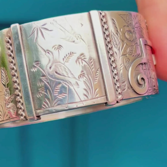 Victorian Aesthetic Silver Engraved Bangle- Heron Motif c.1882
