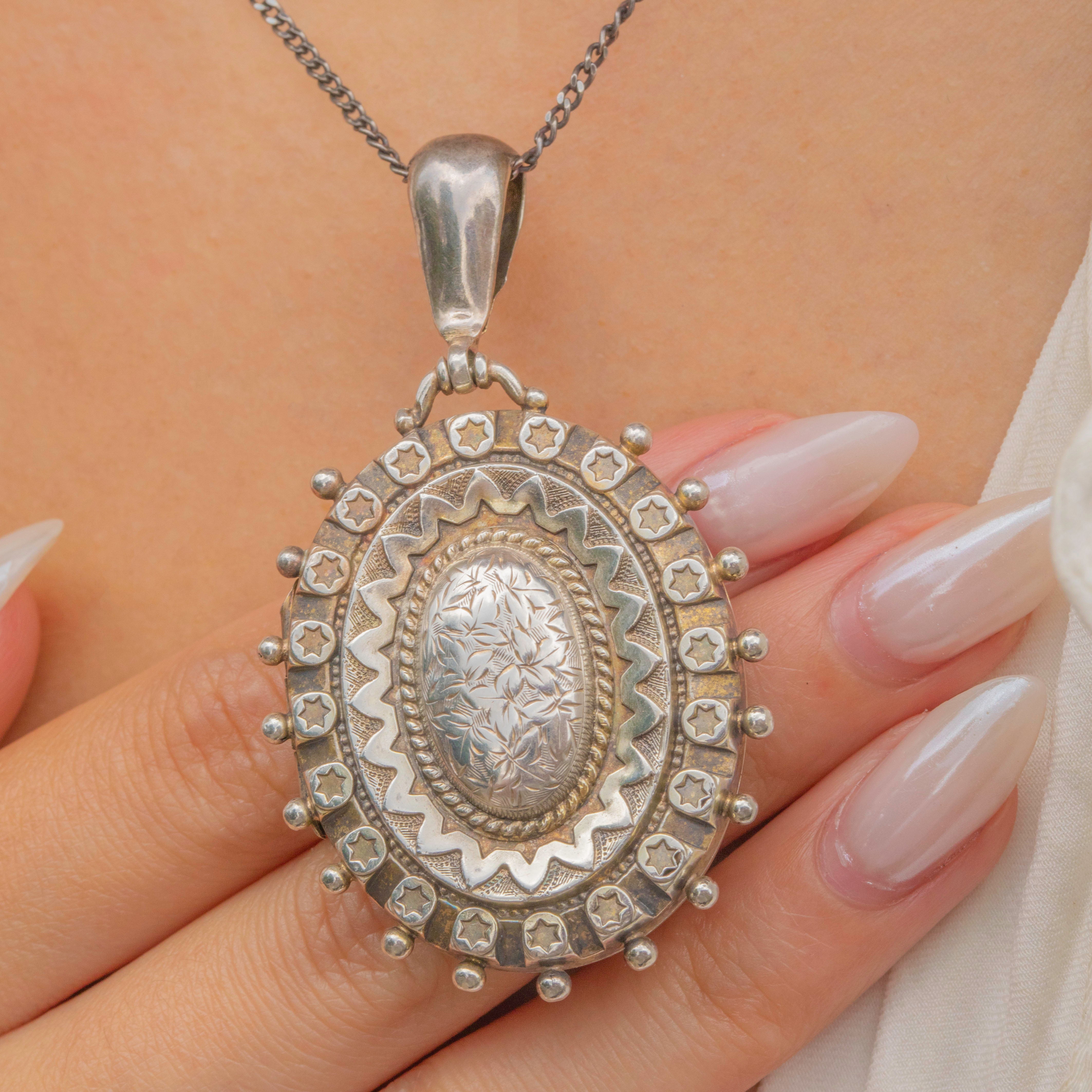 Victorian Aesthetic Silver Star Engraved Locket c.1885, Beaded Edge