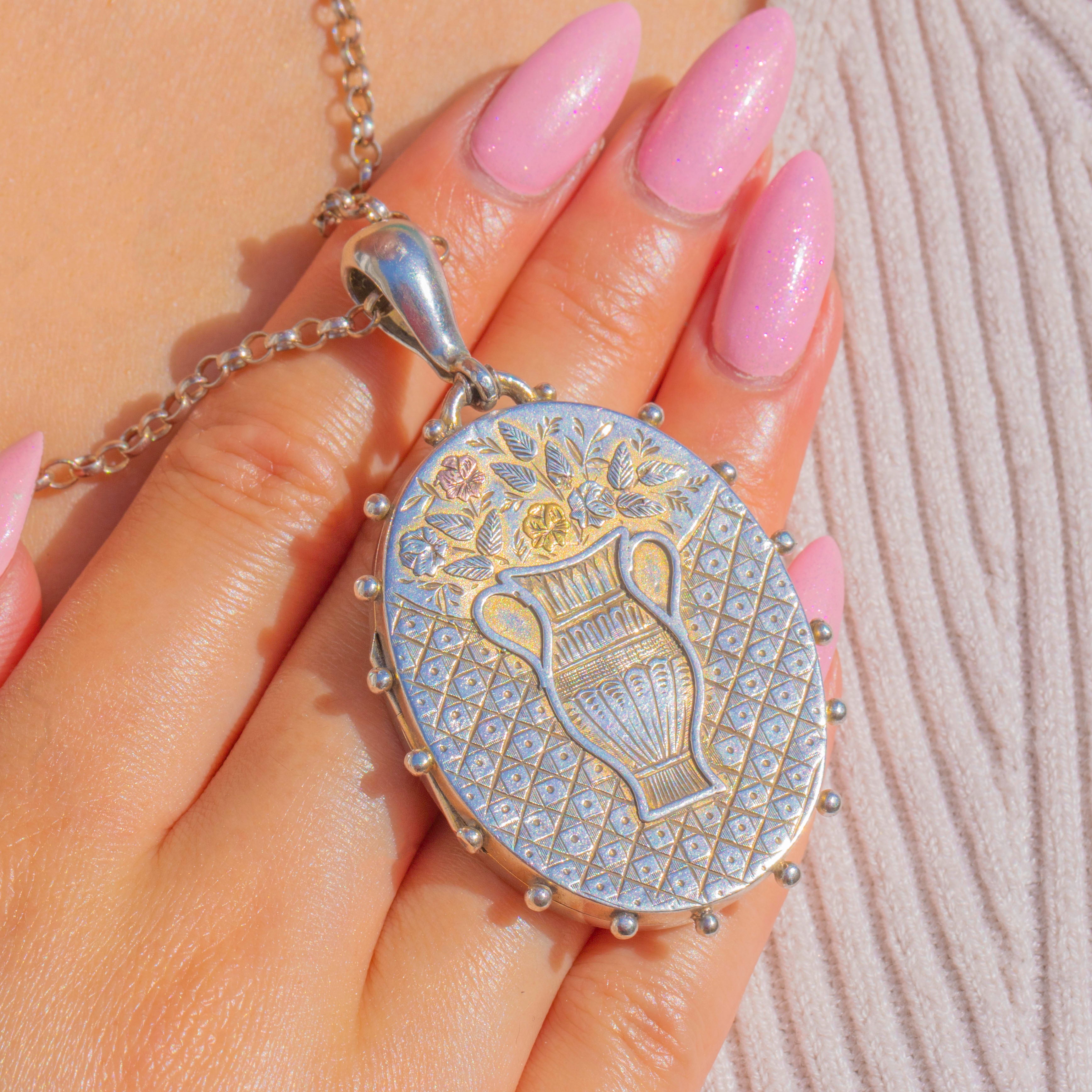 Aufwendig gestaltet und wunderbar romantisch: Dieses Victorian Aesthetic Medaillon aus Sterling Silber zeigt eine Vase, eingerahmt von stilisierten Blattranken und drapierten Bändern, umgeben von einer klaren, perlbesetzten Bordüre. Die Vorderseite ist kunstvoll mit einer strukturierten, guillochierten Oberfläche gearbeitet, die das erhabene Motiv zum Leuchten bringt, während die sanfte Patina des Silbers jeder Kontur Tiefe verleiht.