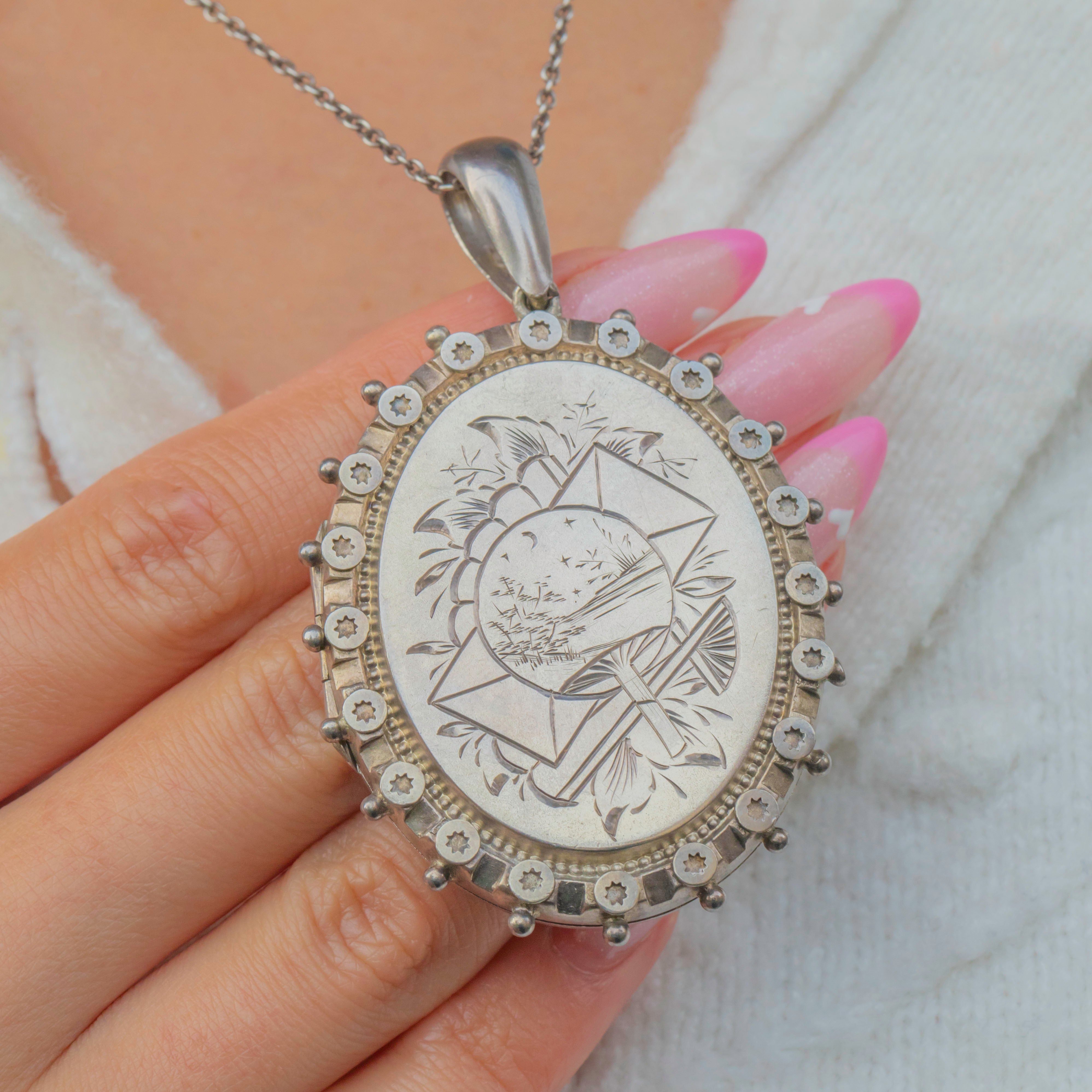This striking Victorian aesthetic Sterling Silver locket is the perfect statement piece for women who love to stand out from the crowd! Featuring a unique motif of an East-Asian pastoral scene inscribed onto a fan, this antique locket is crafted entirely from Sterling Silver.