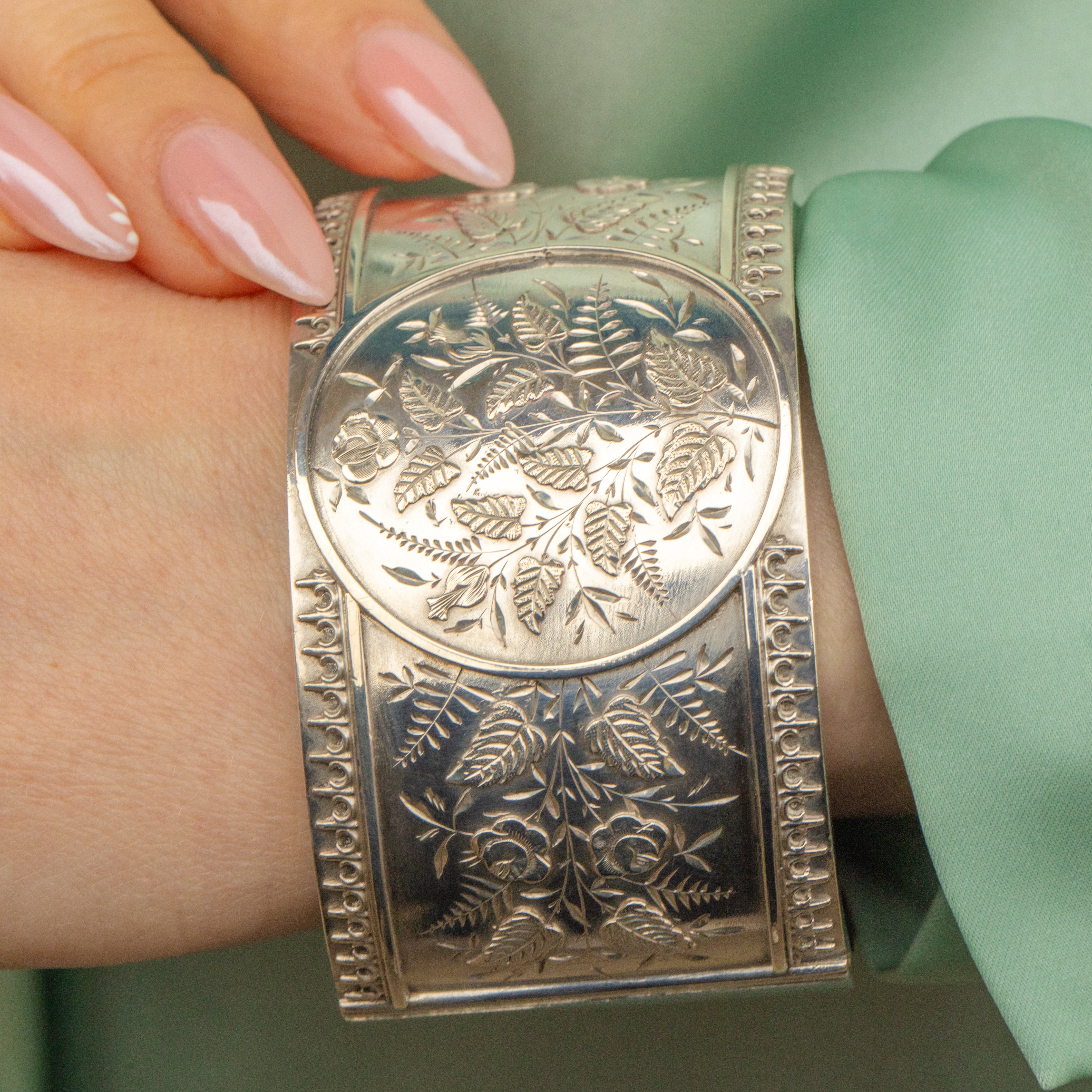 Interject drama into repertoire with this Victorian aesthetic Silver engraved cuff bangle! Her bold width is inlaid with a flourish of blooming roses and their entwining leaves, bordered by ornate and classically Victorian Silver work.