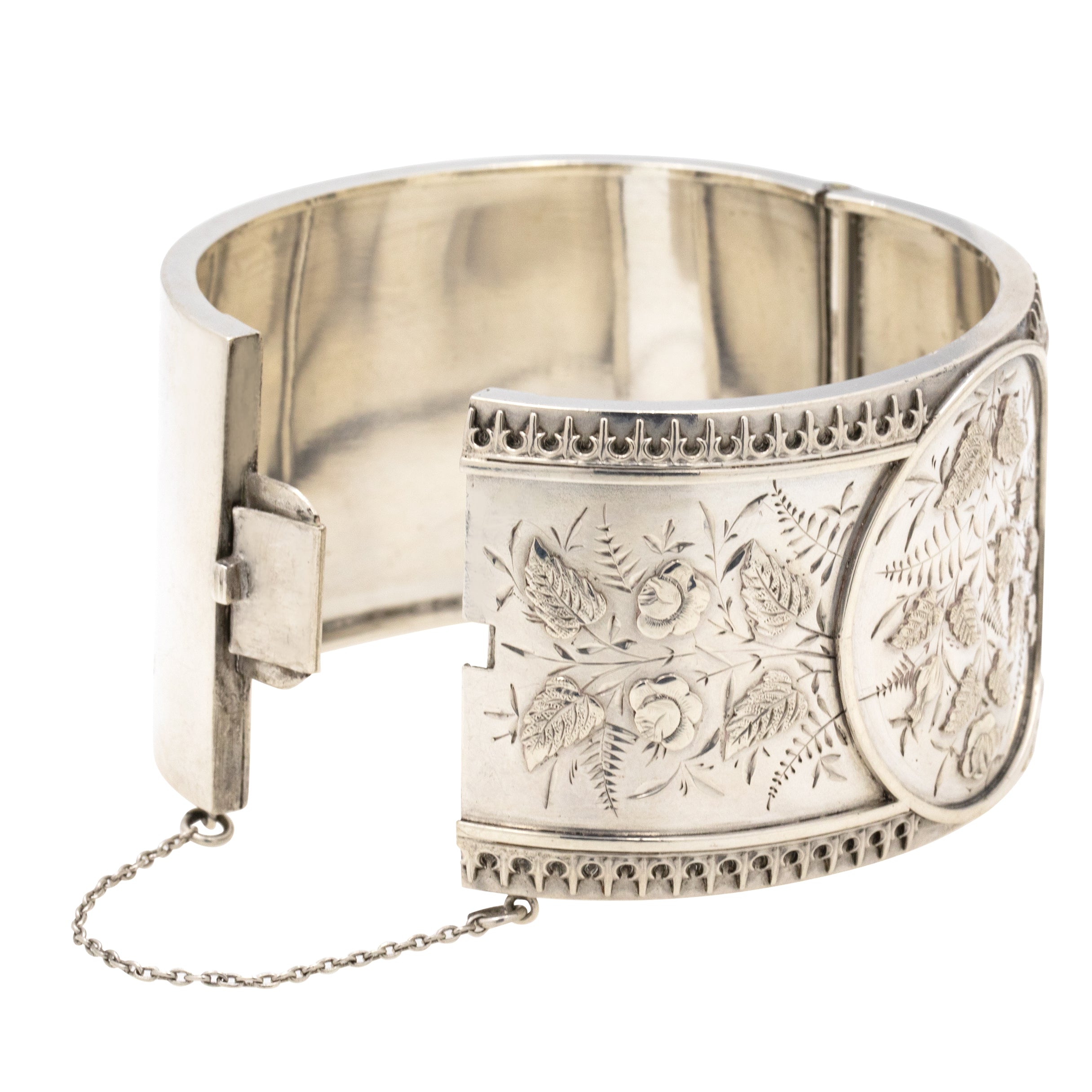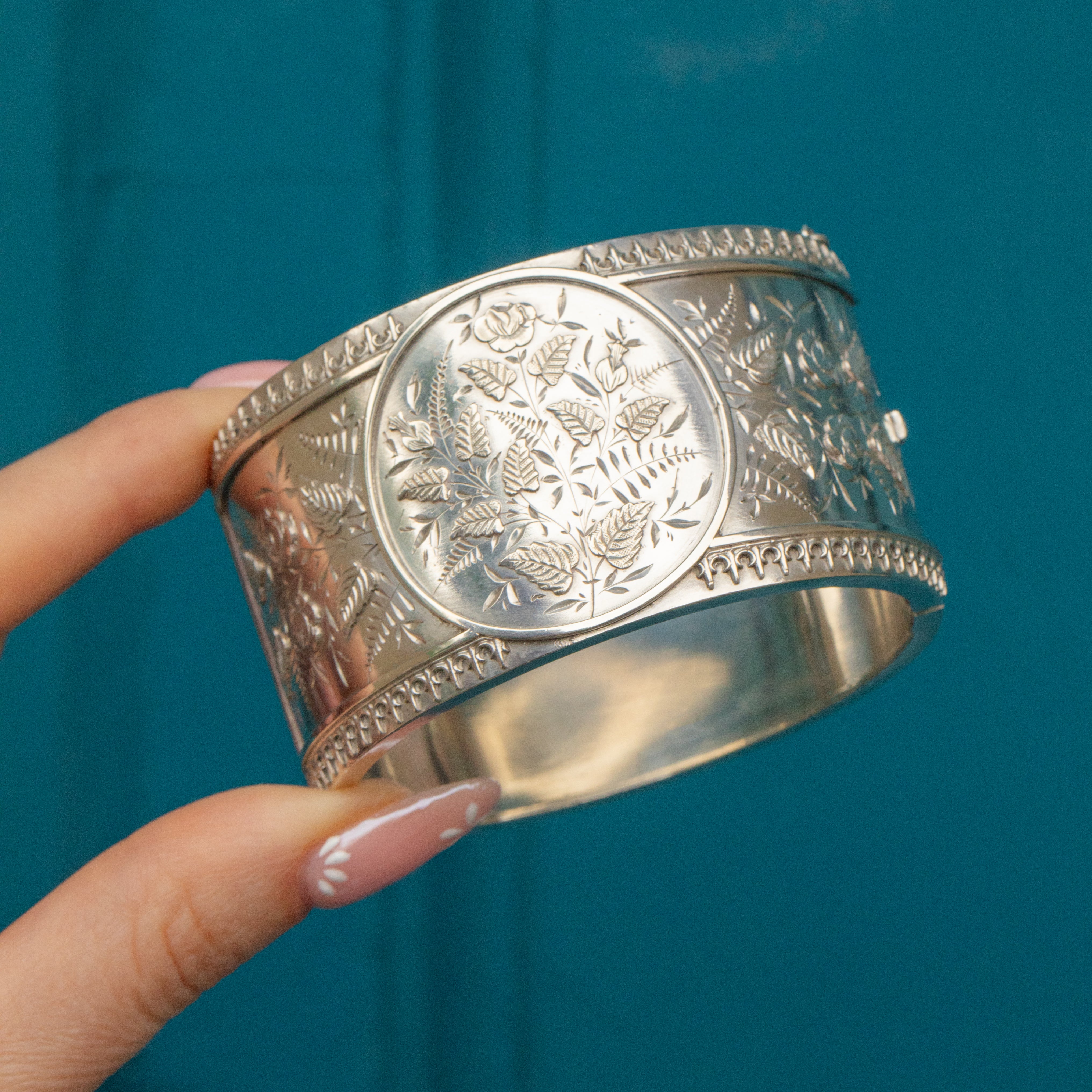 EXCELLENT. This Victorian aesthetic Silver engraved cuff bangle is in excellent condition. Her bangle front is bursting with crisp engravings and floral embellishments, with no damage to note. The Silver has a lustrous shine throughout, reflecting beneath the light beautifully. The clasp shuts with a satisfying 'click' and has a safety chain for a double layer of security!