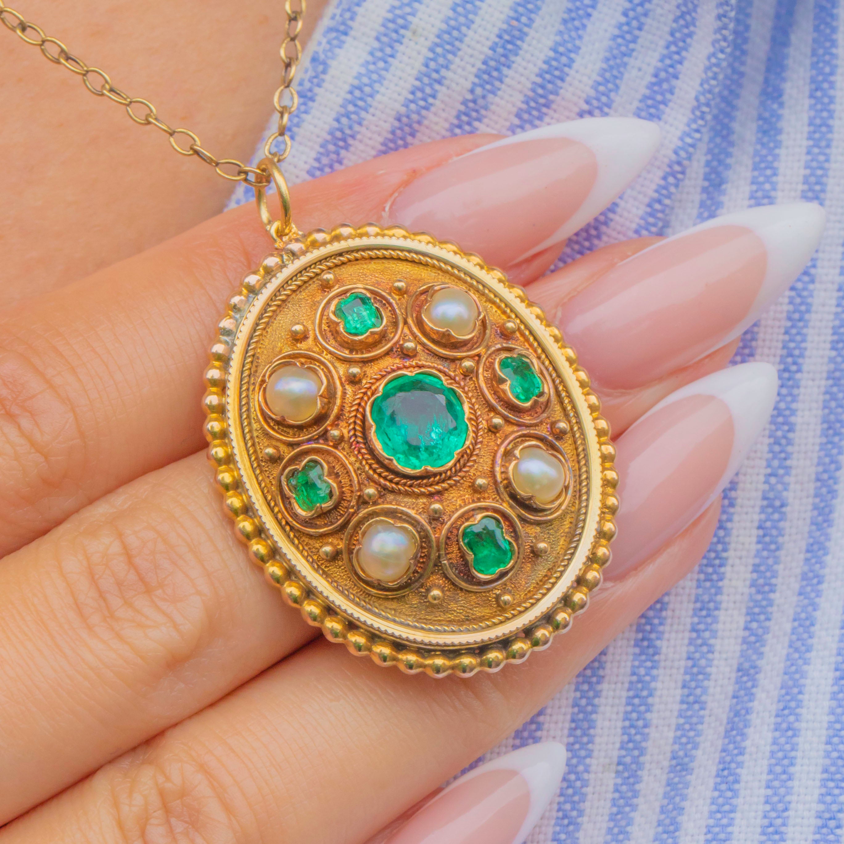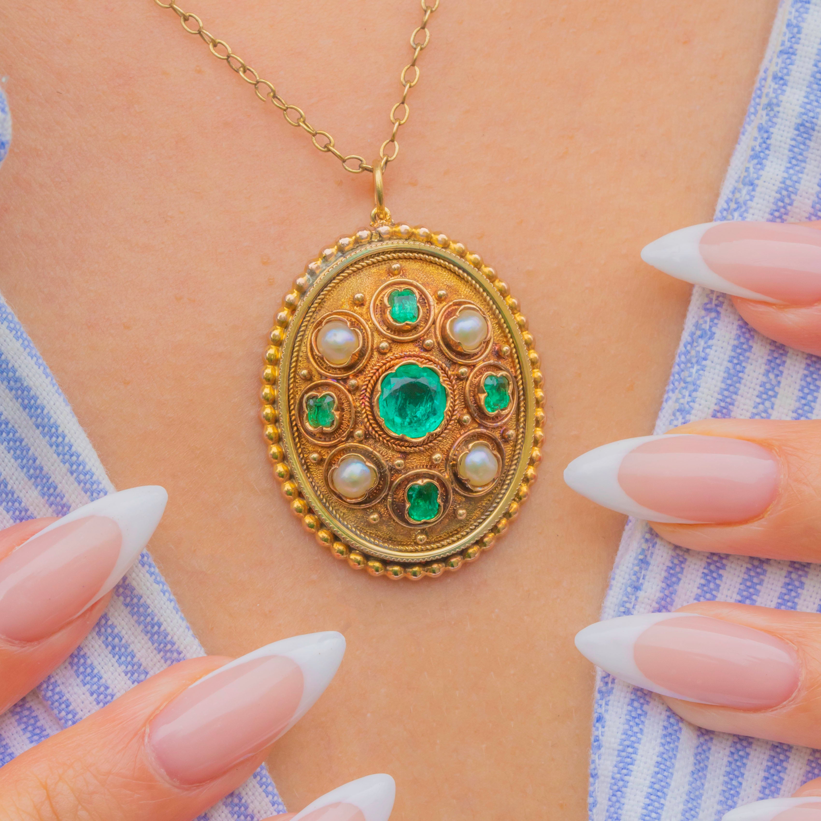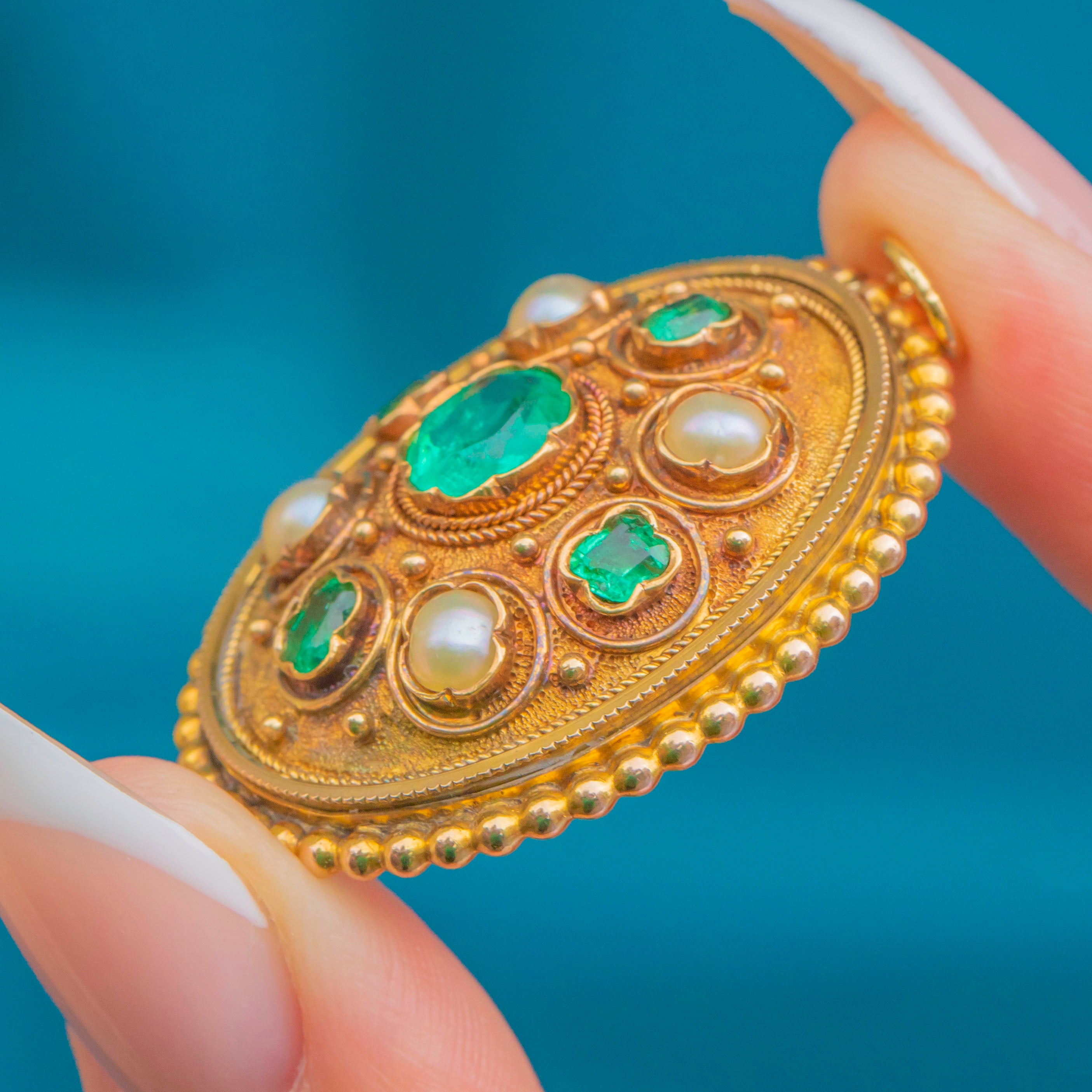 An opulent Victorian oval pendant worked in rich granulated Gold with rope and bead detail, set to the centre with a vivid round Emerald and accented by four emerald-cut Emeralds and creamy Pearls. The bold relief and beaded border are classic Etruscan Revival, giving striking texture and colour that reads beautifully on the neckline.