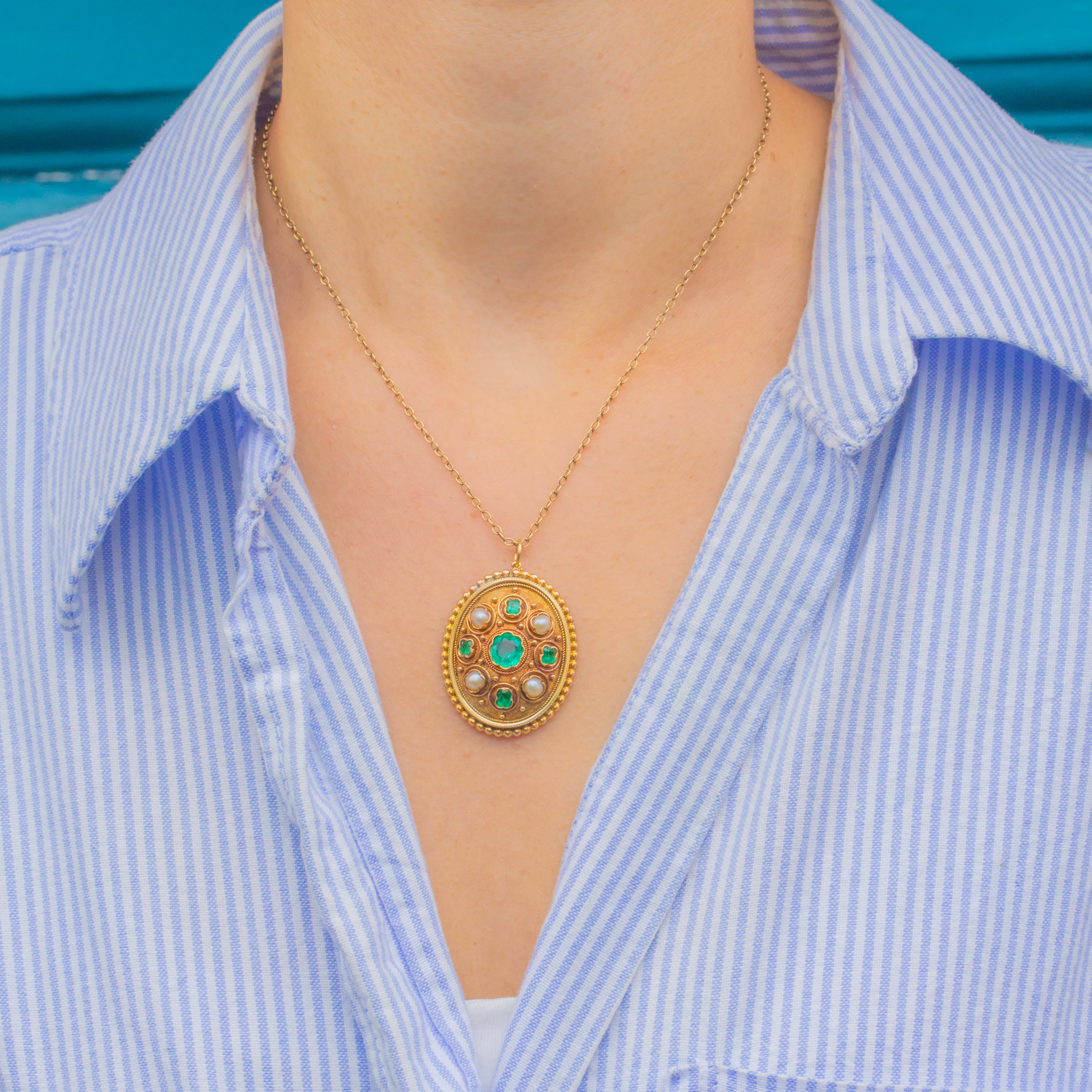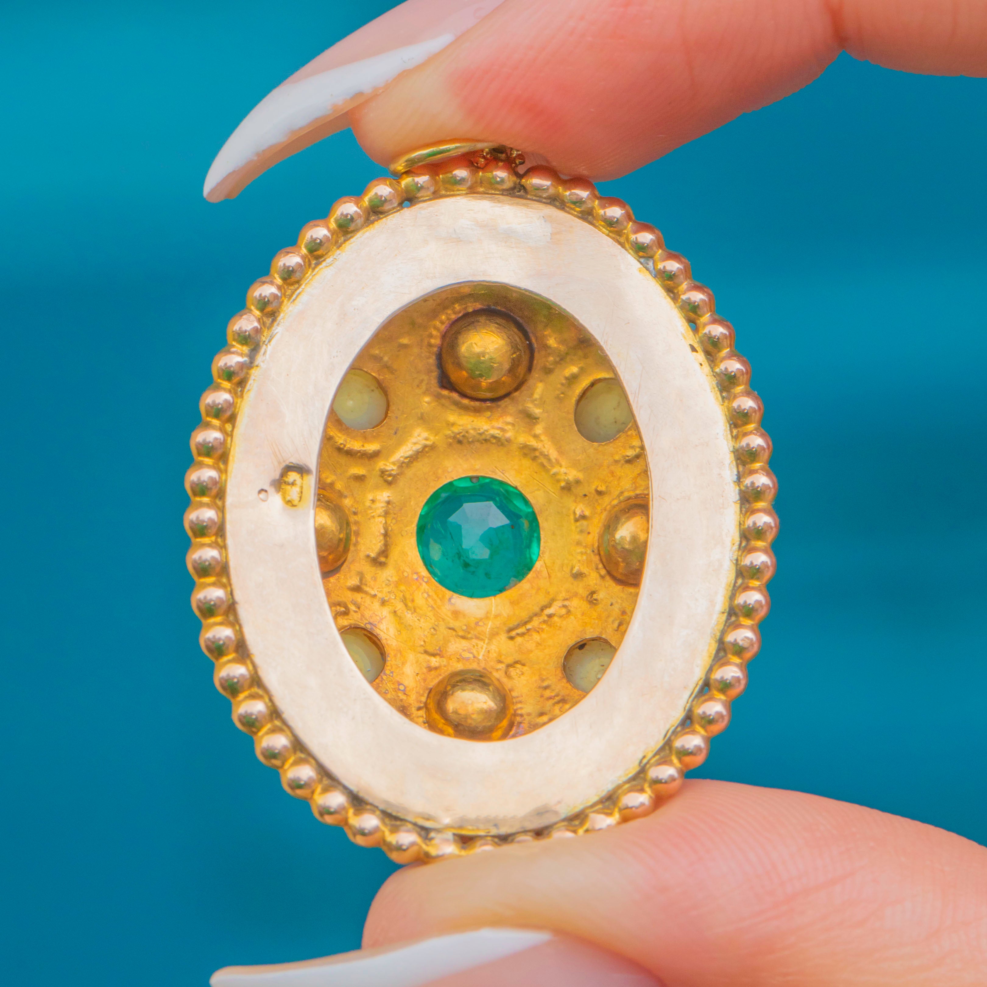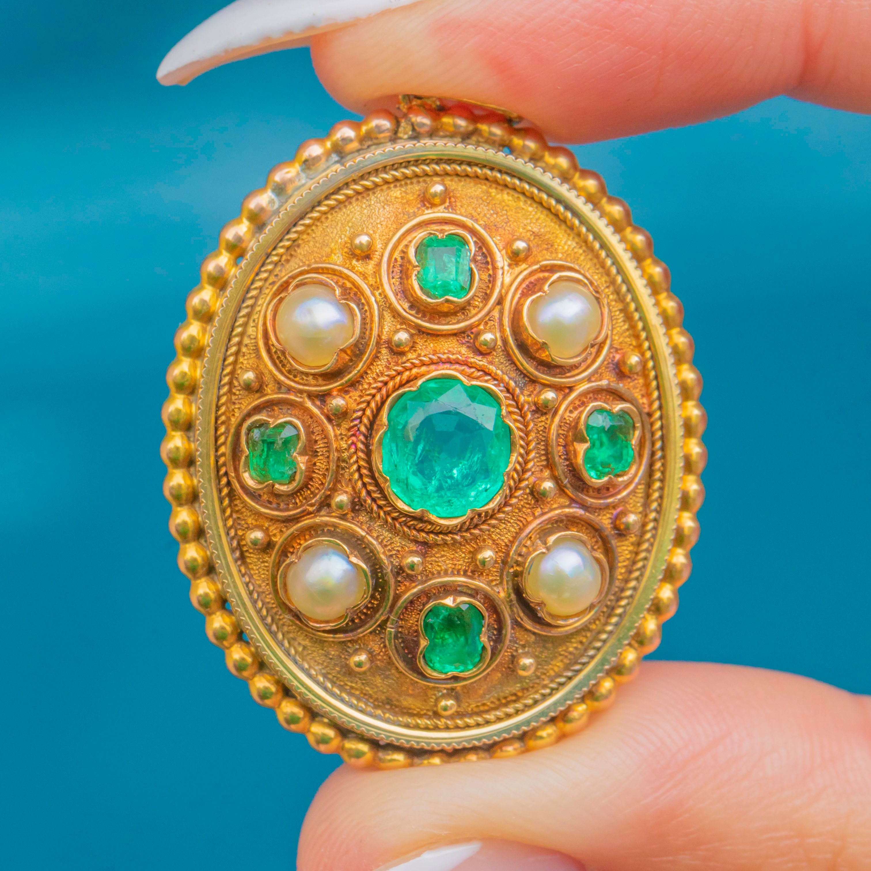 An opulent Victorian oval pendant worked in rich granulated Gold with rope and bead detail, set to the centre with a vivid round Emerald and accented by four emerald-cut Emeralds and creamy Pearls. The bold relief and beaded border are classic Etruscan Revival, giving striking texture and colour that reads beautifully on the neckline.