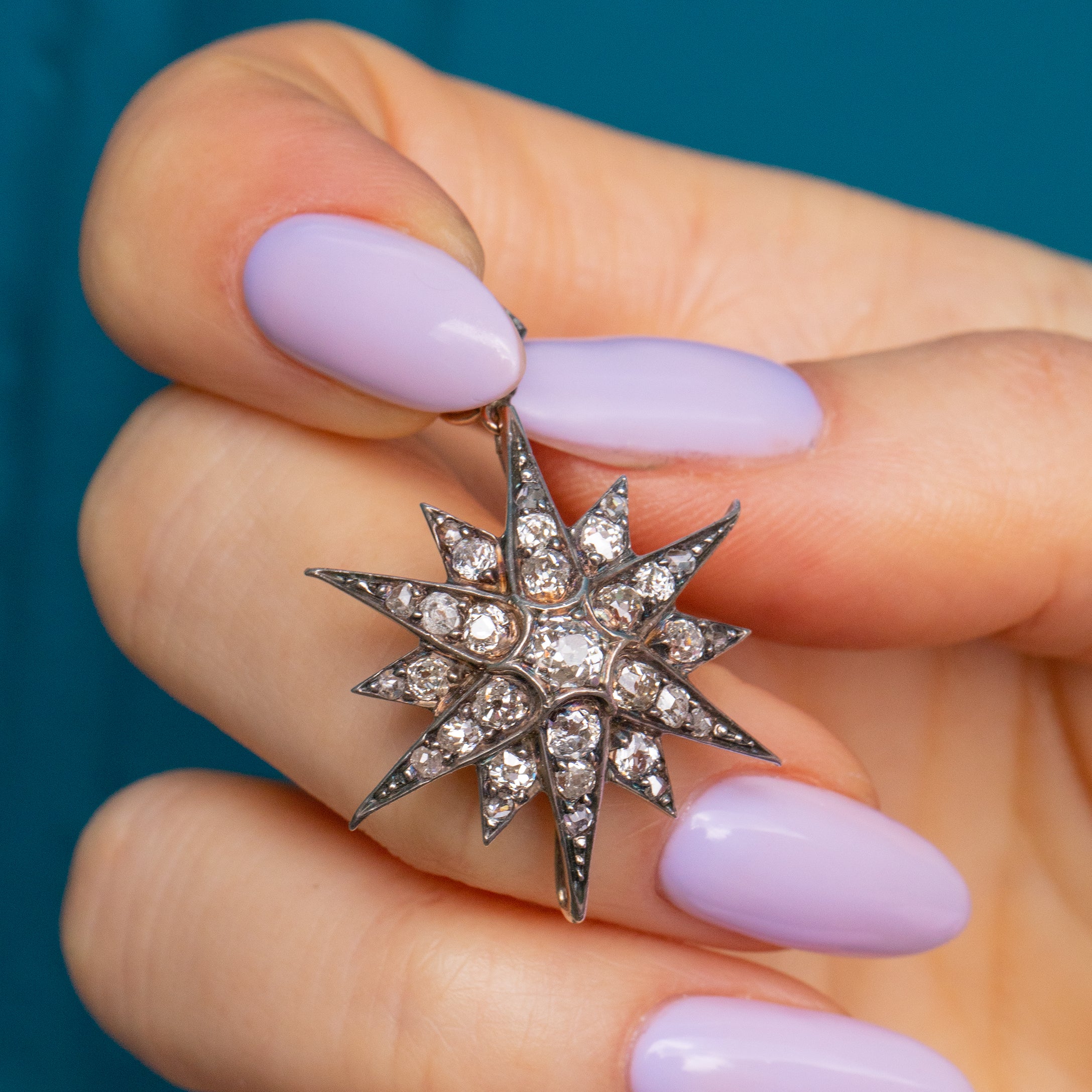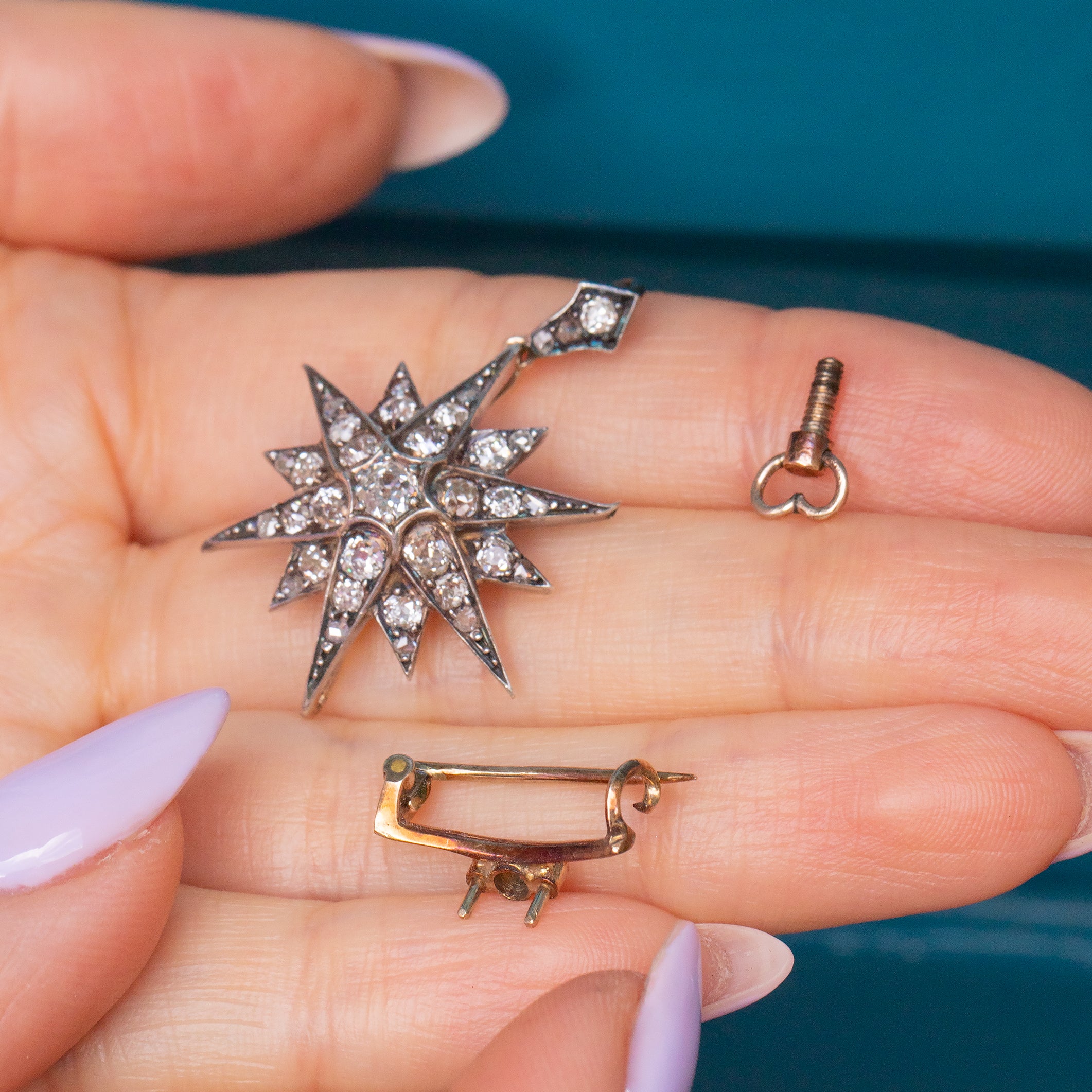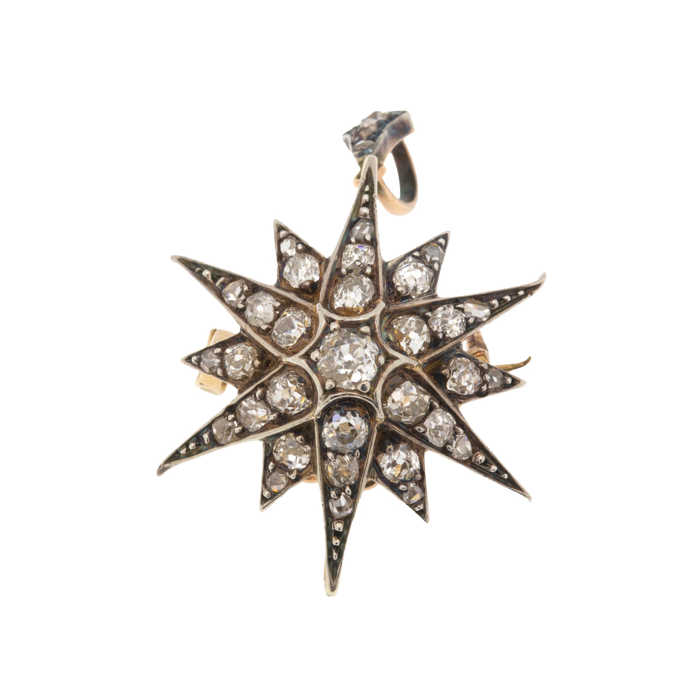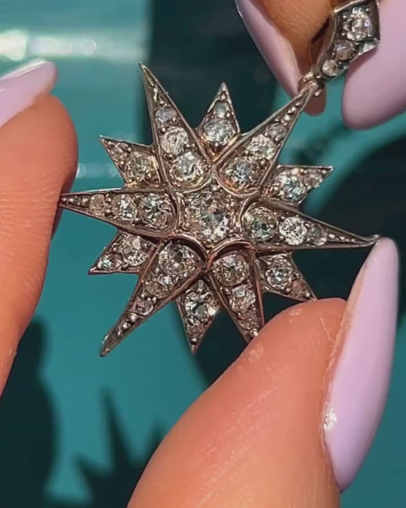 EXCELLENT. This Victorian Diamond star pendant is in excellent condition. The Diamonds are lively and gorgeous, with each carrying its own personality. The back of the pendant has removable brooch fittings allowing you to enjoy it solely as a pendant! The piece sits super comfortably against the skin, and given her grand age, there is very little wear to note. The Silver is lustrous and has accrued a light patina in areas adding to her antique charm. One of the little points has been a little bent upwards, but this is only noticeable under close inspection. The Diamond encrusted bale is firmly affixed and the brooch fittings are in perfect working condition allowing you to wear this spectacular piece of celestial jewellery with absolute confidence!