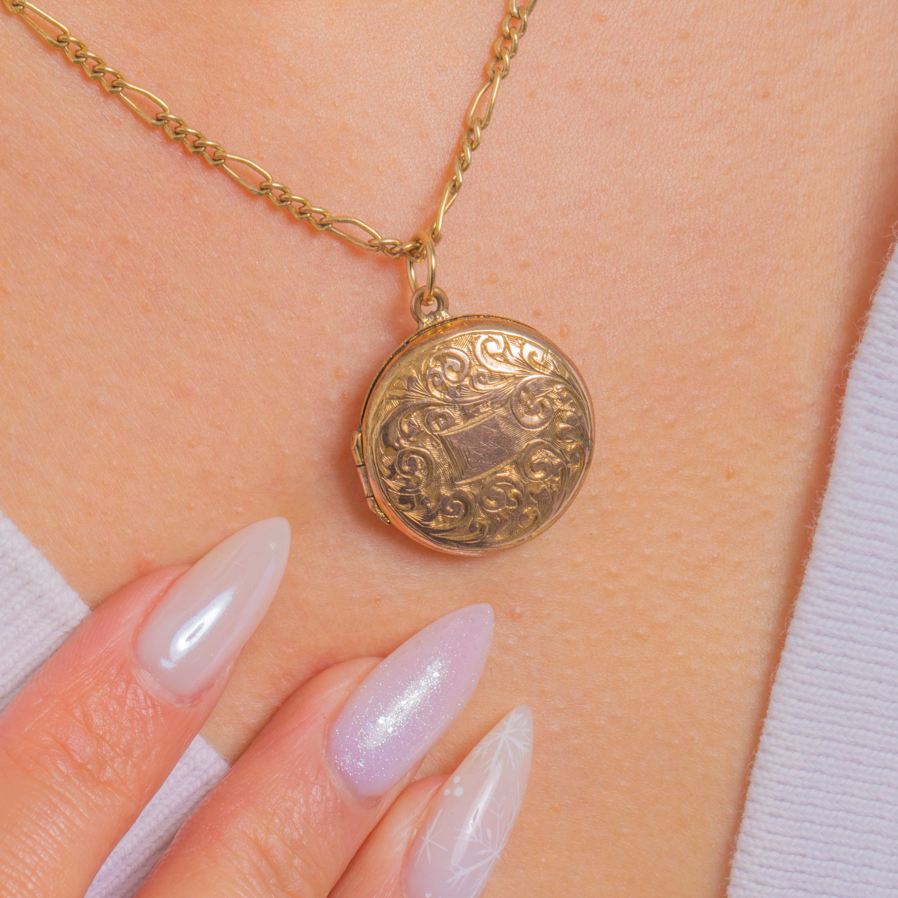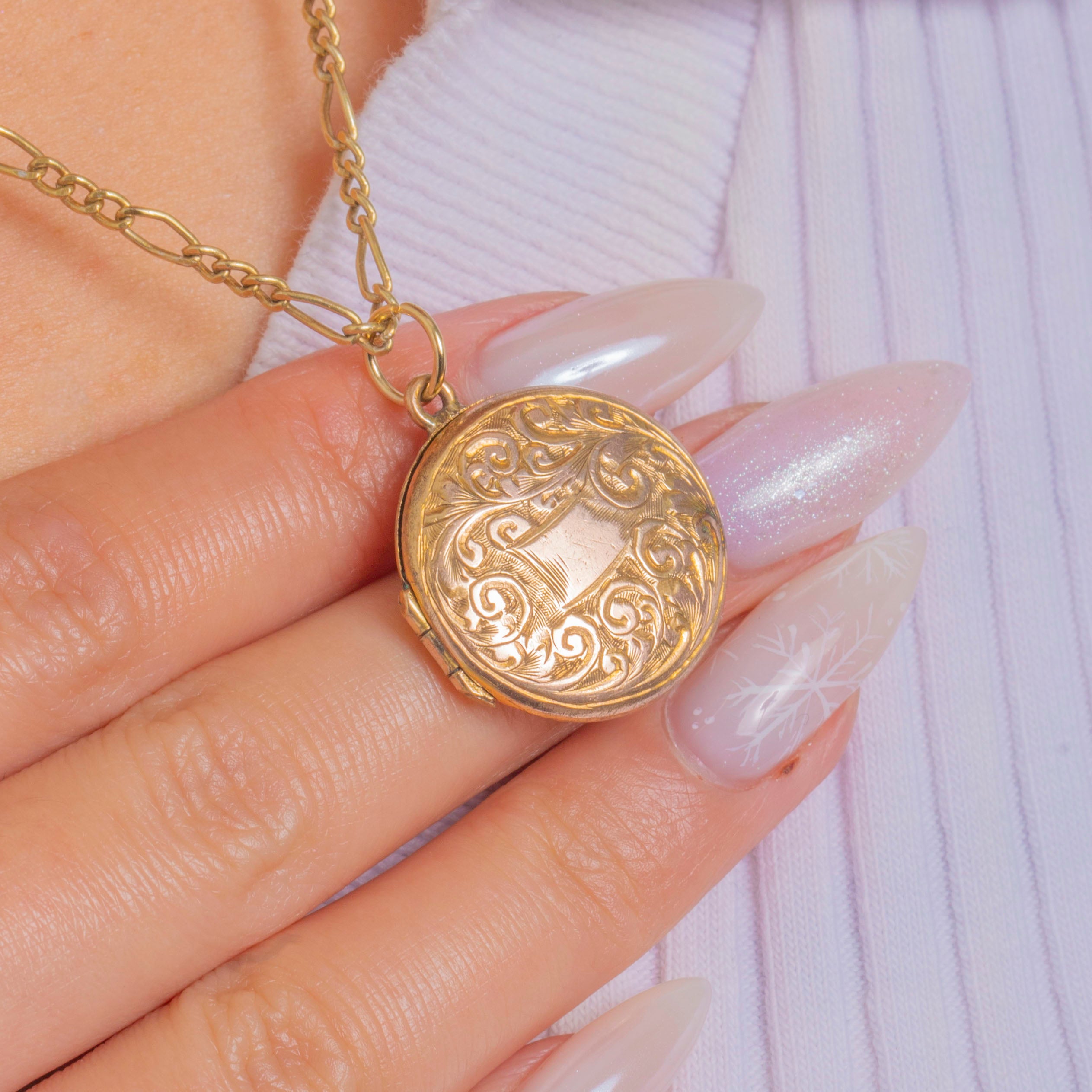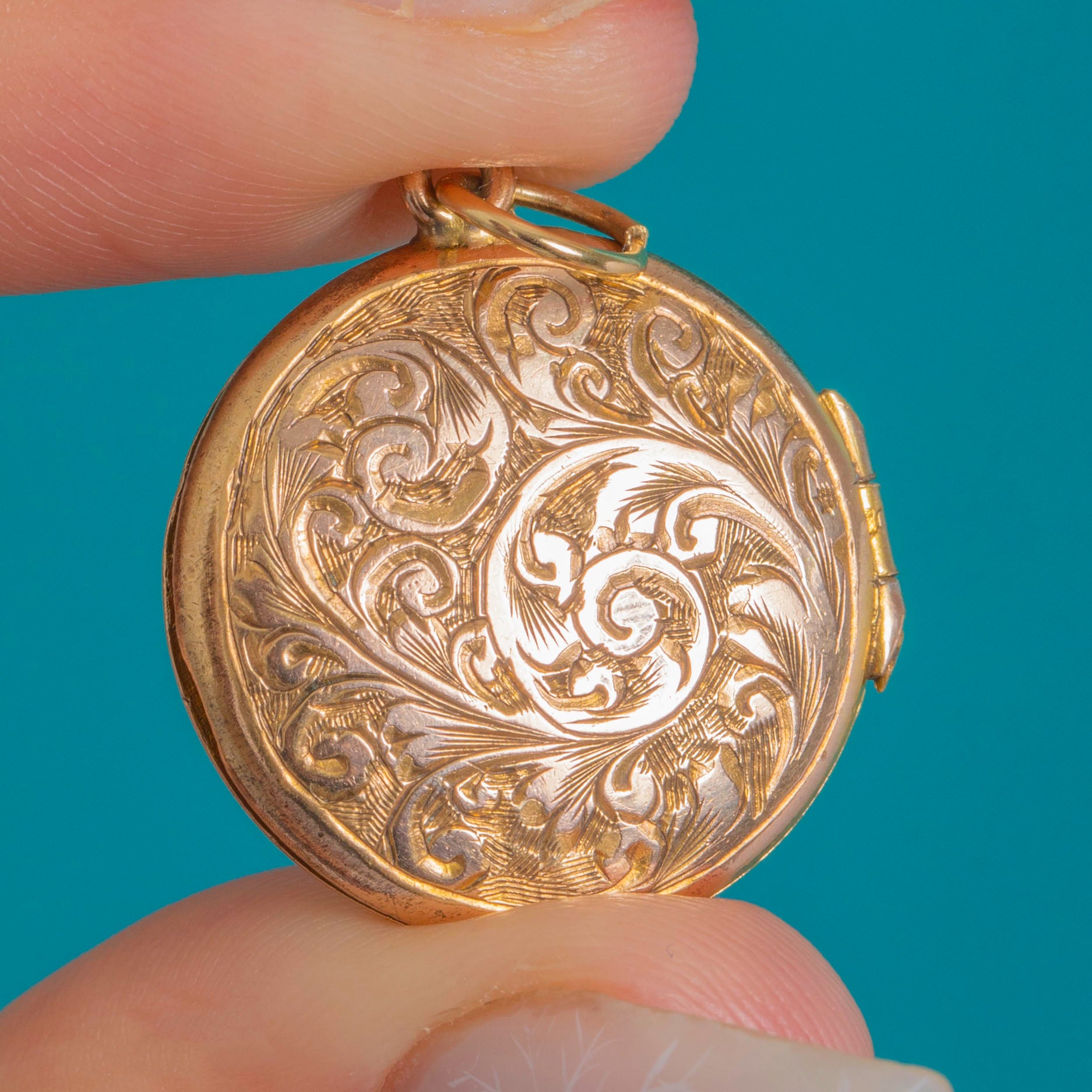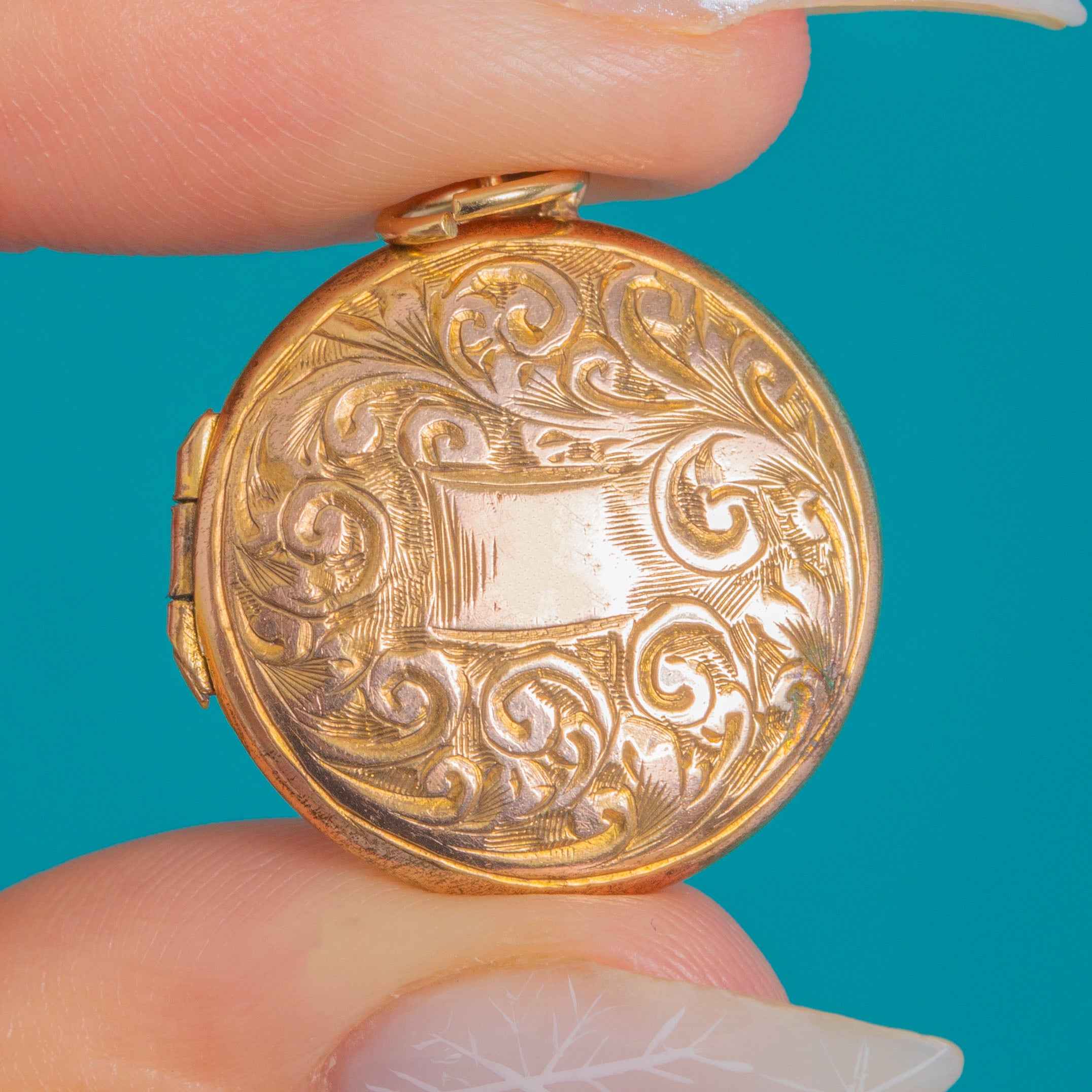 Ornate and romantic, this Victorian round locket is richly embellished with scrolling foliate engraving that curls around a central blank shield cartouche. Its warm, golden-toned brass hue and softly domed profile give it that quintessential turn-of-the-century charm.