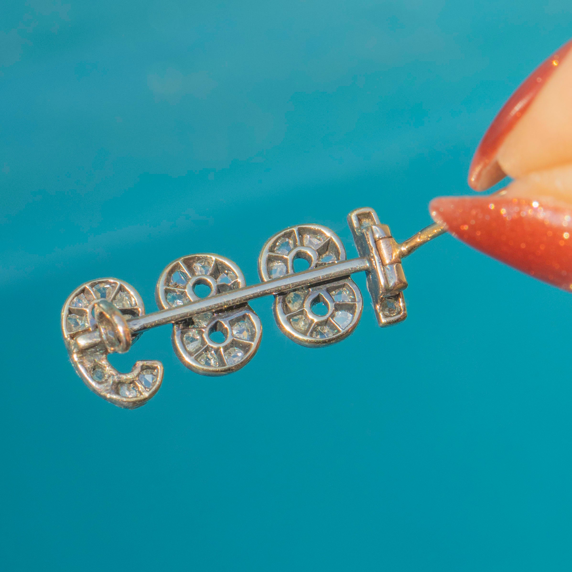VERY GOOD: This Victorian rose-cut Diamond 1889 brooch is in very good condition. Her rose-cut Diamonds are radiant and set securely within their settings. There are some signs of wear to the Silver settings commensurate with age, however, this does not affect her functionality. With her 9ct Gold pin in perfect working order, this Victorian brooch is a must-have!