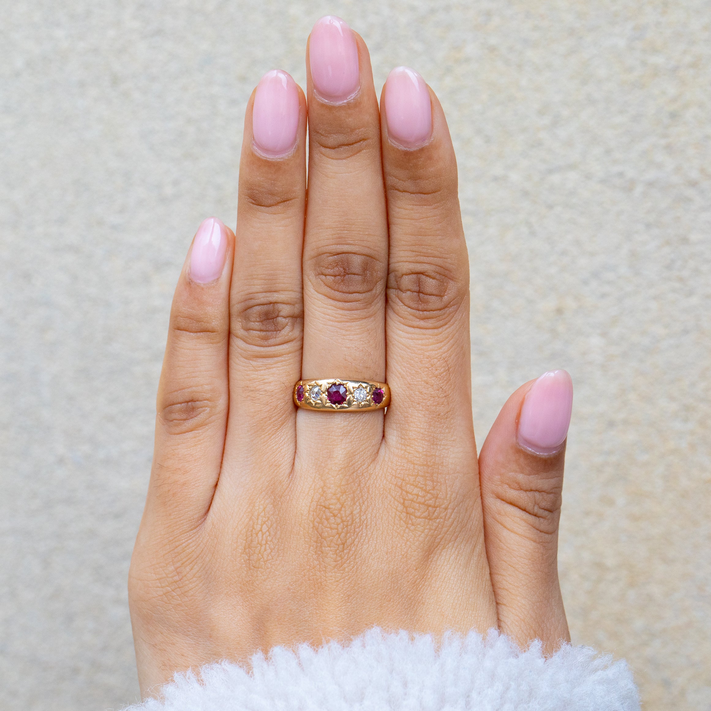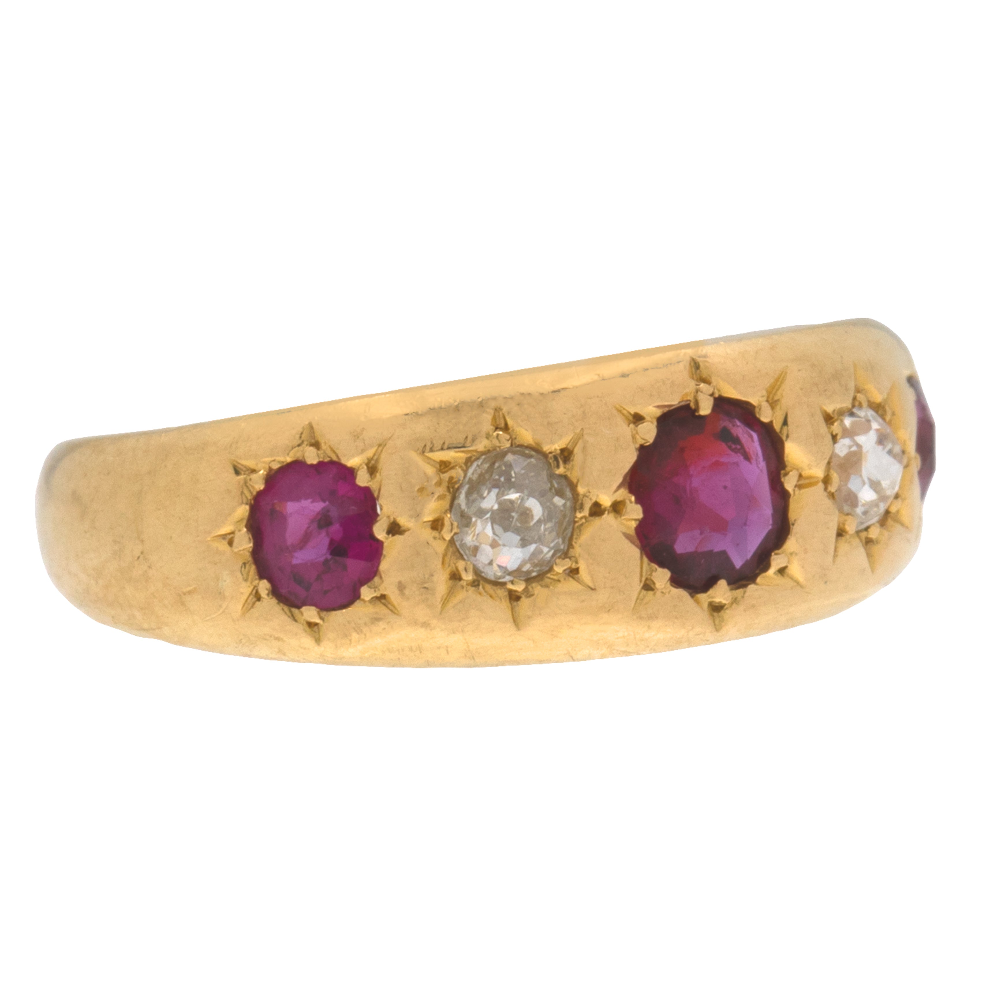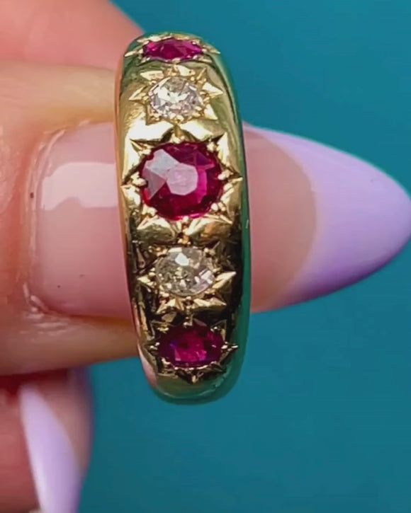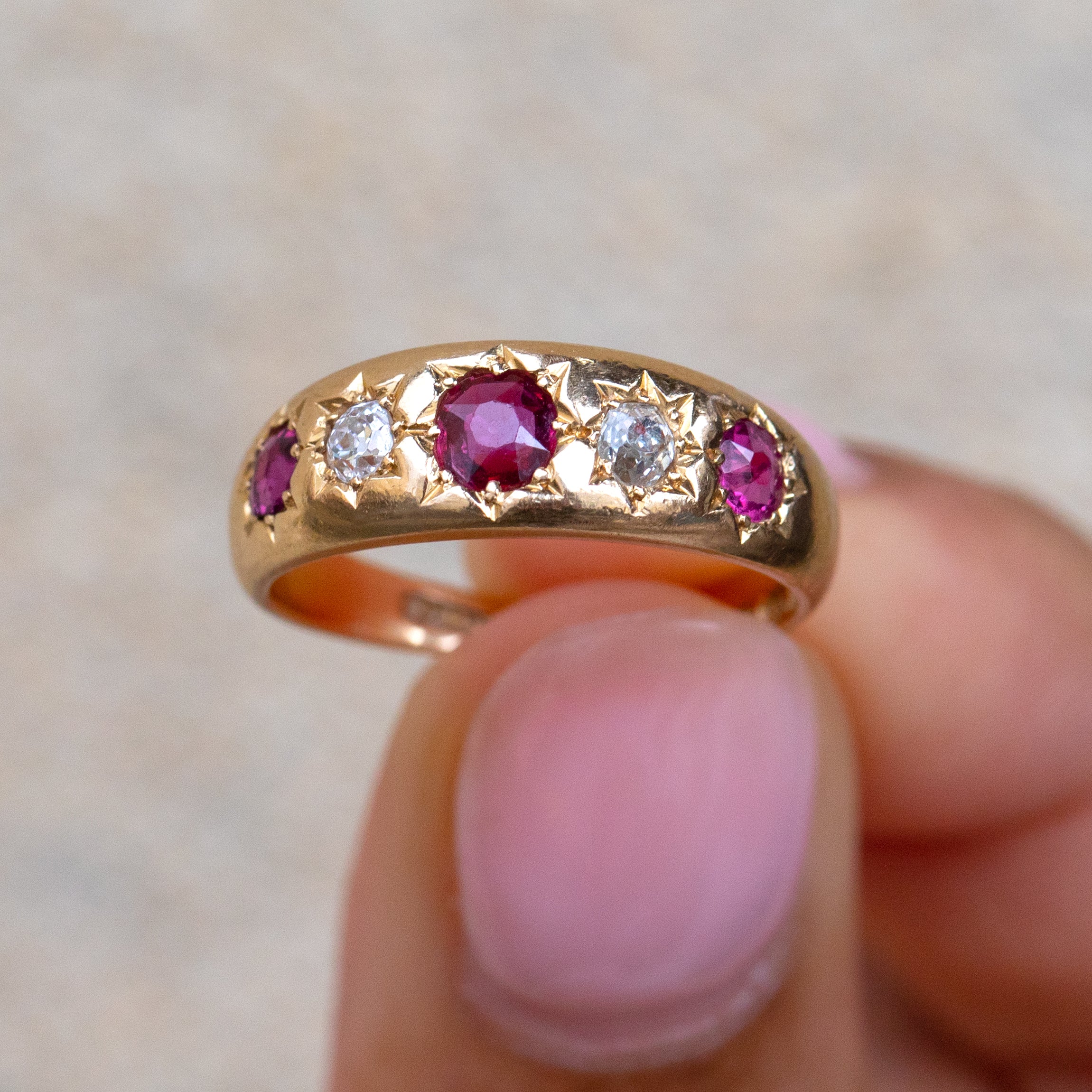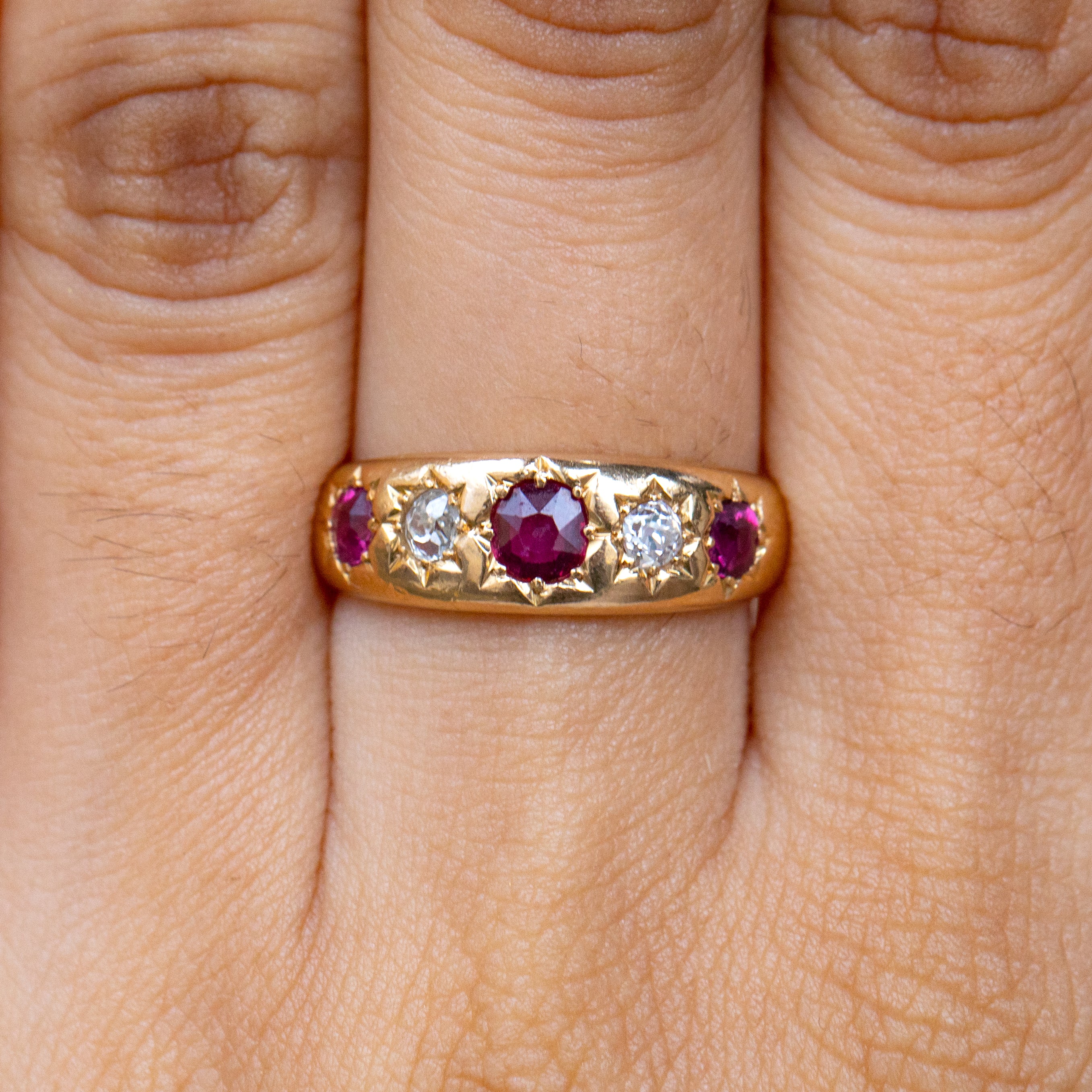 EXCELLENT: This Victorian 18ct Gold Ruby Diamond five stone Gypsy ring is offered in excellent condition. The Gold has a delicious buttery shine with only some minor wear on the inside of the band. The gemstones are secure in their settings, and the hallmarks are crisp! With proper care and maintenance, this antique gypsy ring will be cherished for generations to come.