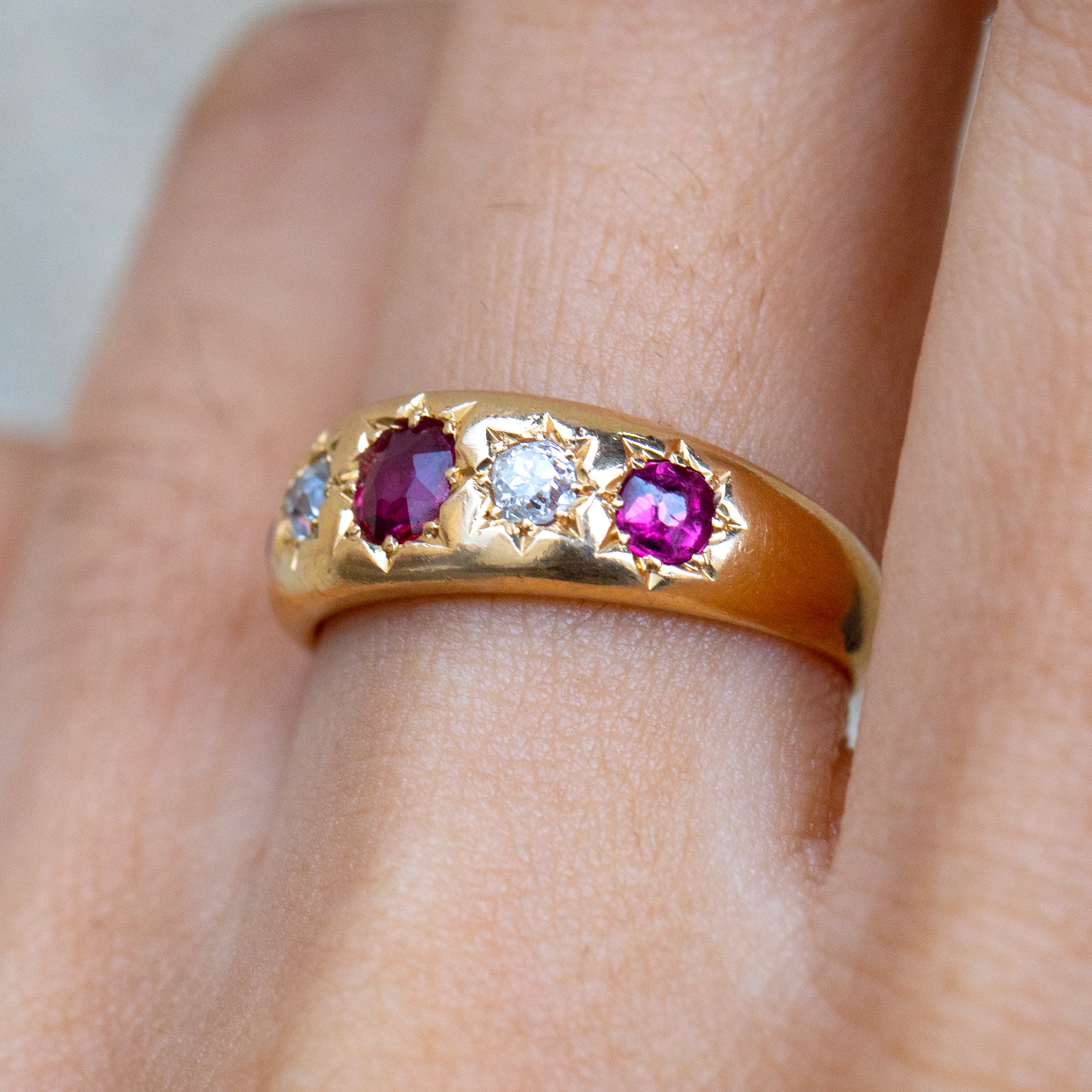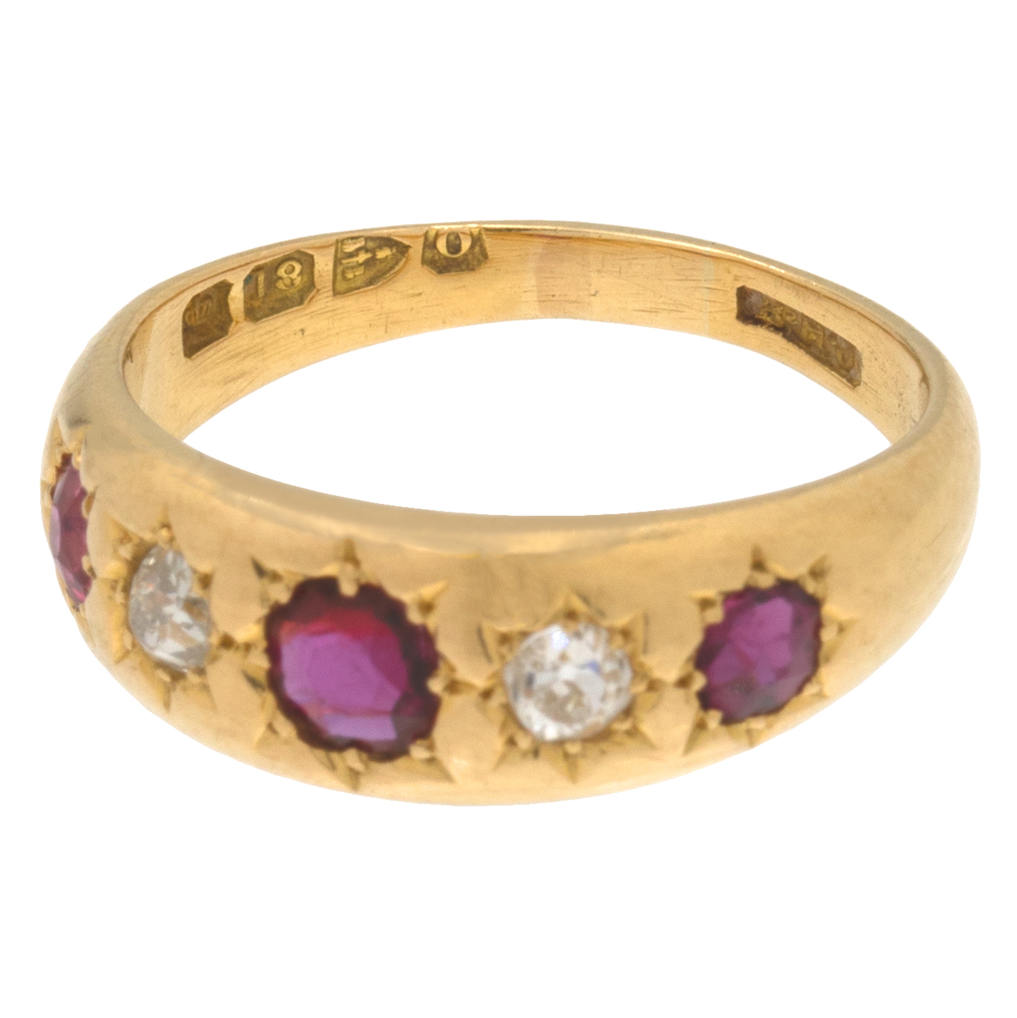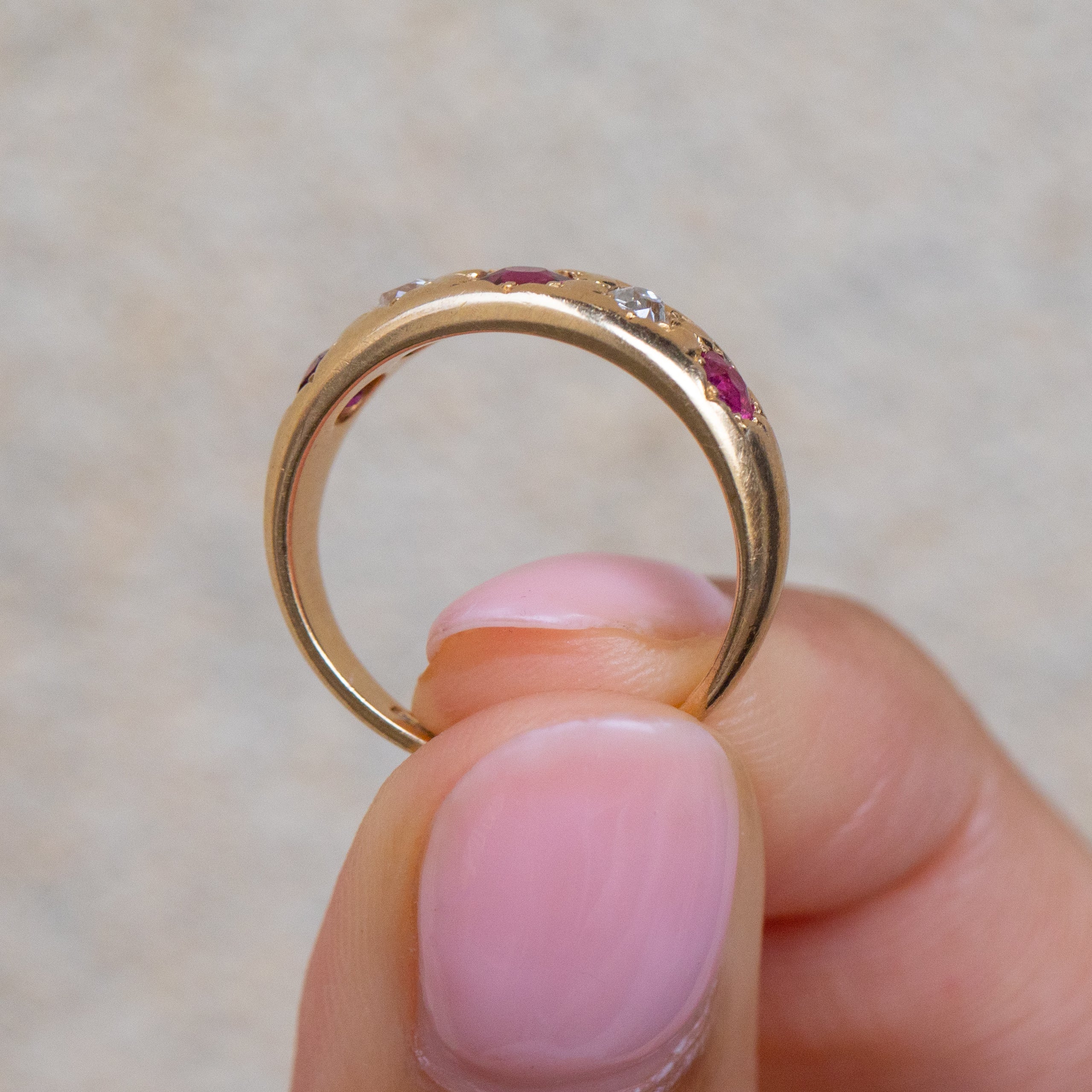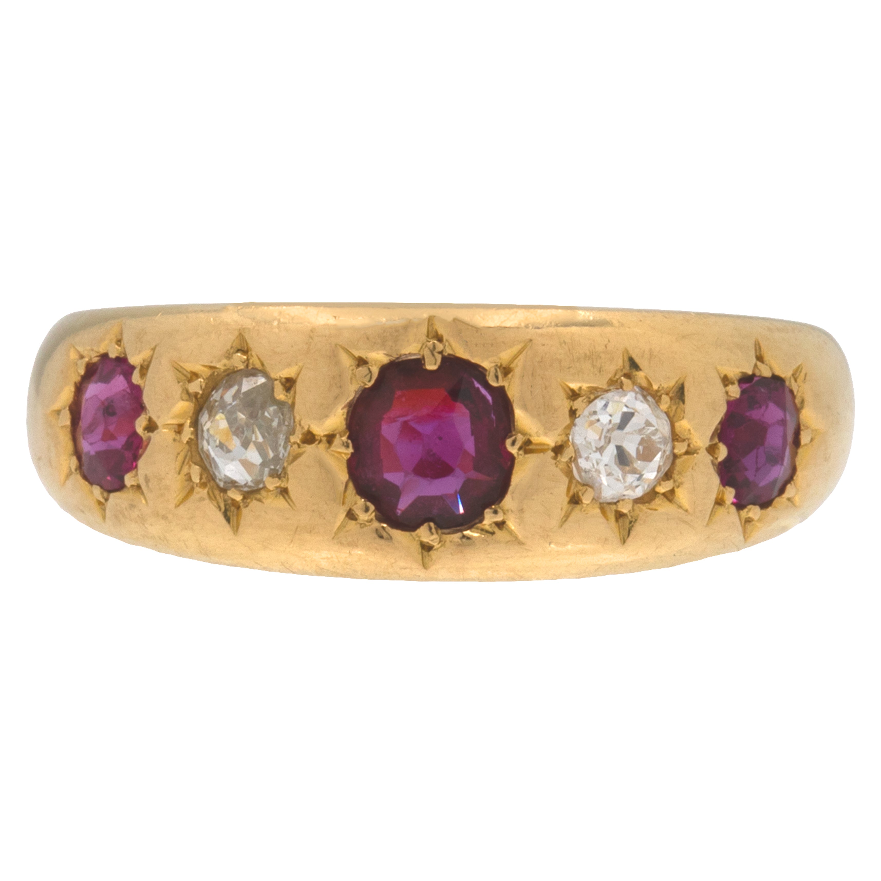 EXCELLENT: This Victorian 18ct Gold Ruby Diamond five stone Gypsy ring is offered in excellent condition. The Gold has a delicious buttery shine with only some minor wear on the inside of the band. The gemstones are secure in their settings, and the hallmarks are crisp! With proper care and maintenance, this antique gypsy ring will be cherished for generations to come.