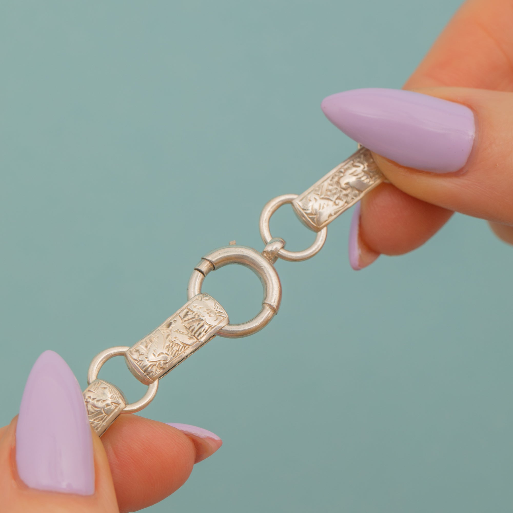 This exquisite Victorian engraved Silver book chain will add a touch of eclectic flair to any ensemble!