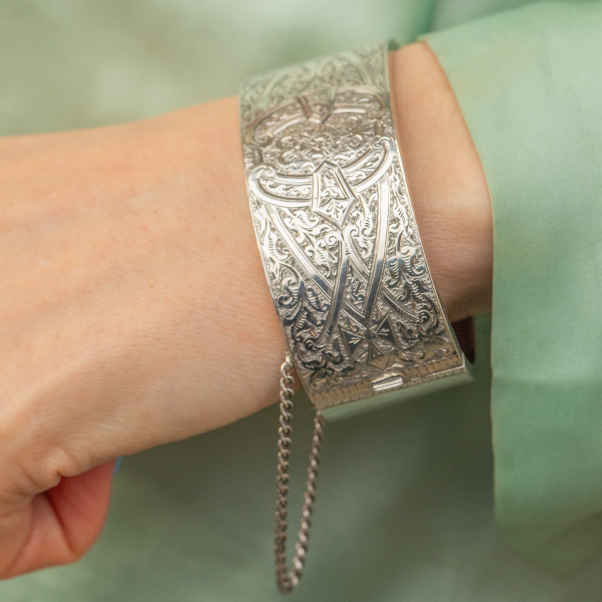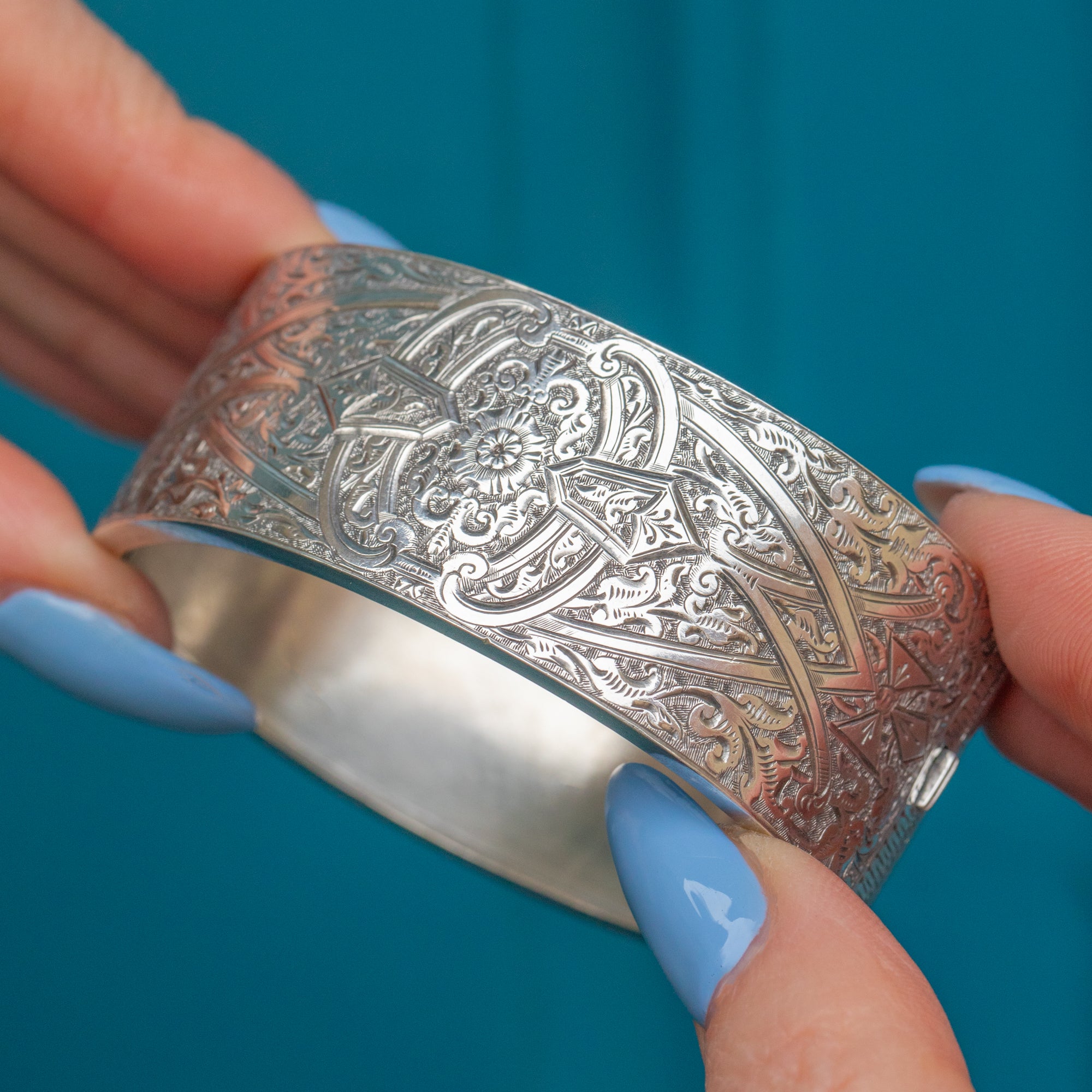 We adore this Victorian Silver engraved cuff bangle! The front of the bangle boasts beautifully engraved ornate details, with florals and bold geometric lines perfectly capturing the style of the Victorian era.