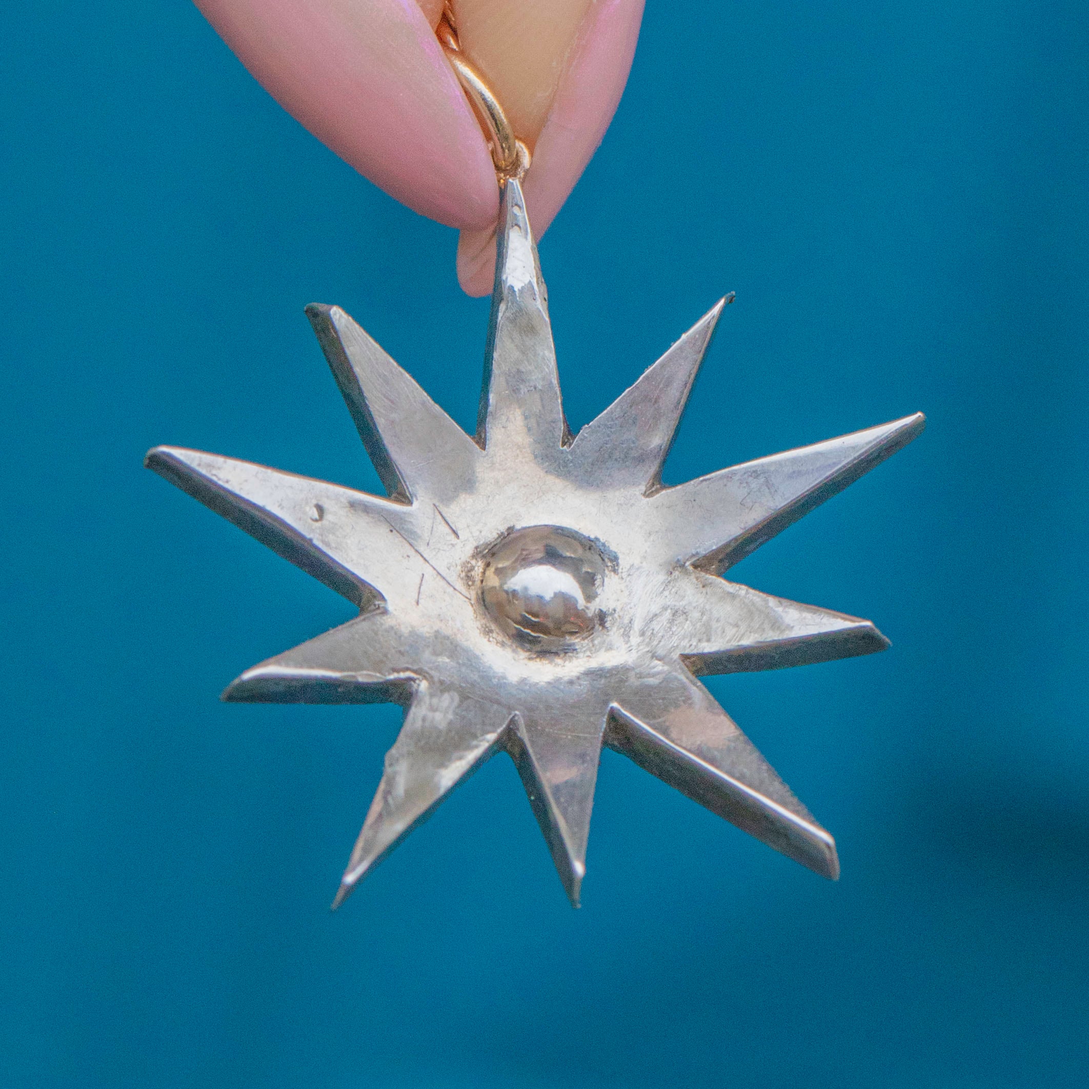 This bright Victorian Silver Paste star pendant will bring a bold celestial statement to your décolletage! This antique pendant is inalid with a selection of scintillating Diamond Paste, emphasised by the patina that has accrued within the Sterling Silver settings creating a dramatic contrast.