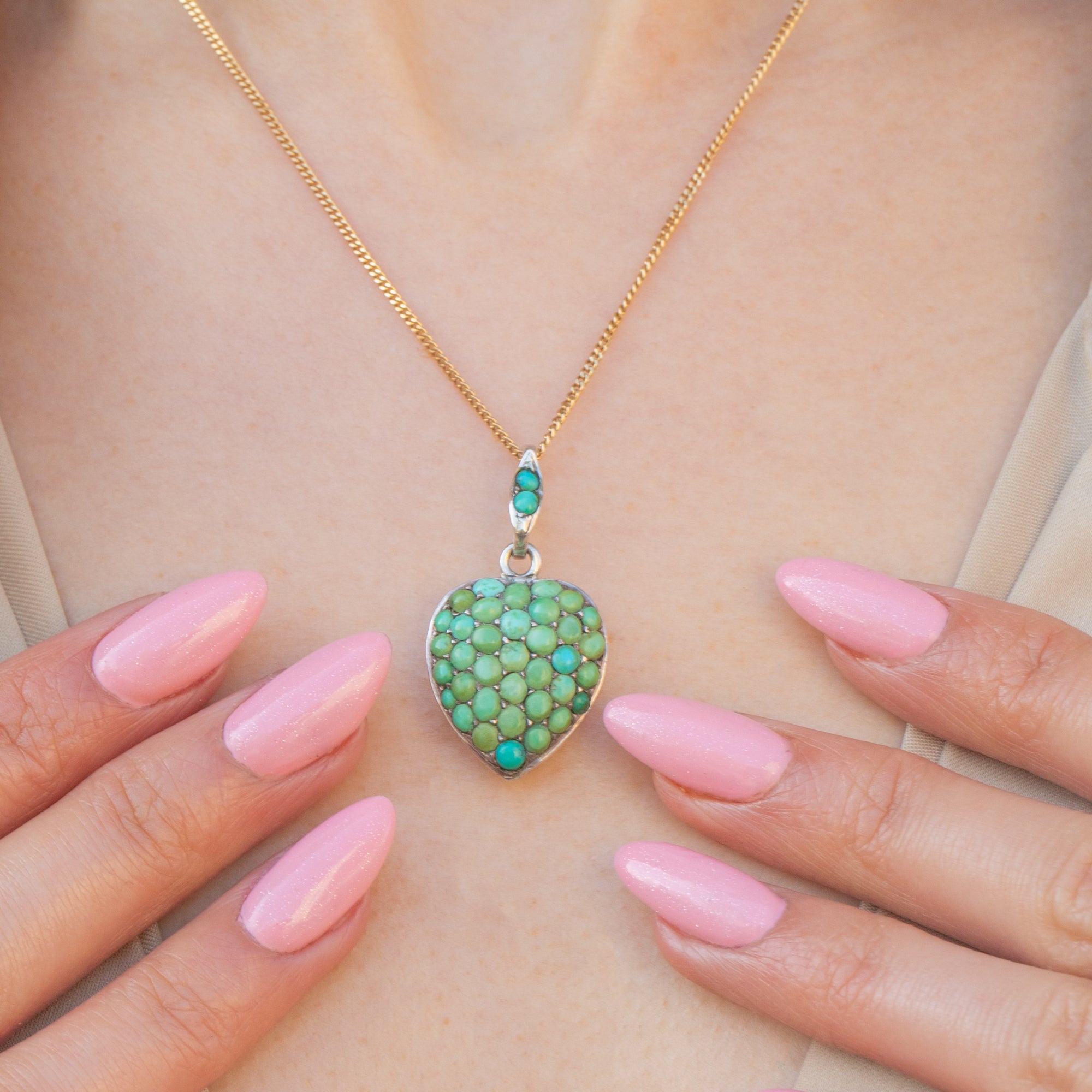 Crafted from glossy Sterling Silver, this Victorian pavé heart pendant is adorned with an array of Turquoise stones, each with a distinct and unique blue-green saturation. She is complete with a locket back, perfect for holding a cherished photograph close to your heart.