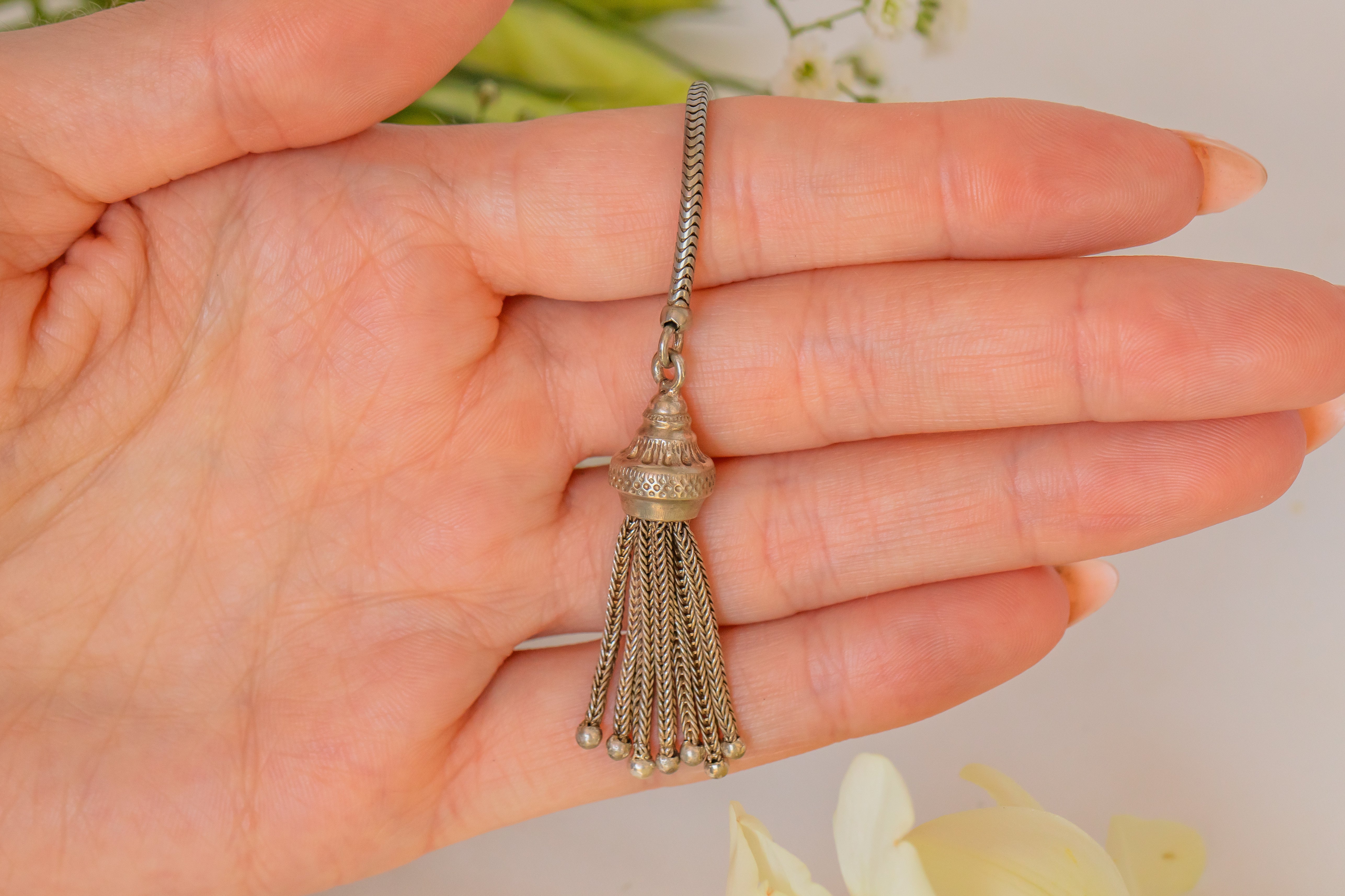 This Sterling Silver beauty boasts two of the Victorian's favourite features, a tassel and a dog clip! Wear with a Silver chain to have an extended pendant, or use the dog clip to attach some of your favourite charms.