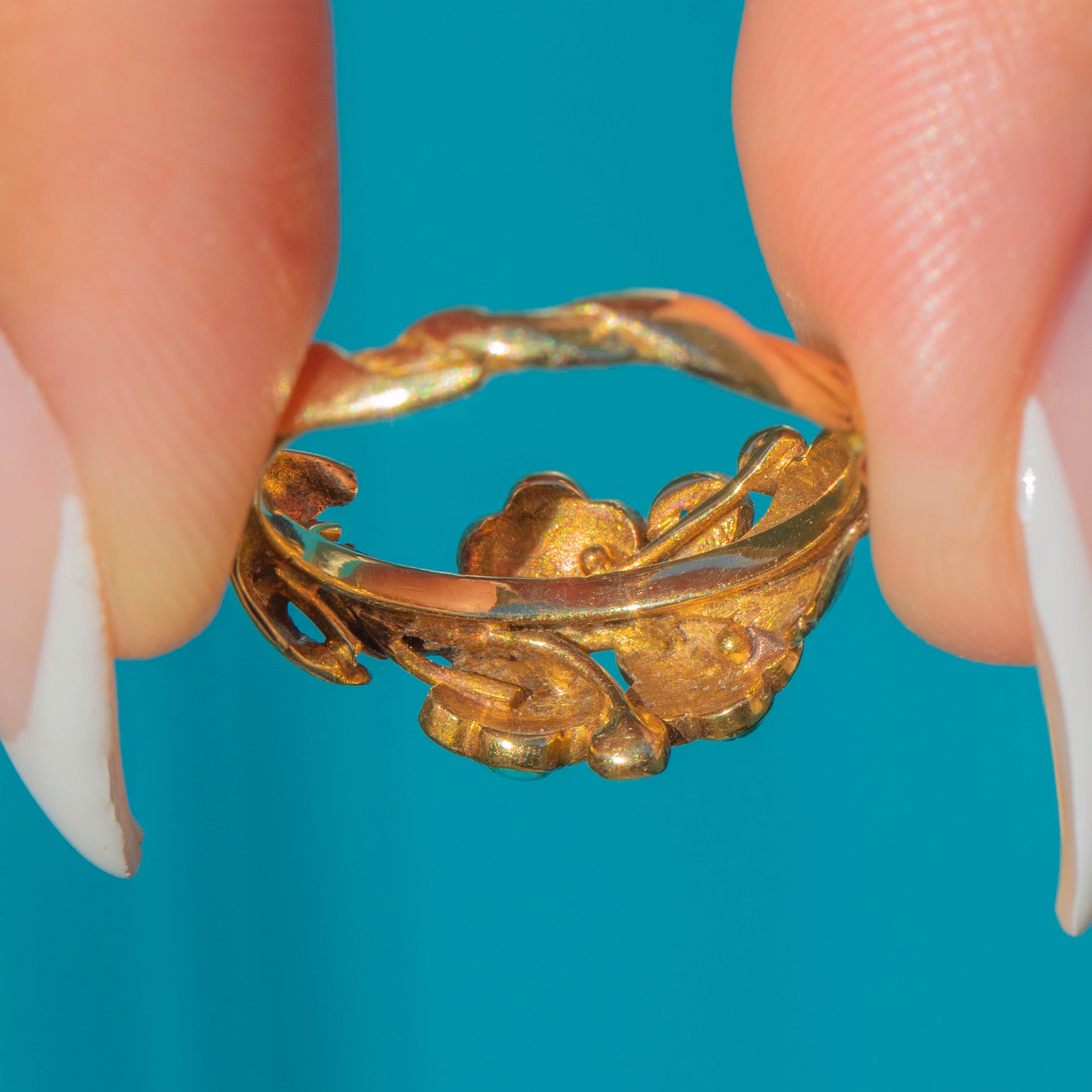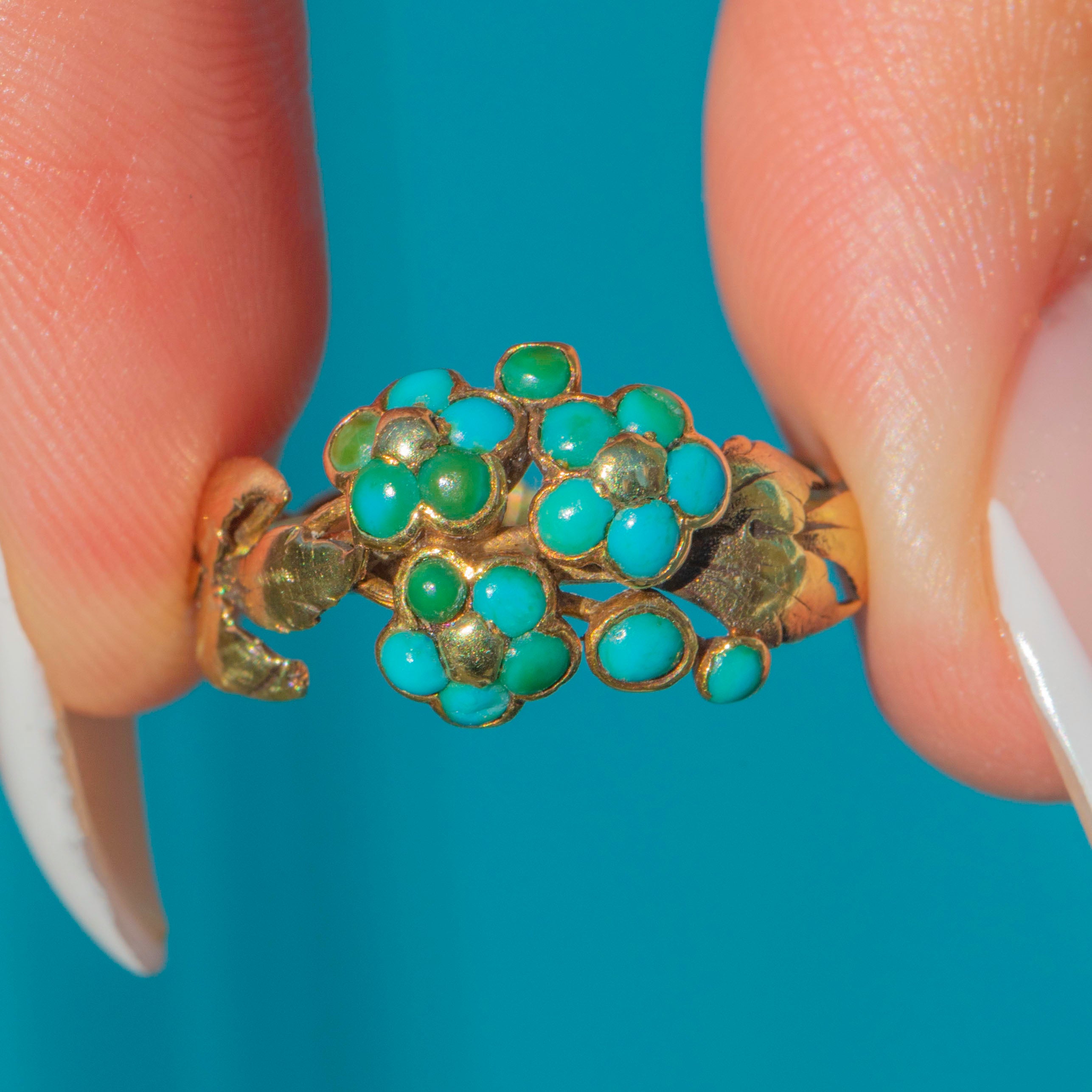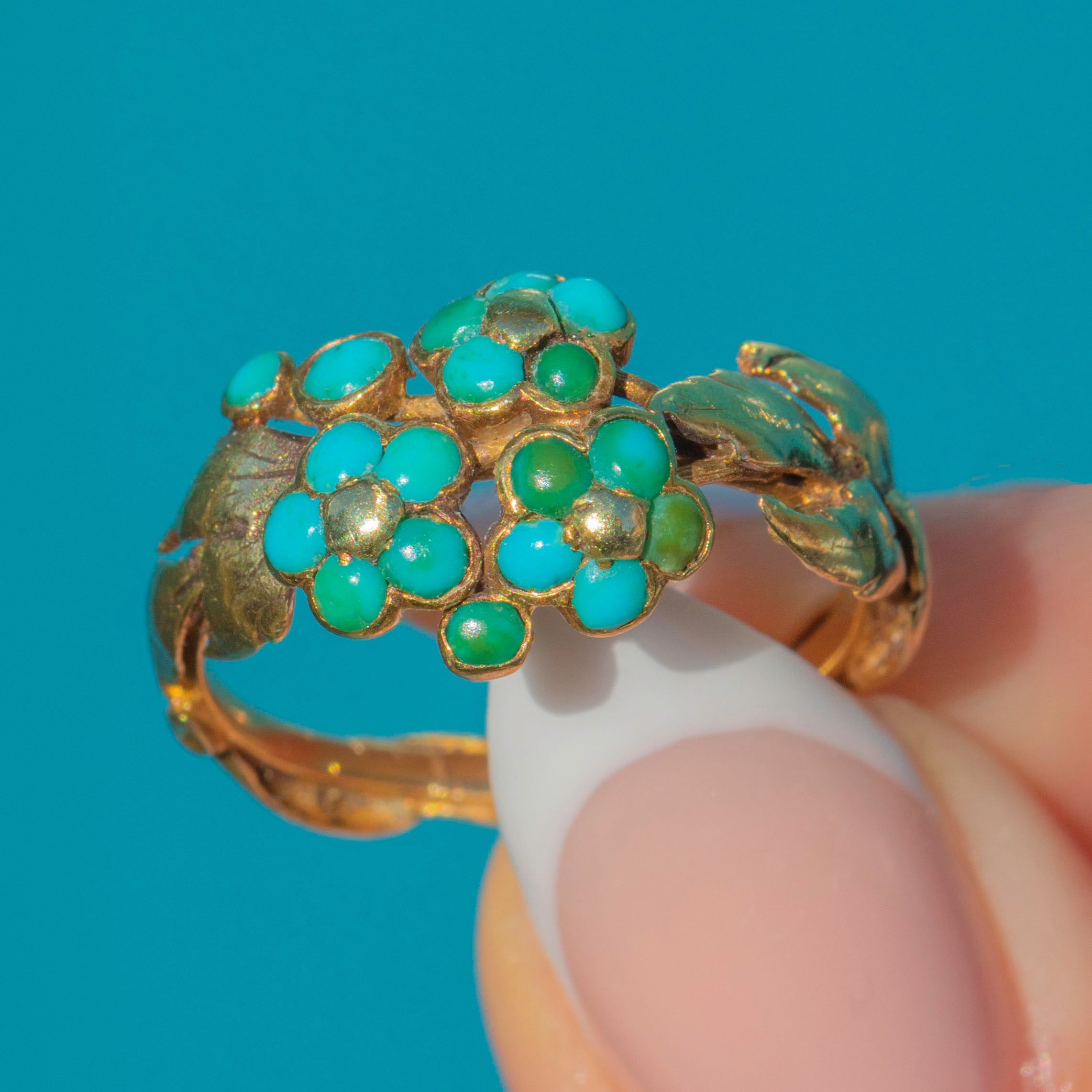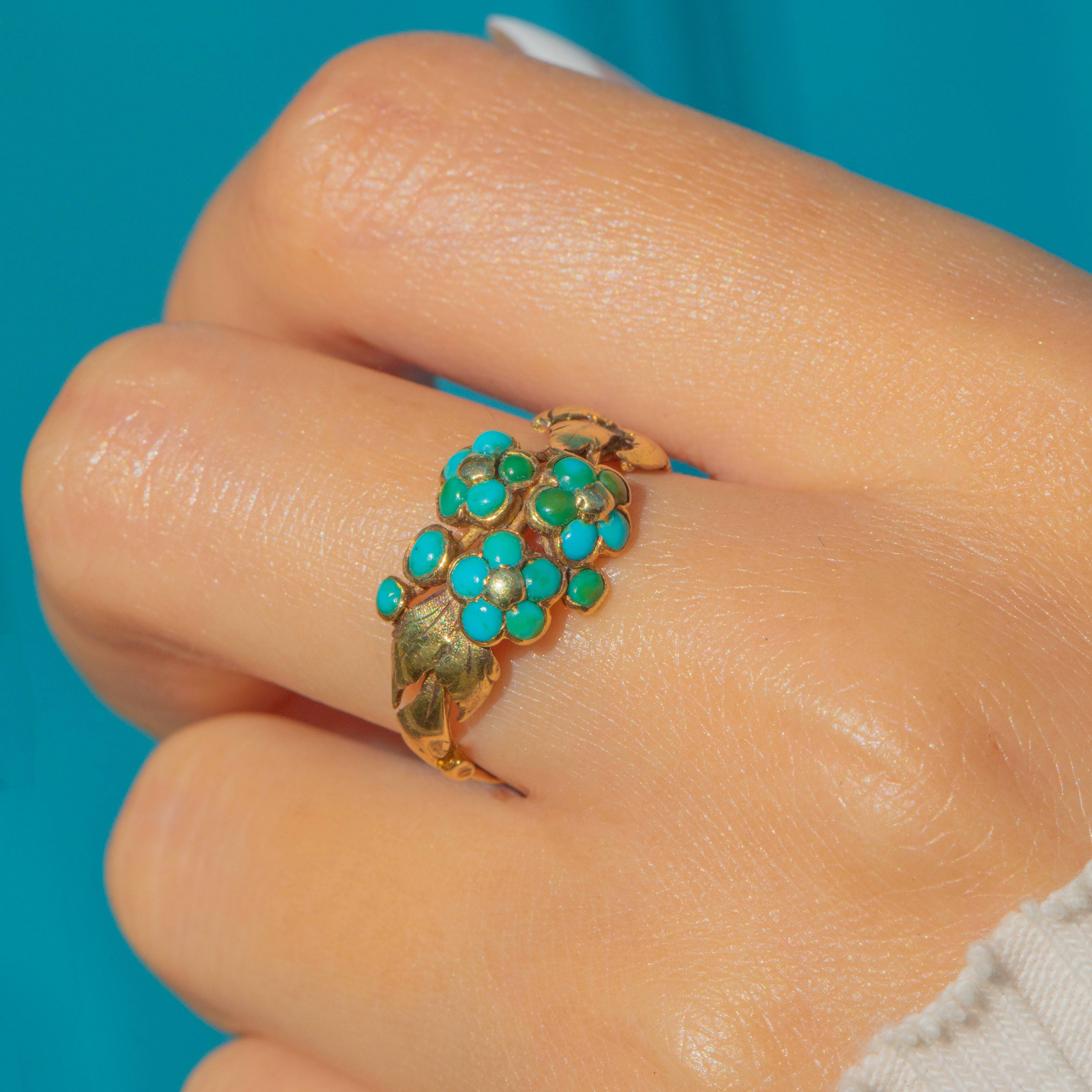 Forget-me-nots were a popular motif in the 19th century, representing enduring love and remembrance. Combined with the bright Turquoise, this ring captures the sentimentality and elegance of the Victorian era in a wonderfully wearable form.