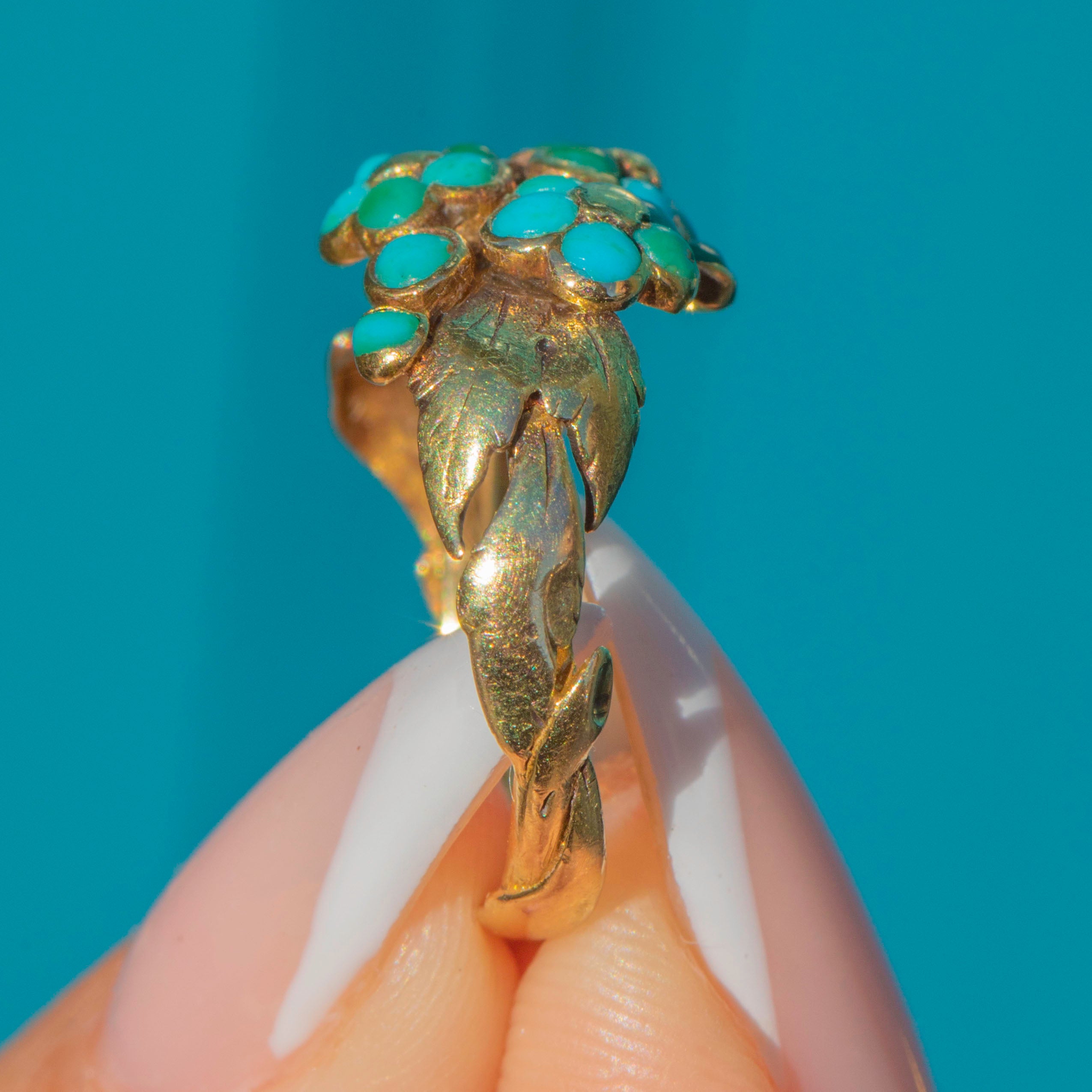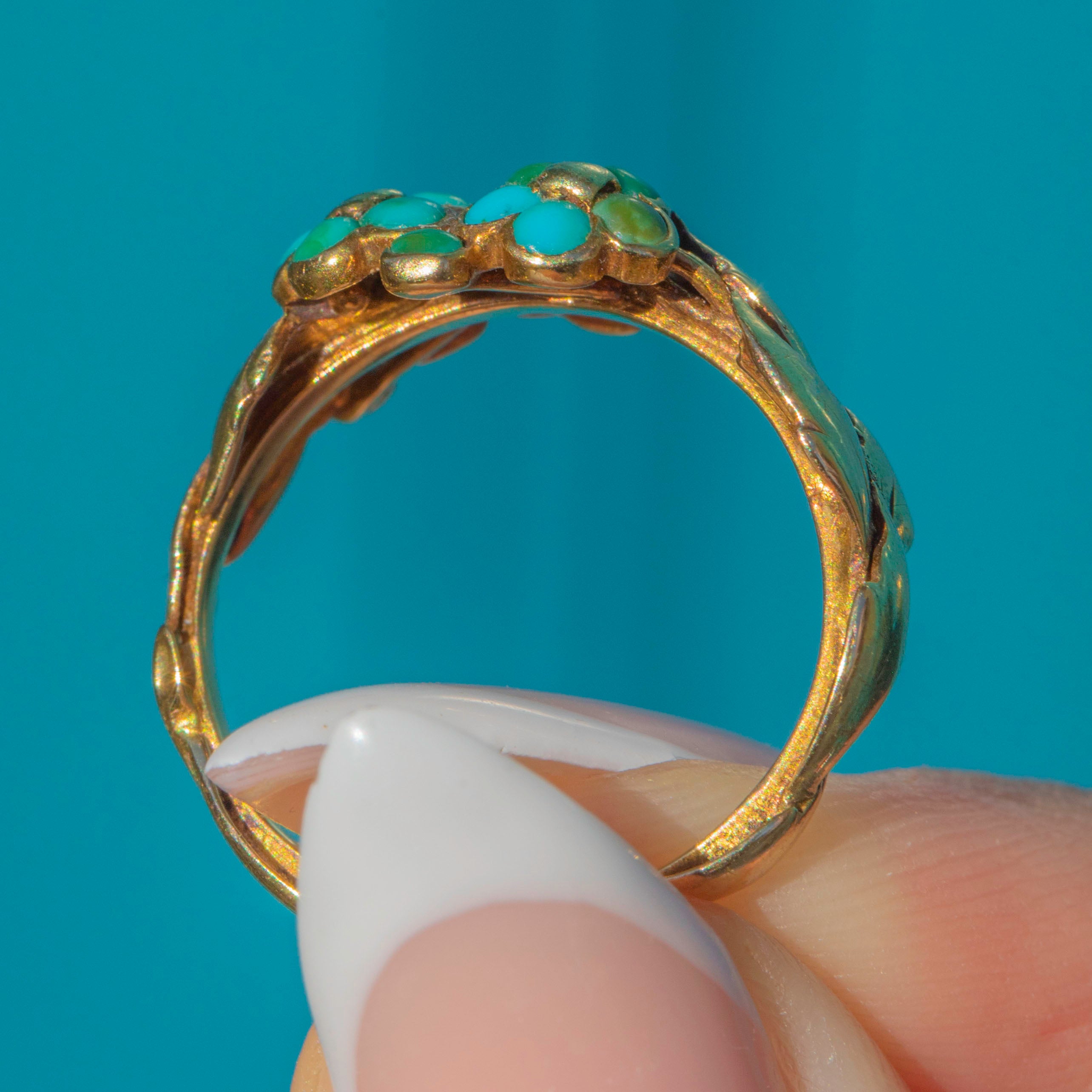 This exquisite Victorian ring is crafted in 18ct Gold and designed as a bouquet of forget-me-not flowers, each bloom set with vivid Turquoise cabochons. The naturalistic design continues around the shoulders with finely modelled leaves, creating a jewel that is both romantic and full of symbolic meaning.