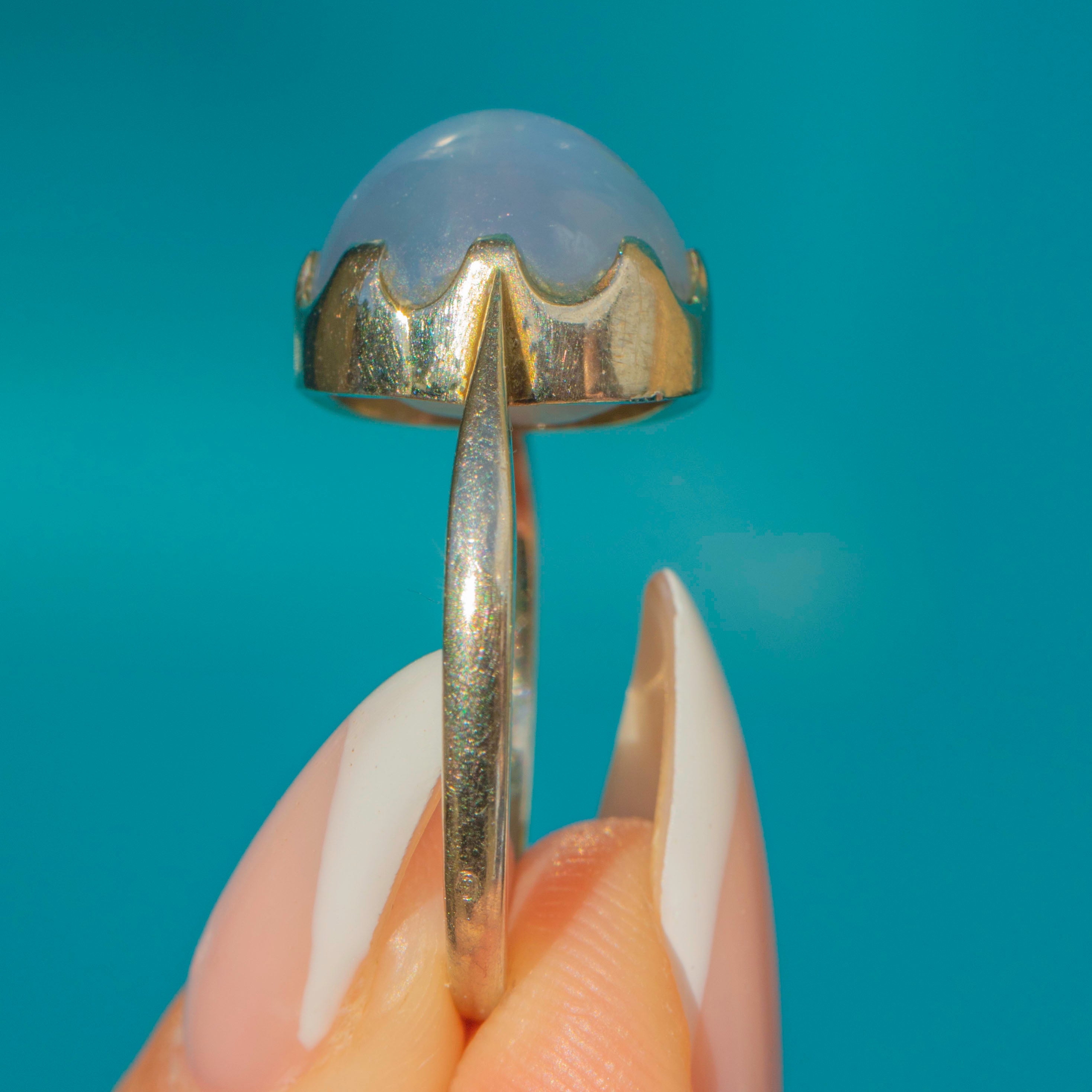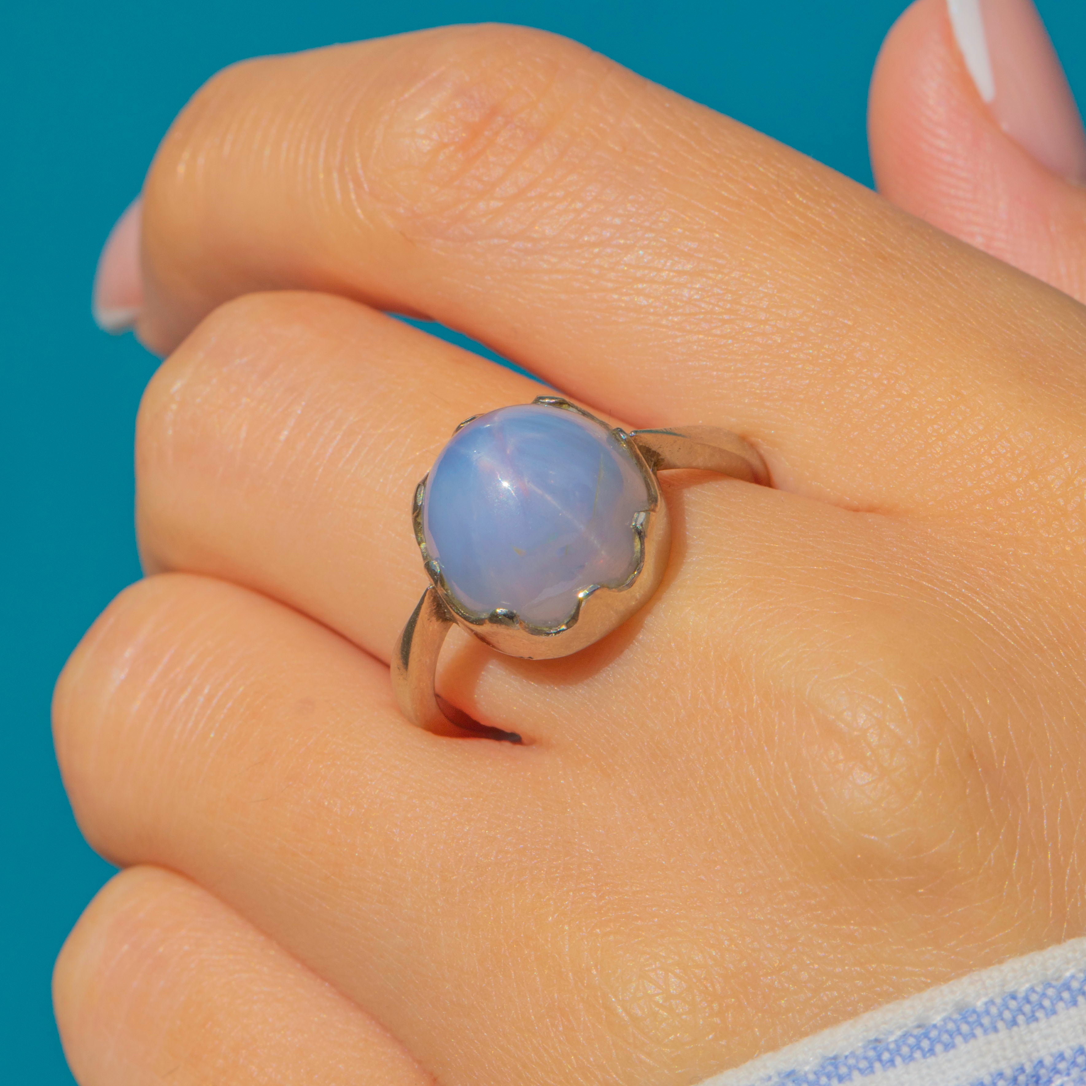 A glowing Vintage Star Sapphire ring in 14ct Gold. The high-domed cabochon shows a crisp six-rayed asterism that rolls beautifully across the stone in the light, framed by scalloped claws and a clean, minimal shank. Classic, wearable, and effortlessly striking.