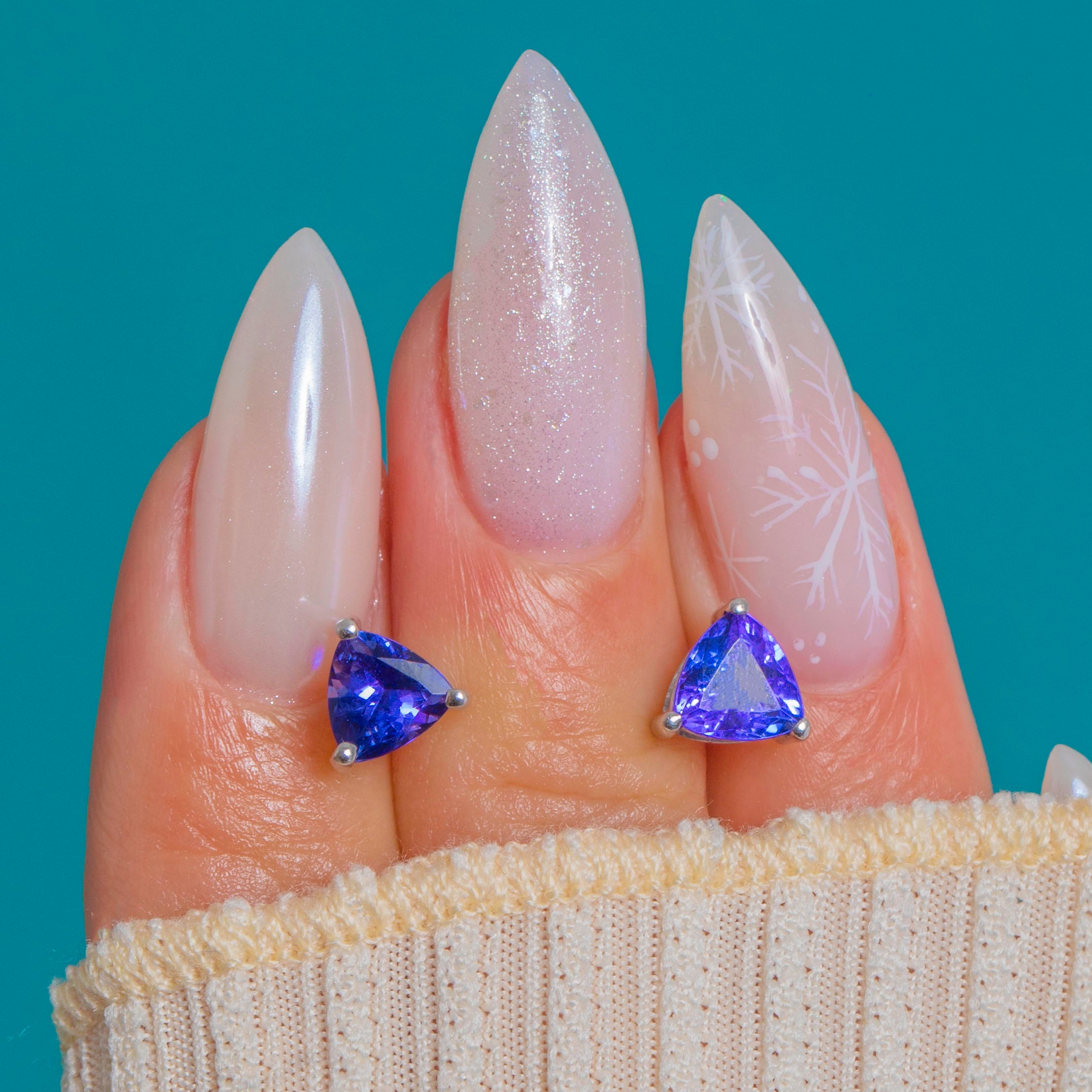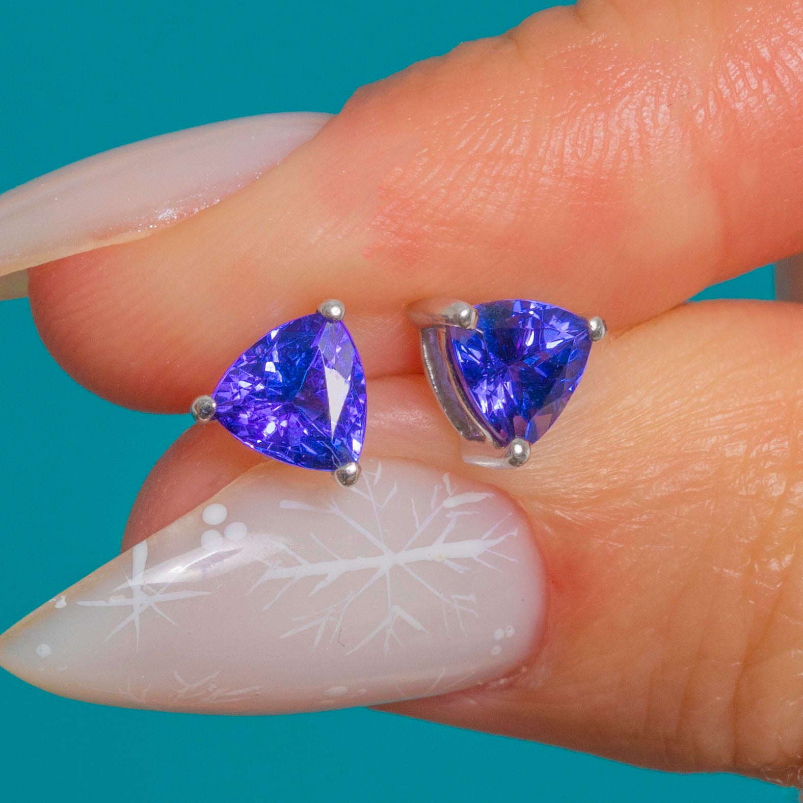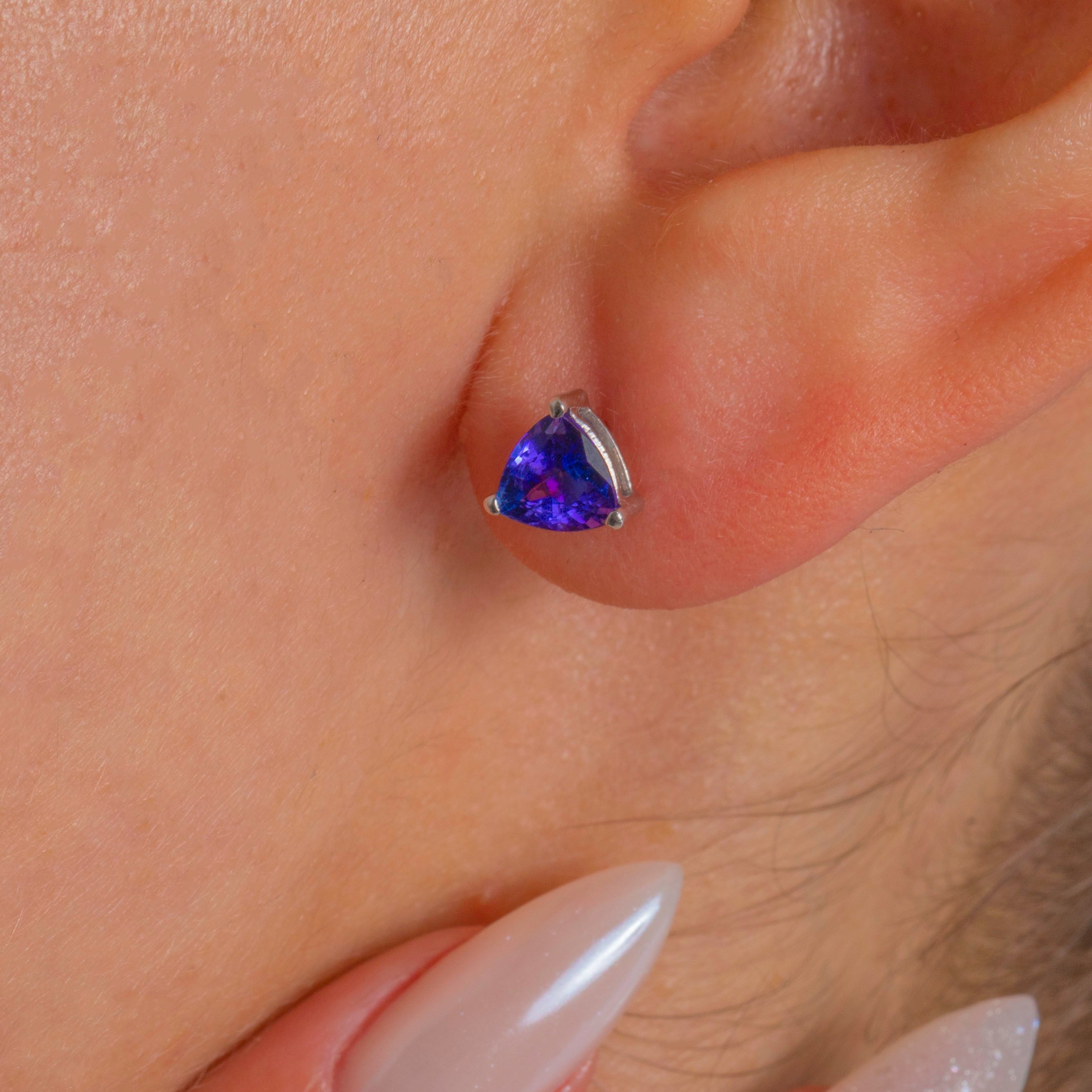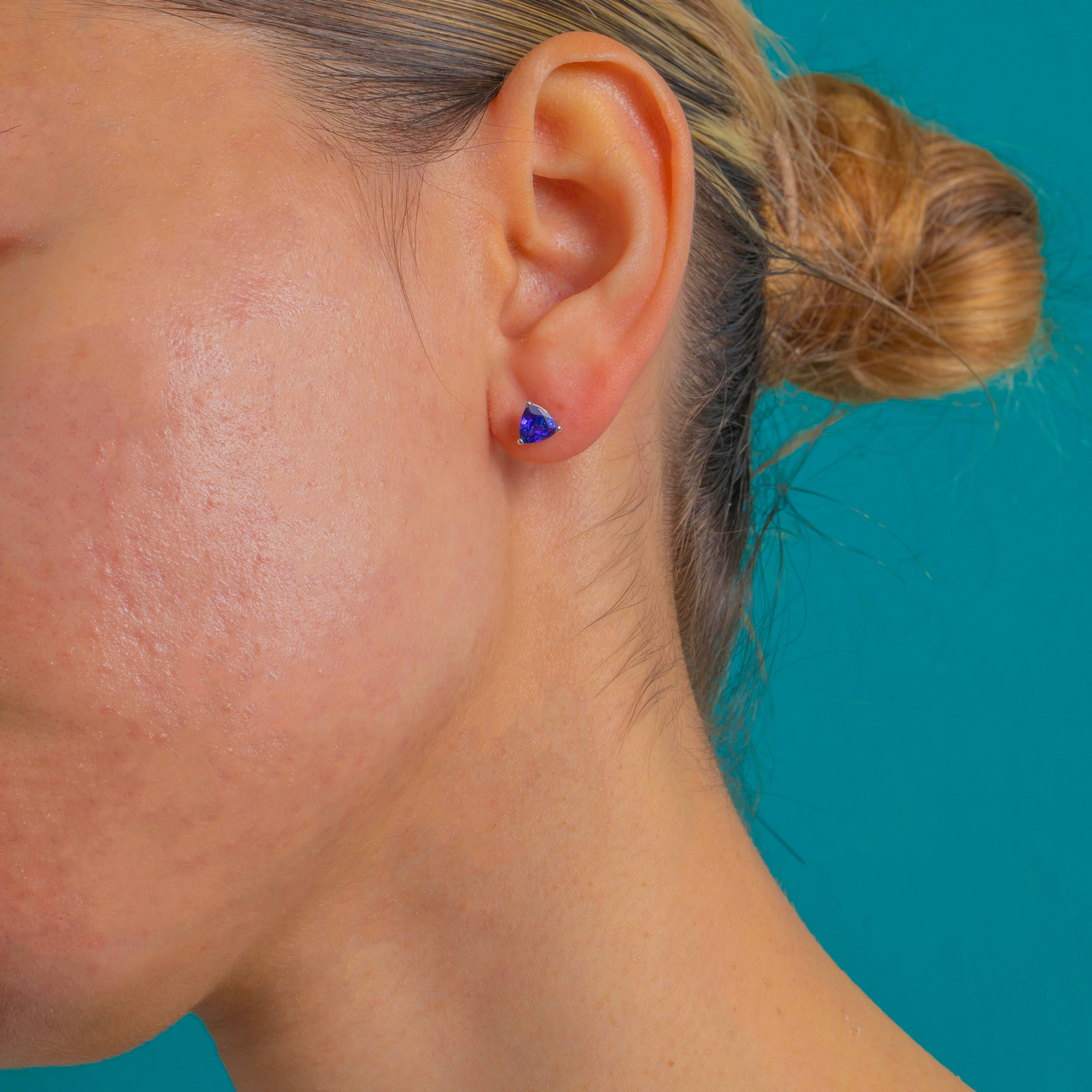 Sleek and saturated, these trilliant Tanzanite studs deliver an elegant pop of violet-blue in luminous 18ct White Gold. The minimalist three-claw trellis settings keep the profile low and crisp, allowing the triangular cuts to sparkle brilliantly from every angle.