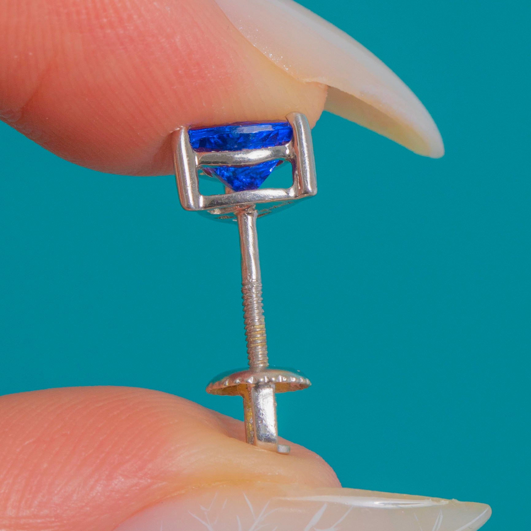 EXCELLENT: The Tanzanites are bright and lively with crisp facets and no obvious chips or abrasions. The 18ct White Gold settings are highly polished with even, secure claws; the threaded posts show only light, superficial wear. Screw backs fasten smoothly and securely with no visible repairs.