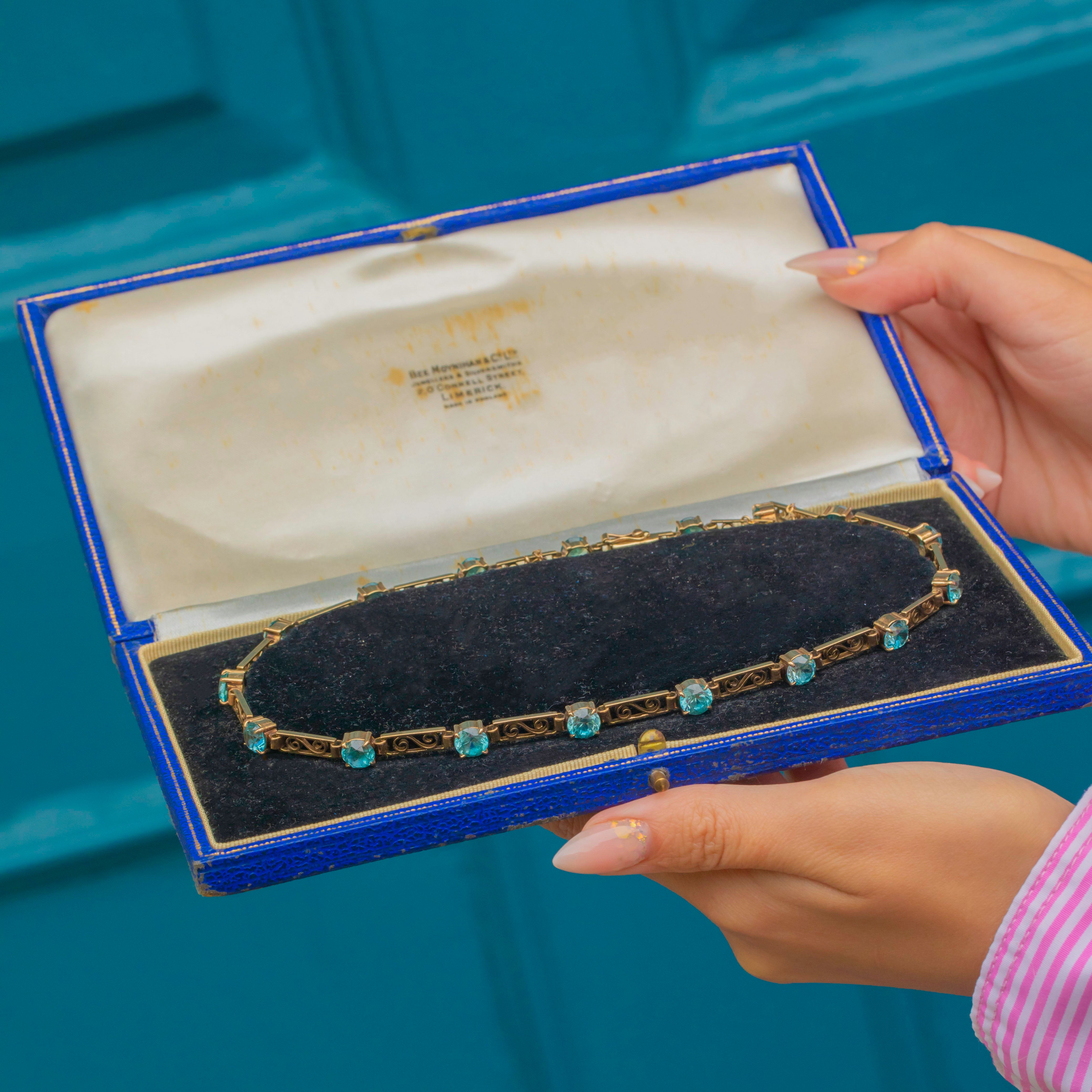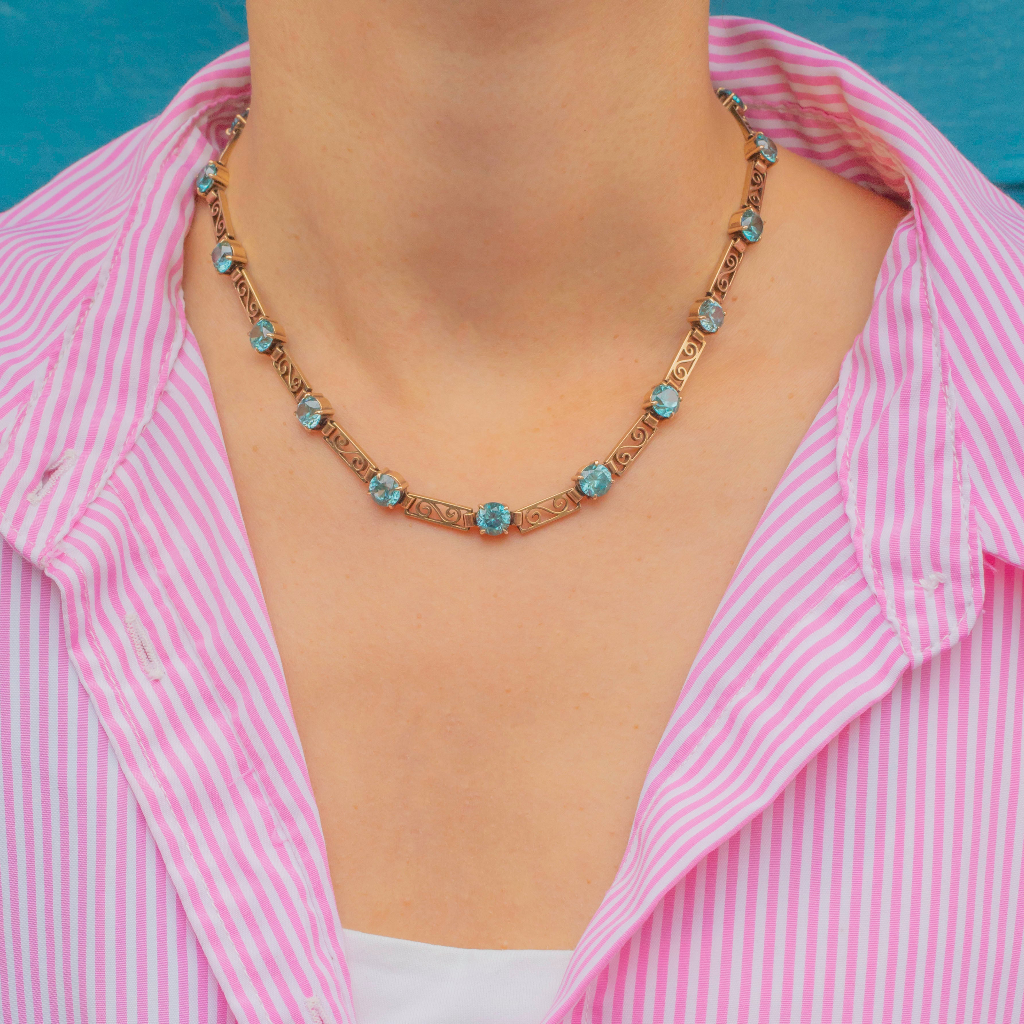 An exquisite Vintage collar necklace by renowned English goldsmiths Cropp & Farr, crafted in 9ct Gold and set with an impressive 11.05cts of vivid “Starlite” Blue Zircons. The solid bar links are designed with a bold architectural feel, softened by elegant S-curves within each link, creating a look that is both strong and feminine.