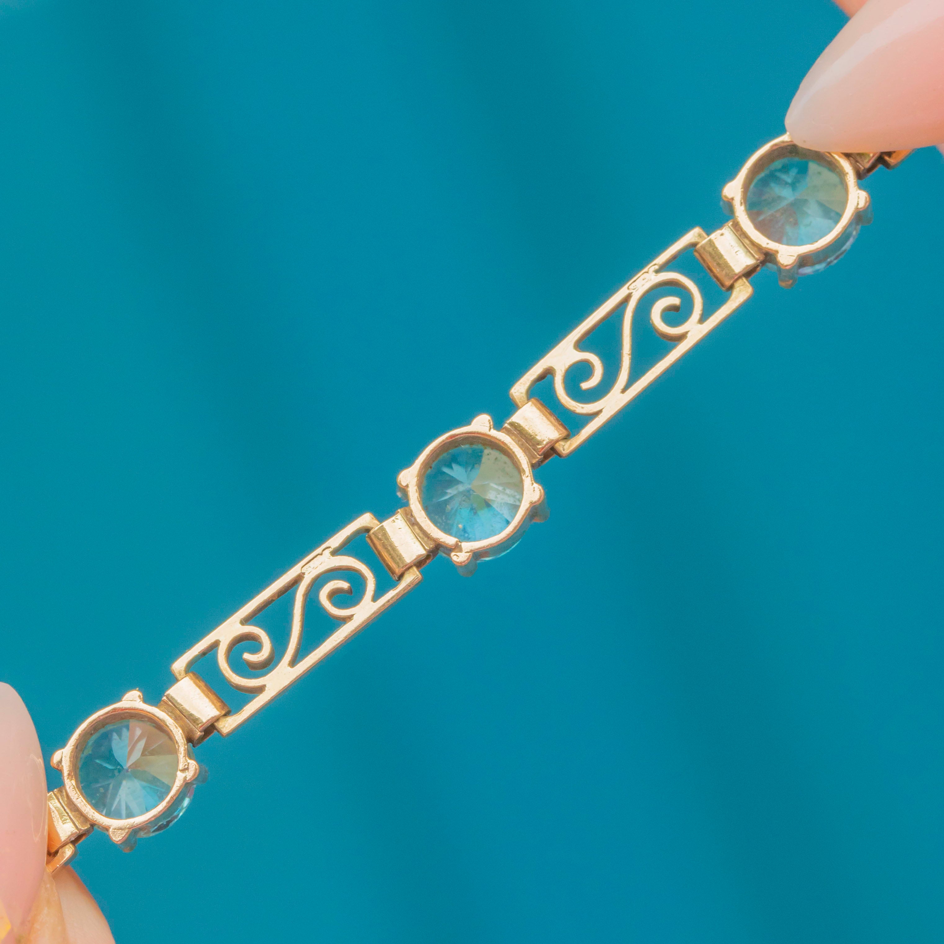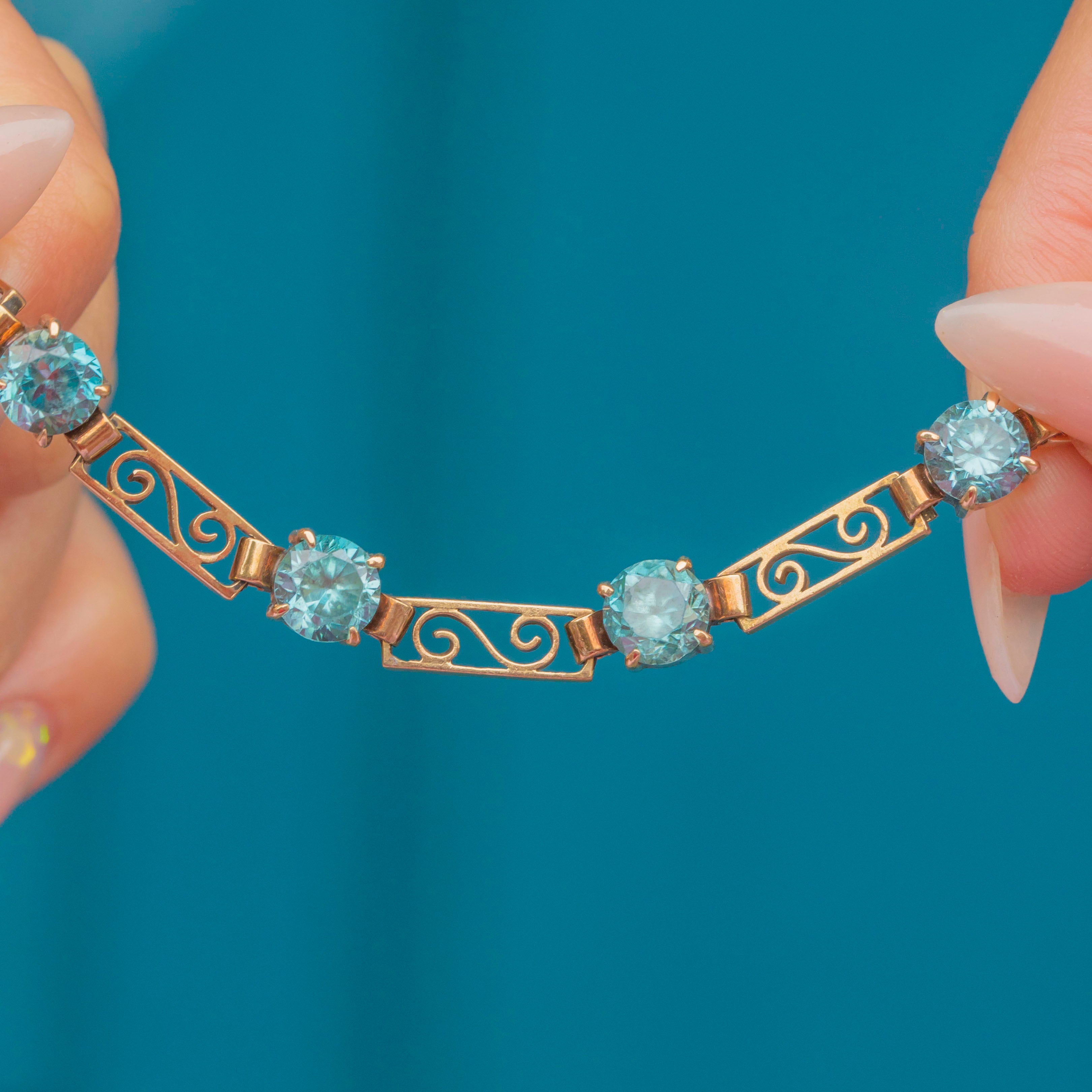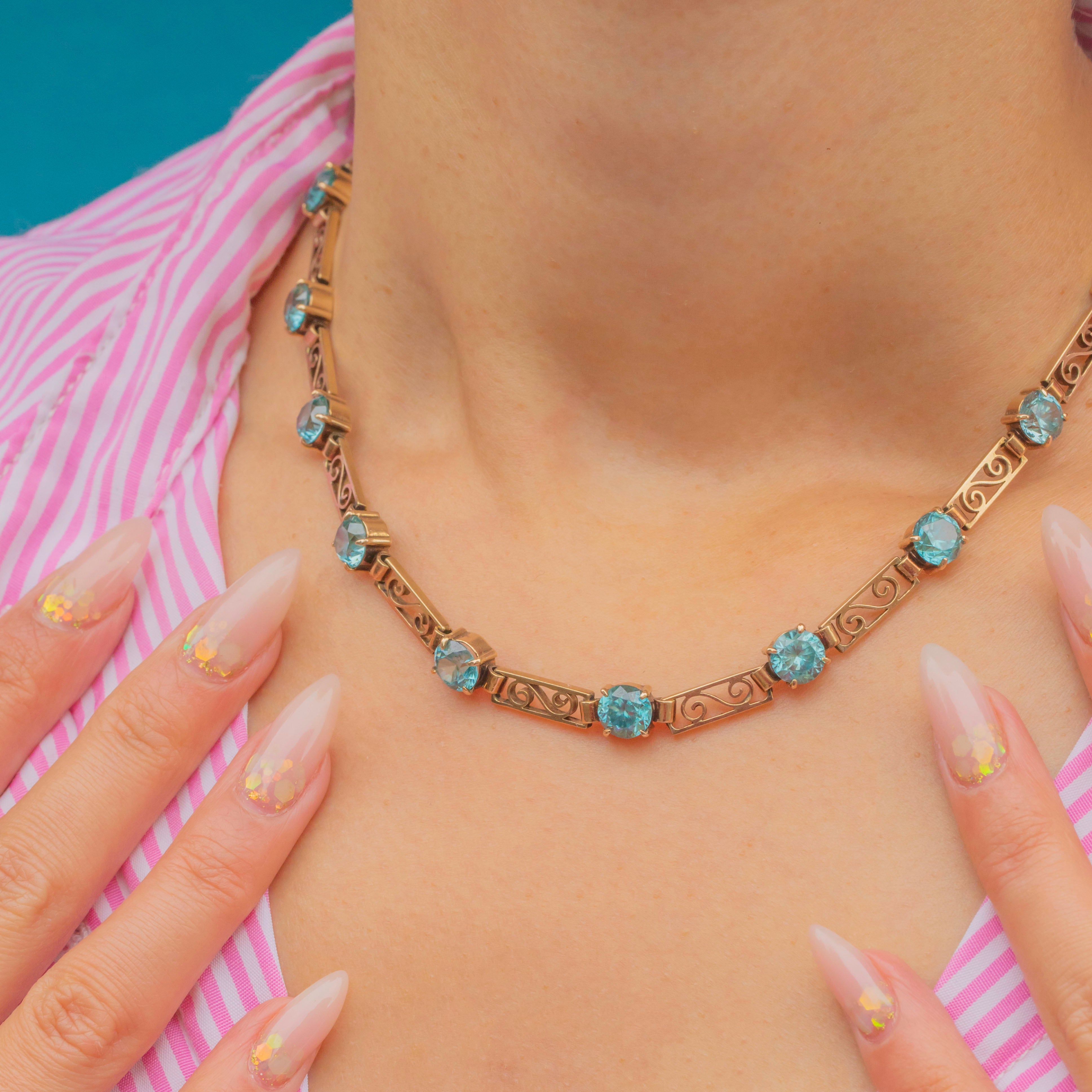 This beautifully made necklace sparkles with 17 round Zircons, each carefully claw-set to showcase their bright teal-blue colour and brilliance. Complete with a secure clasp and safety chain, it’s a statement piece of post-war British design and craftsmanship.