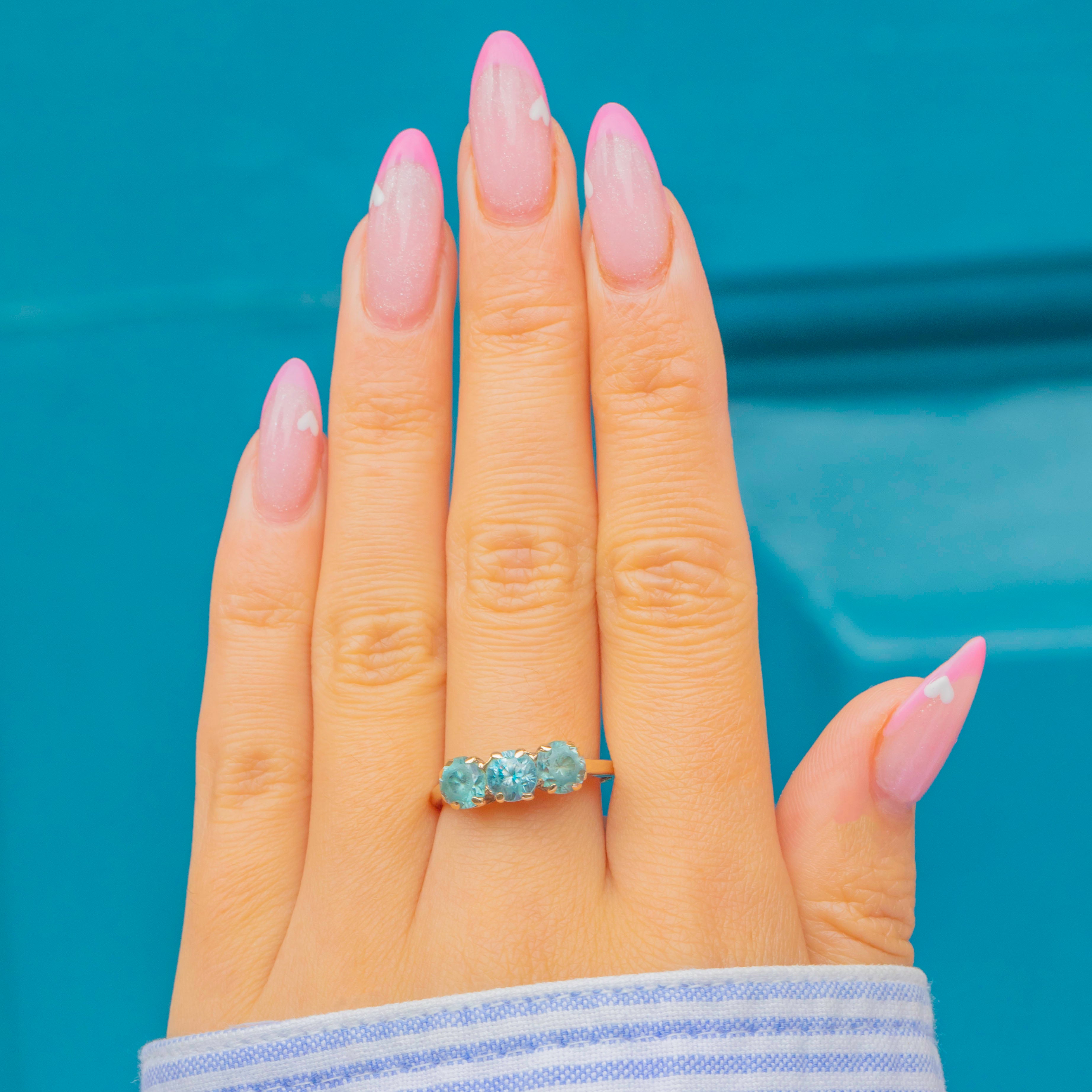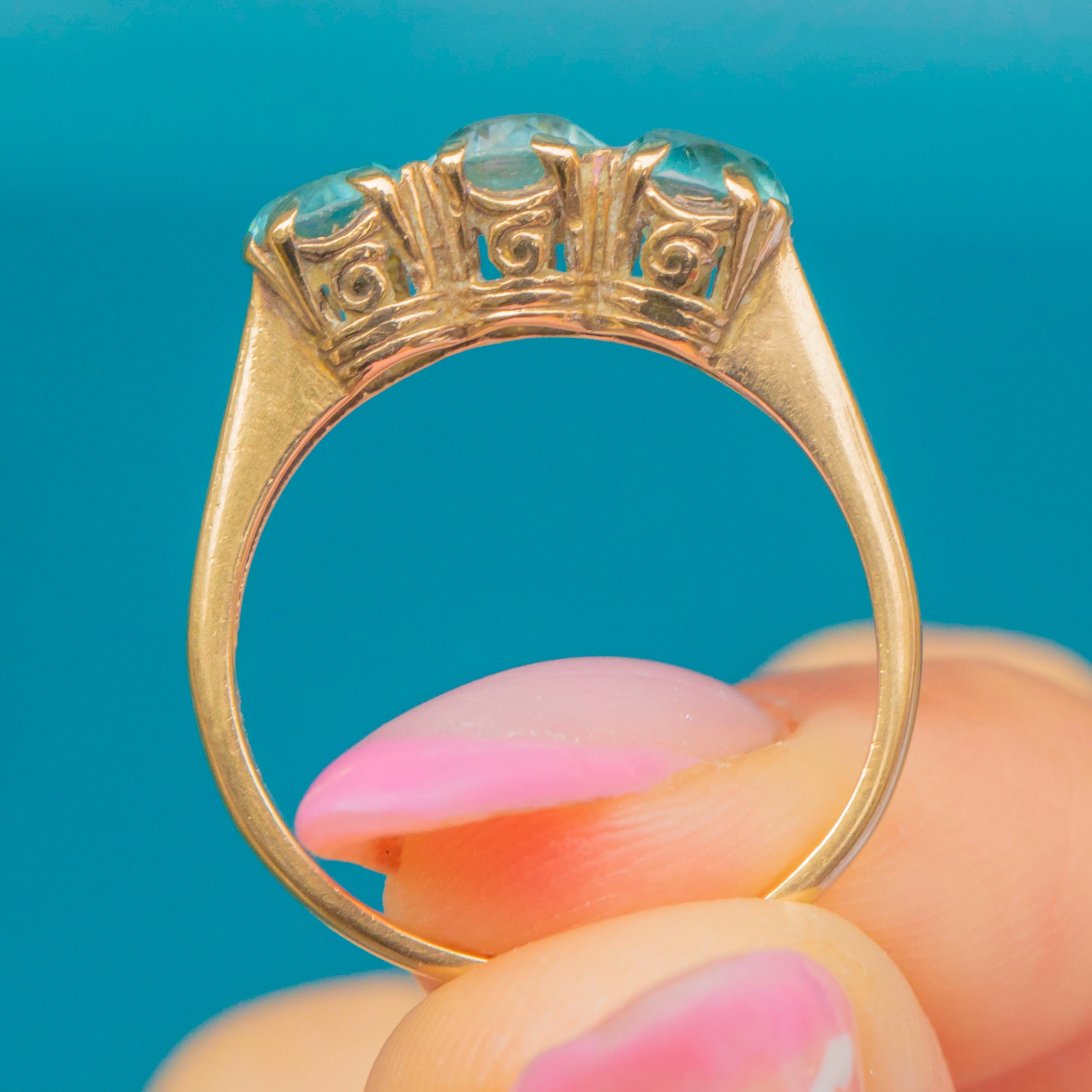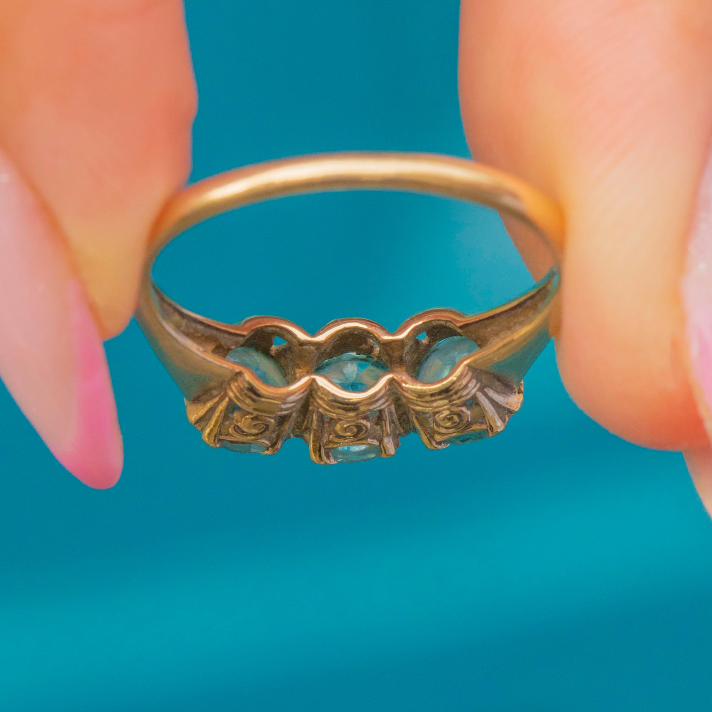 This charming Vintage trilogy ring showcases three vivid Blue Zircons, their bright turquoise hue sparkling beautifully in the light. Crafted in 9ct Yellow Gold, the stones are held in elegant claw settings with a pretty swirled open gallery beneath, a classic mid-century design still popular in the early 1970s.