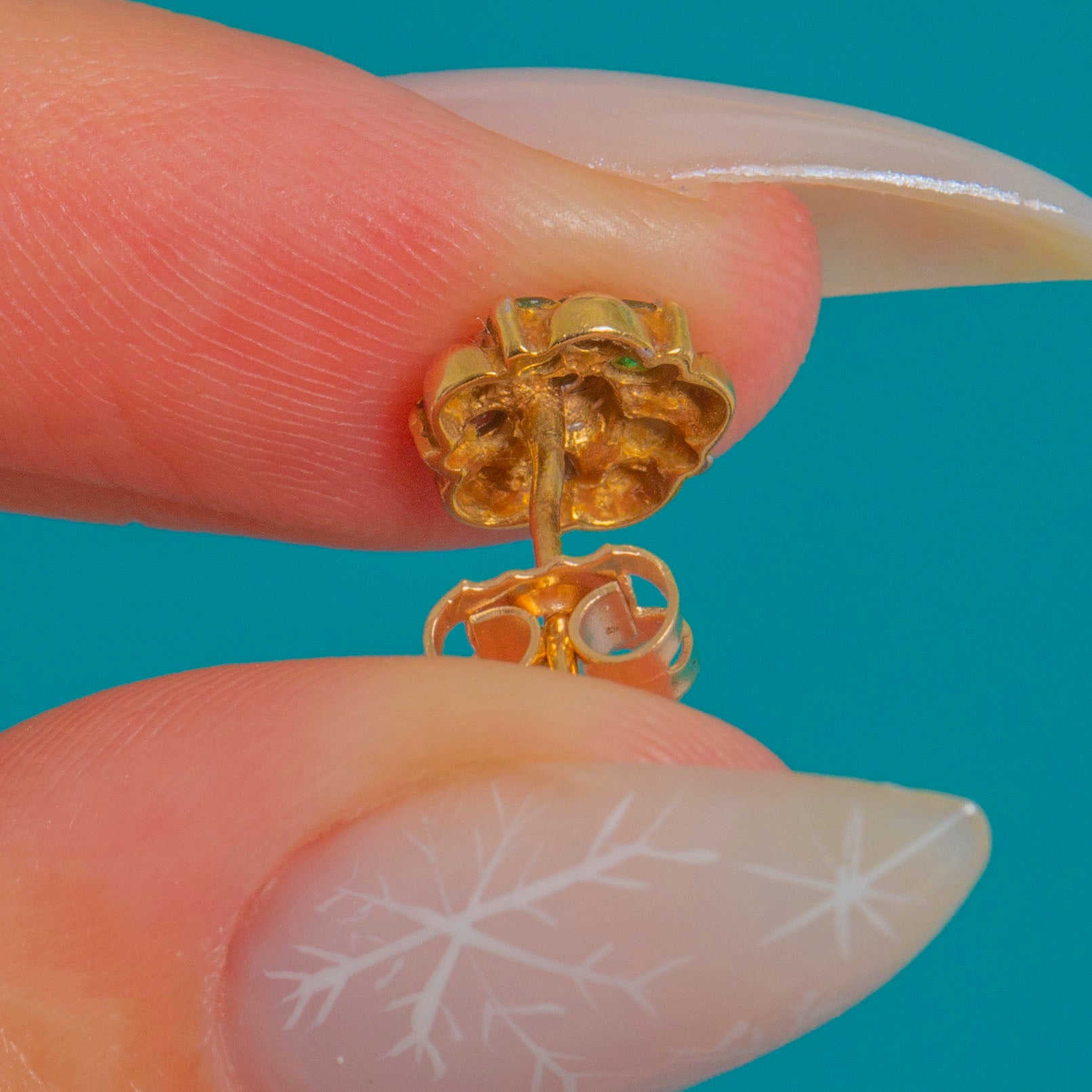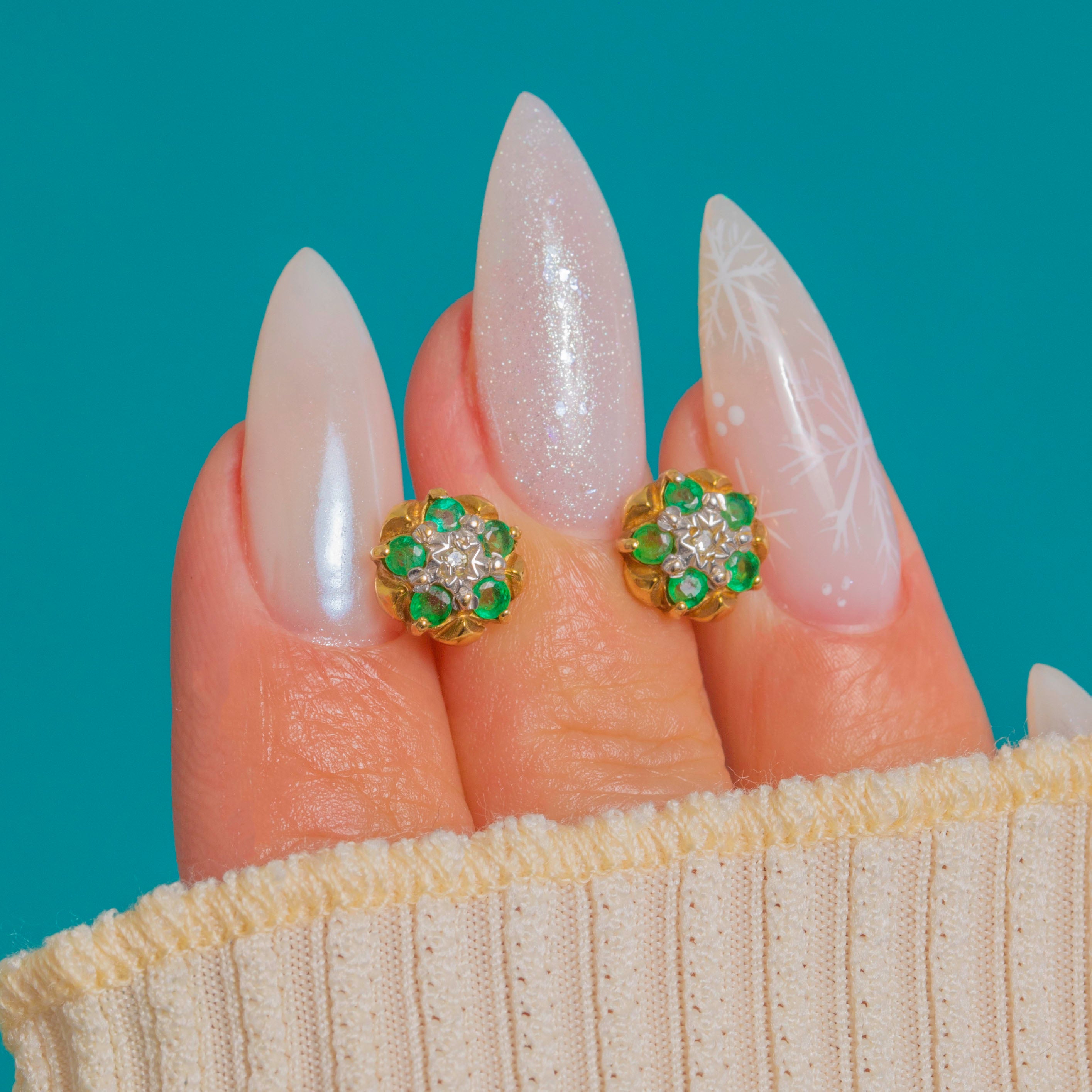 Petite and perfectly formed, these Vintage 9ct Gold buttercup cluster studs bloom with six vivid round Emeralds circling a bright white central Diamond. The scalloped petal rim and two‑tone look lend a fresh, uplifting sparkle, while the rosette silhouette feels timeless and feminine.