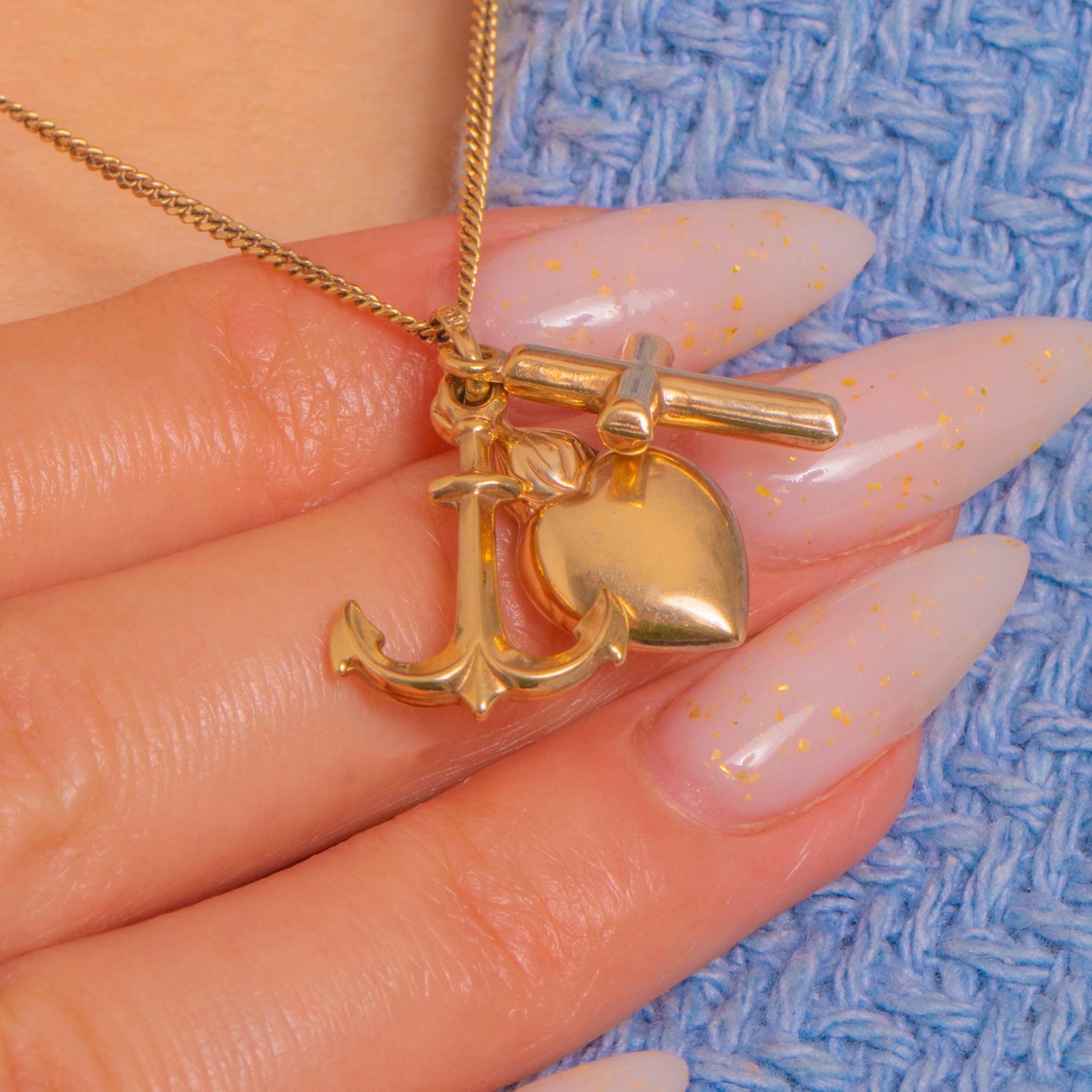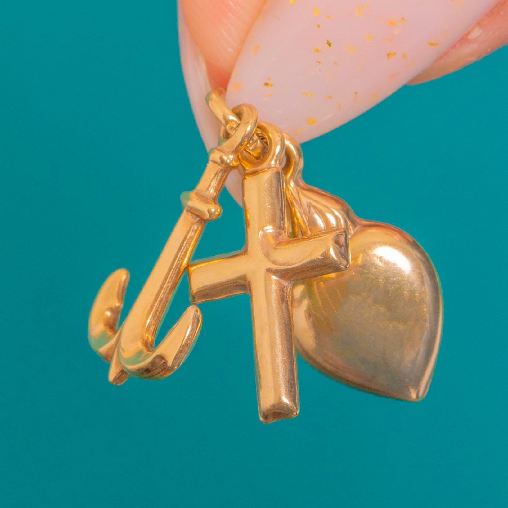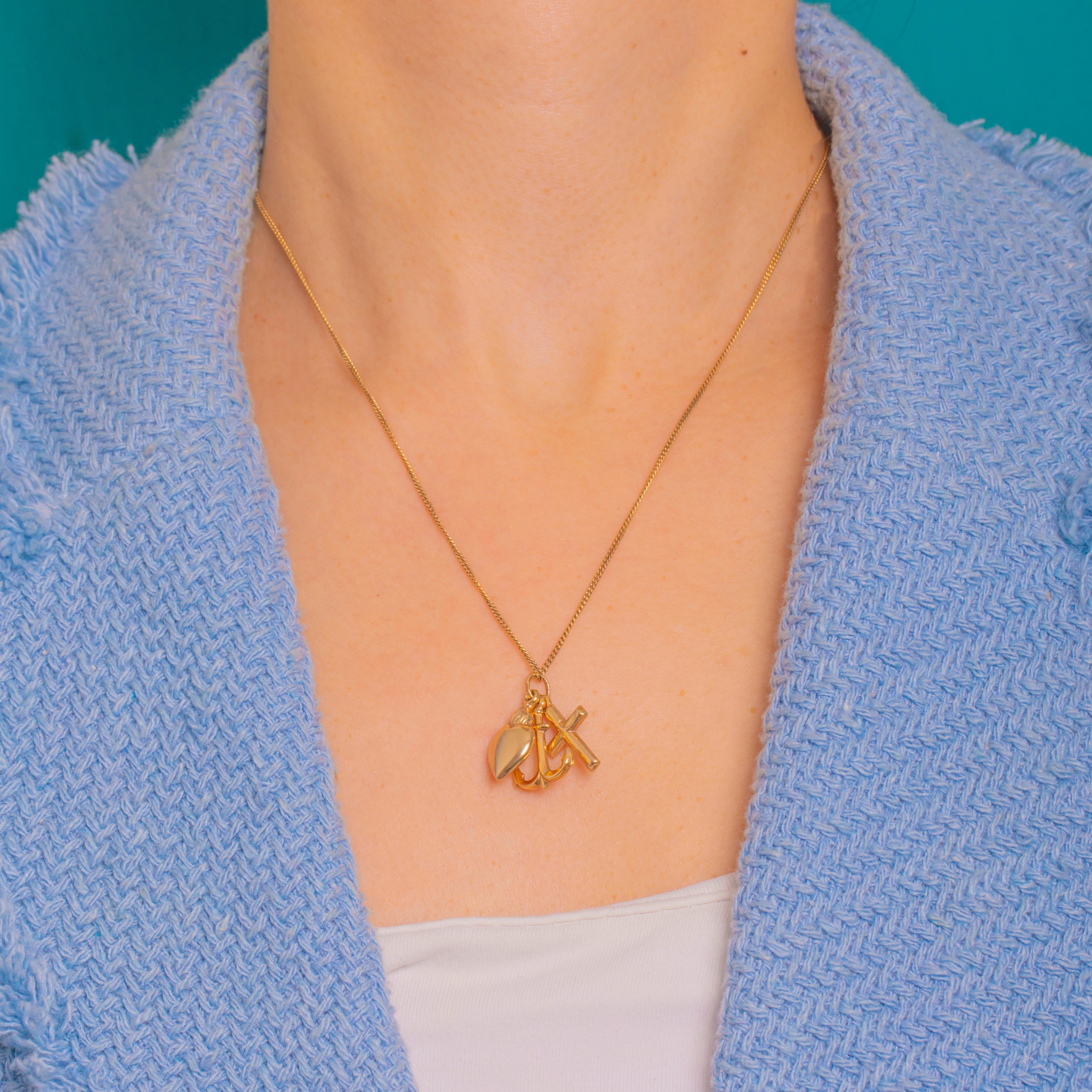 A sweet Faith, Hope & Charity charm pendant in 9ct Gold, this petite cluster brings together an anchor, a rounded Latin cross and a puffed heart for timeless sentiment in a sleek, minimalist form. Each charm gleams with a high polish, gathered on a shared jump ring for effortless movement and shine.