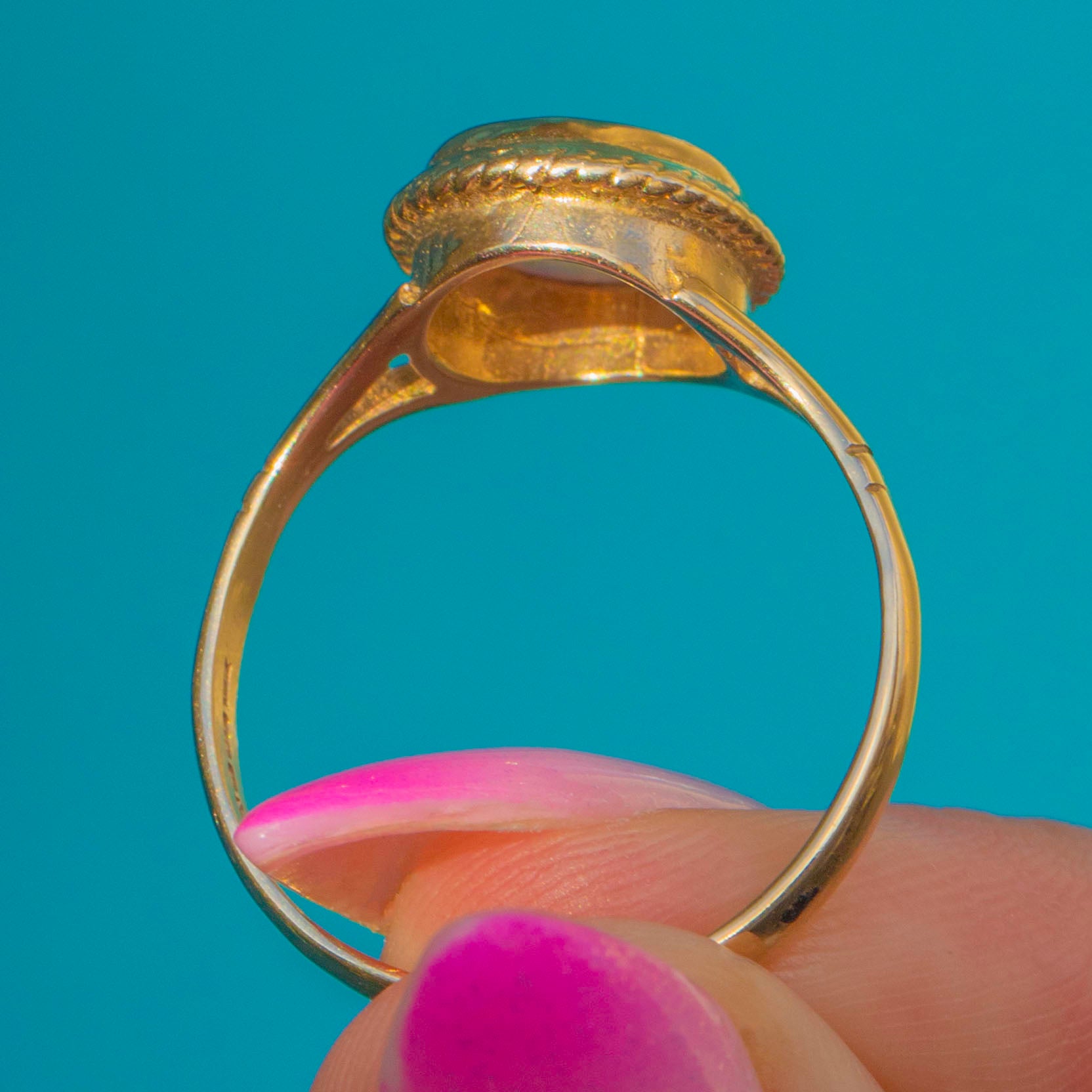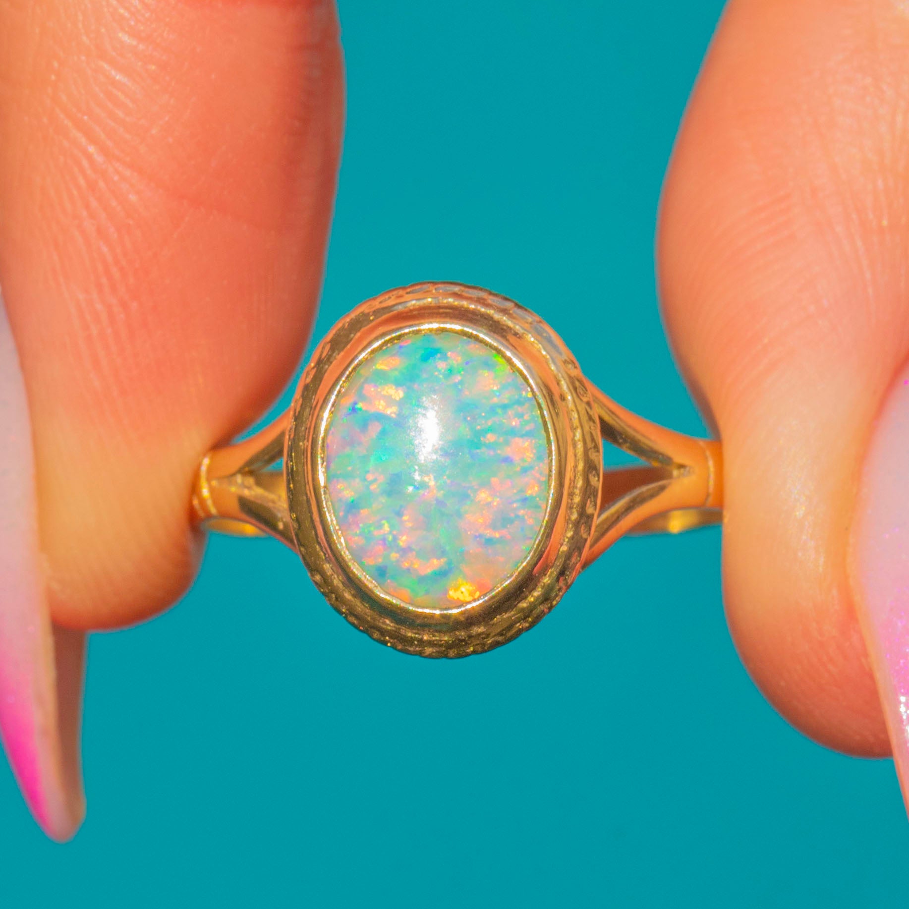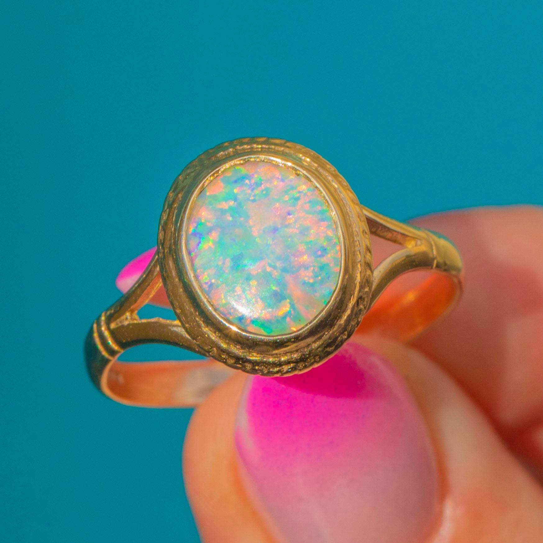 A dreamy Vintage 9ct Gold Opal ring, hallmarked for 1999, with an oval cabochon that shimmers with electric blues and greens lit by pink and orange flashes. The Opal is hugged by a smooth bezel framed with a delicate milled/rope detail, drawing the eye to the stone’s radiant play-of-colour.