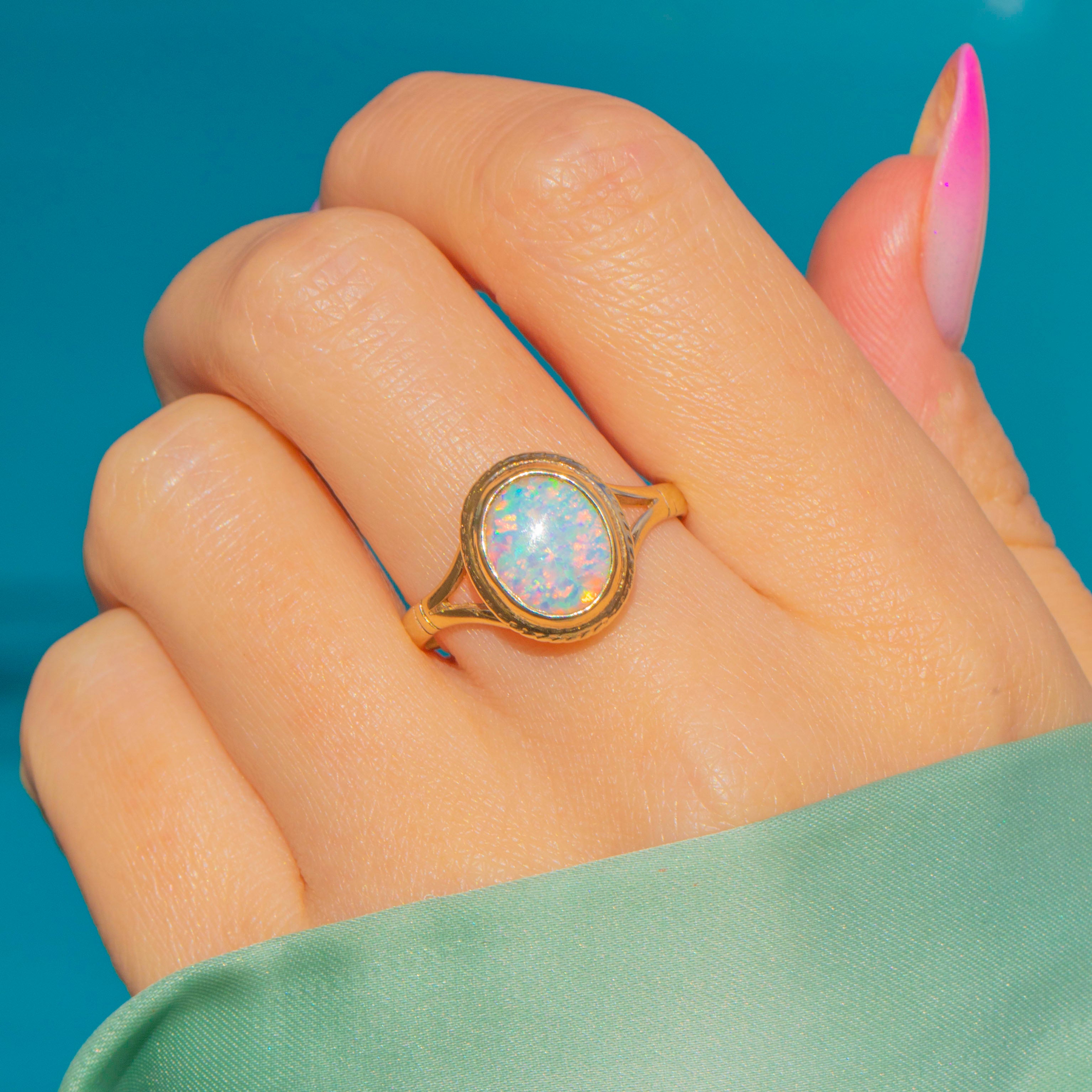 VERY GOOD: The Opal is bright and secure with no visible chips or cracks, showing vibrant play-of-colour. The Gold displays light surface wear and tiny nicks to the bezel edge with a gentle patina in the galleries, consistent with age. A subtle line on the shank suggests a past resize; the ring is stable and ready to wear.
