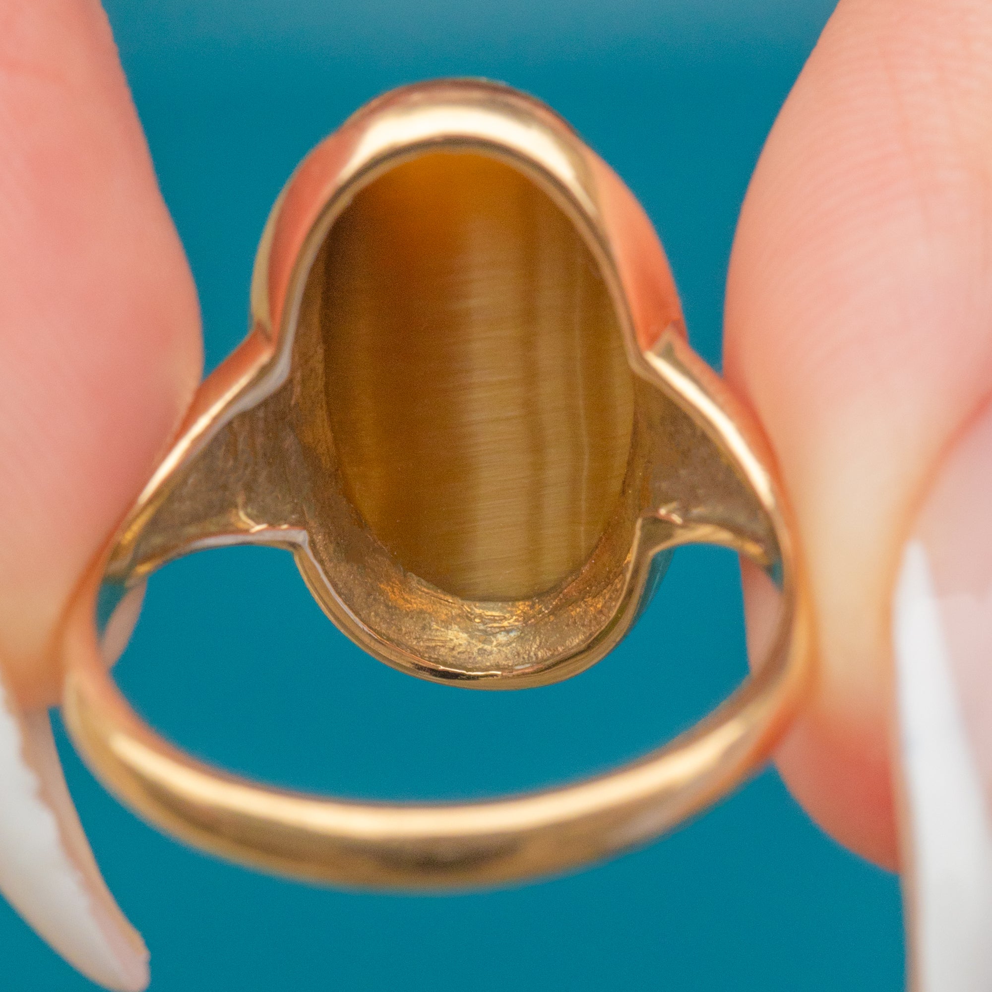 EXCELLENT. The Tiger’s Eye is smooth and glossy with no damage. The Gold band retains its bright finish with minimal wear. Hallmarks are clear and legible.