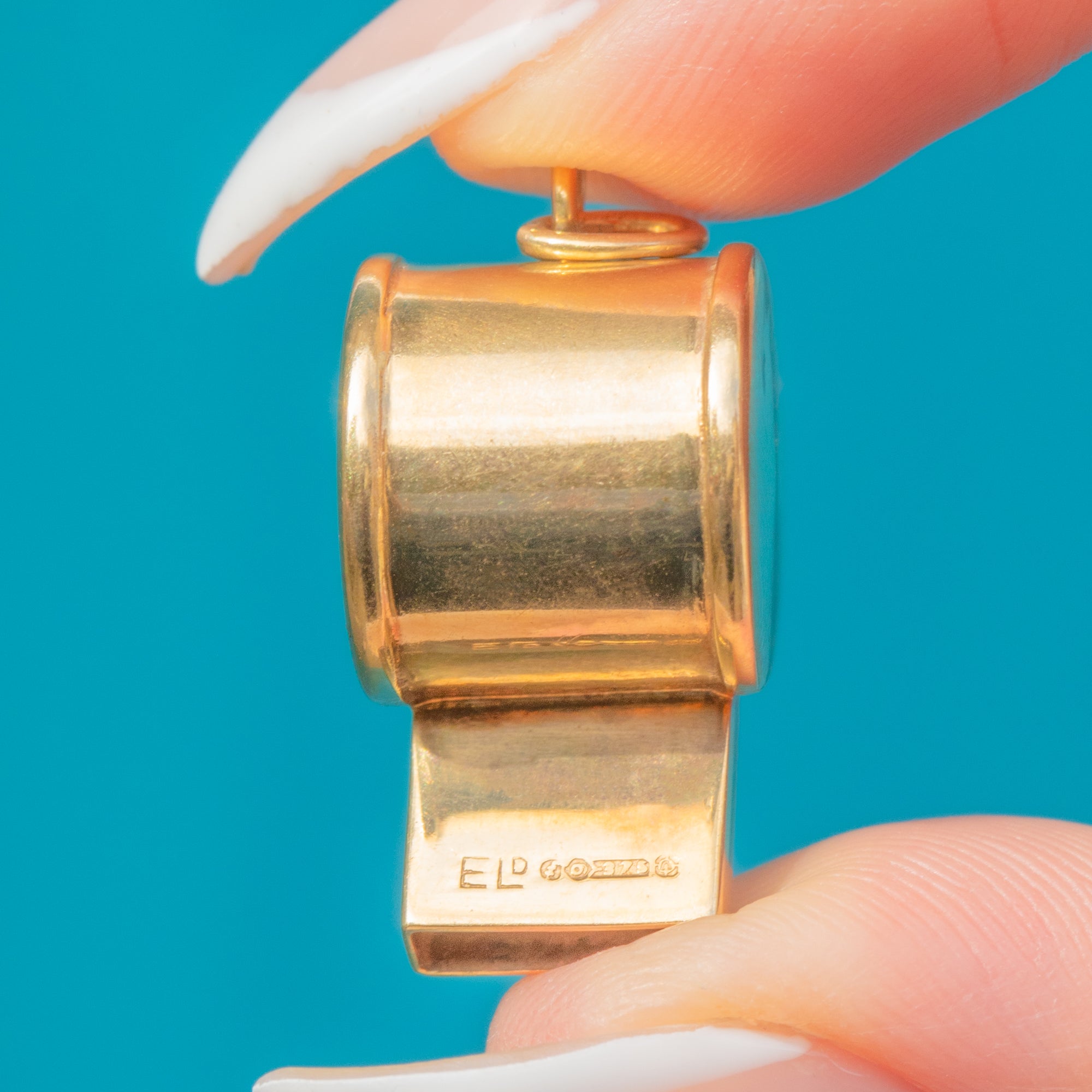 This charming Vintage 9ct Gold whistle pendant will make a playful and luxurious addition to any charm collection. Crafted in solid 9ct Gold and stamped “375” with the maker’s mark “EL”, it has a lovely warm Yellow tone and a satisfying little presence on the chain.
