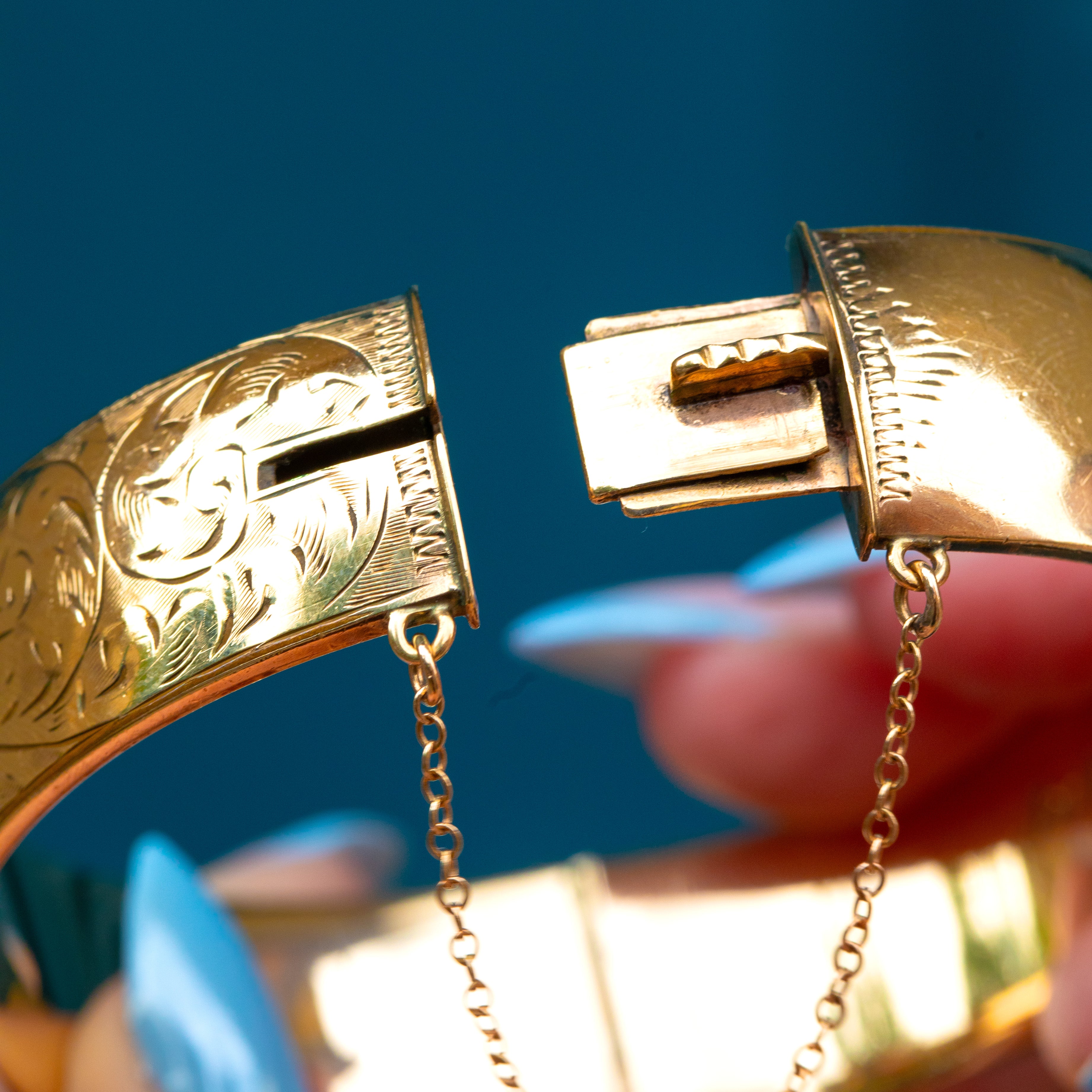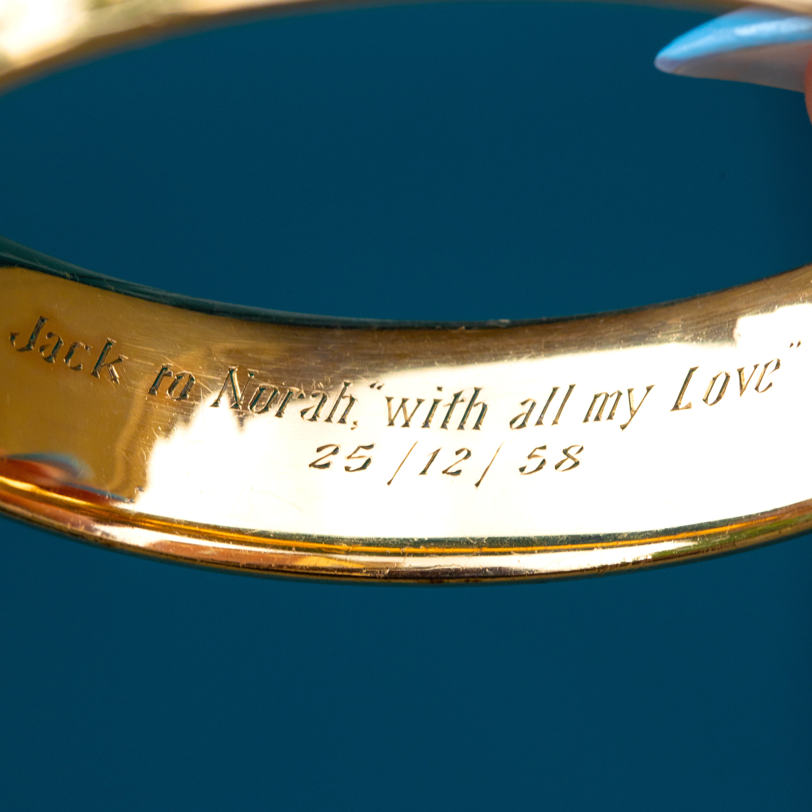 EXCELLENT. The engravings are crisp, and the bangle closes securely and has a safety chain for added security. There is minimal surface wear at the back of the bangle, commensurate with age. The inside of the bangle has been engraved to commemorate a special day in 1958!